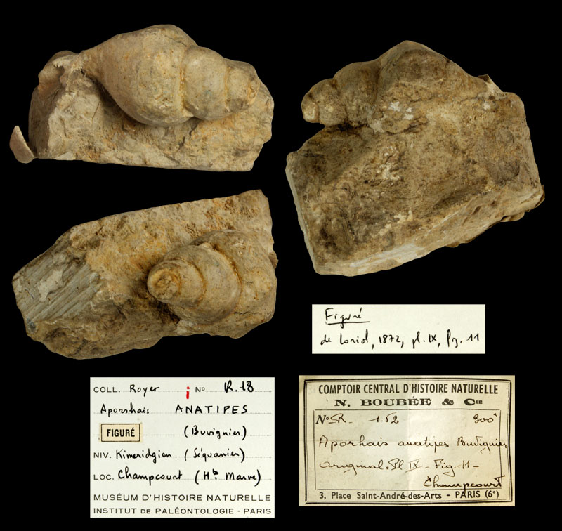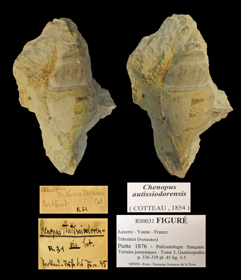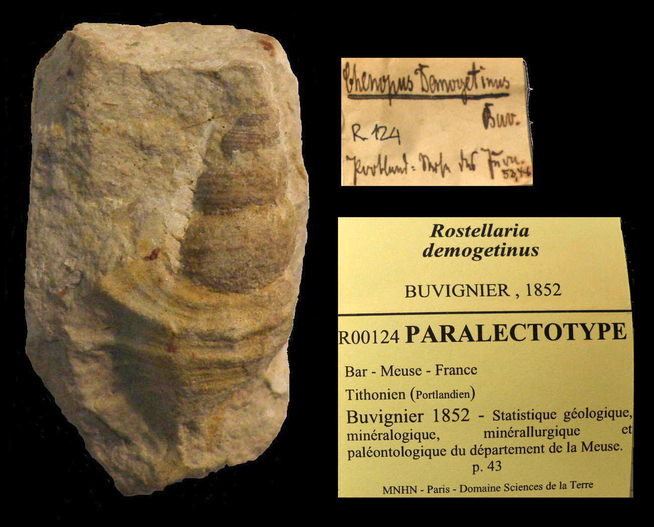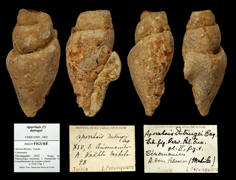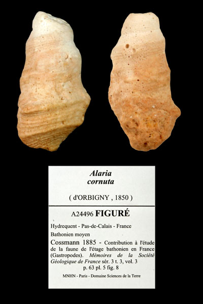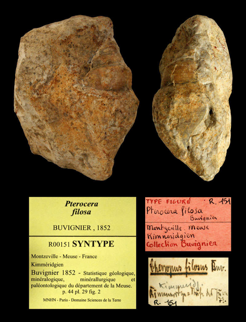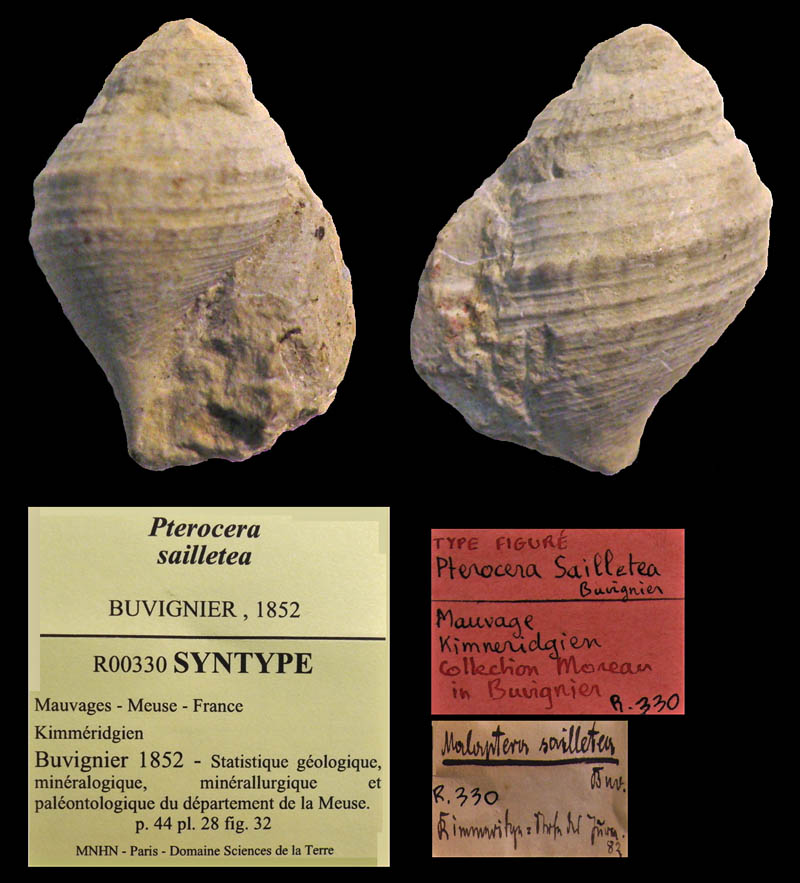 ![]() Quadrinervus autissiodorensis (Cotteau, 1854); Portlandian, Tithonian, upper Jurassic; Auxerre, Yonne Department, France; Coll. MNHN; Copyright MNHN ![]() Chenopus autissiodorensis Cotteau, 1854); Portlandian, Tithonian, upper Jurassic; Auxerre, Yonne Department, France; Coll. MNHN no. R003; Copyright MNHN ![]() Rostellaria angulicostata (Buvignier, 1852); Lectotype; Kimmeridgian, upper jurassic; Demanche-aux-Eaux, Meuse Department, France; Coll. MNHN no. R00042; Copyright MNHN ![]() Quadrinervus amoenus (Piette, 1856); Bathonian, middle Jurassic; Rumigny, Ardennes Department, France; 12.5 mm; Coll. MNHN no. R00017; Copyright MNHN ![]() Cuphotifer hamulus (Eudes-Deslongchamps, 1843); upper Bathonian, middle Jurassic; Luc, Calvados Department, France; Coll. Deshayes 1876-8; Copyright MNHN ![]() Cyphsolenus dyoniseus (Buvignier 1852); Portlandian, Tithonian, upper Jurassic; Auxerre, Yonne Department, France; Coll. MNHN; Copyright MNHN ![]() Rostellaria tenuistria (Buvignier, 1852); Lectotype; Kimmeridgian, upper Jurassic; Mauvages, Meuse Department, France; Coll. MNHN no. R00360 Copyright MNHN ![]() Cyphosolenus fusoides (Dolfus, 1863); Kimmeridgian, upper Jurassic; Cap de la Hève, Le Havre, Seine-Maritime Department, France; Coll. MNHN; Copyright MNHN ![]() Cuphosolenus sp.; Bajocian, middle Jurassic; Darma, Saudi Arabia; 57 mm; Coll. MNHN no. B74224; Copyright MNHN ![]() Cuphosolenus sp.; Bajocian, middle Jurassic; Darma, Saudi Arabia; 32 mm; Coll. MNHN no. B74224; Copyright MNHN ![]() Cuphosolenus sp.; Bajocian, middle Jurassic; Darma, Saudi Arabia; 70 mm; Coll. MNHN no. B74224; Copyright MNHN ![]() Cuphosolenus sp.; Bajocian, middle Jurassic; Wadi ar Rayn, Saudi Arabia; 65 mm; Coll. MNHN no. B74225; Copyright MNHN ![]() Dicroloma triseriatum Parnes, 1981; Bajocian, middle Jurassic; Shaqra, Saudi Arabia; 32 mm; Coll. MNHN no. B74223; Copyright MNHN ![]() Dicroloma glandina (Stoliczka, 1868); upper Cretaceous; Manandany, Madagascar; 15 mm, 15.5 mm; Coll. MNHN no. R06527; Copyright MNHN ![]() Dicroloma glandina (Stoliczka, 1868); upper Cretaceous; Manandany, Madagascar; Coll. MNHN no. R06527; Copyright MNHN ![]() Dicroloma glandina (Stoliczka, 1868); upper Cretaceous; Manandany, Madagascar; Coll. MNHN no. R06527; Copyright MNHN ![]() Dicroloma album (Thurmann, 1861); Oxfordian, upper Jurassic; Roche-sur-Vannon, Haute-Saône Department, France; Coll. MNHN no. A26146; Copyright MNHN ![]() Dicroloma polygonum Piette & Eudes-Deslongchamps, 1866; lower Bathonian, middle Jurassic; Hydrequent, Rinxent, Pas-de-Calais Department, France; Coll. MNHN; Copyright MNHN ![]() Pterocera athulia (d’Orbigny, 1850); Callovian, middle Jurassic; Chaumont, Haute-Marne Department, France; Coll. MNHN no. A06273; Copyright MNHN ![]() Pterocera athulia (d’Orbigny, 1850); Callovian, middle Jurassic; Pizieux, Sarthe Department, France; Coll. MNHN no. A06274; Copyright MNHN ![]() Dicroloma acuminatum (Piette, 1856); Bathonian, middle Jurassic; Hydrequent, Rinxent, Pas-de-Calais Department, France; 22 mm and 21 mm; Coll. MNHN; Copyright MNHN ![]() Dicroloma acuminatum (Piette, 1856); Bathonian, middle Jurassic; Rumigny, Ardennes Department, France; heigt 19.5 mm, width 14.5 mm; Coll. MNHN no. R00010; Copyright MNHN ![]() Dicroloma bervillei (Piette, 1856); Bathonian, middle Jurassic; Rumigny, Ardennes Department, France; heigt 18 mm and 15.5 mm; Coll. MNHN no. R00061; Copyright MNHN ![]() Dicroloma tridigitatum (Piette, 1856); Topotype; Bathonian, middle Jurassic; Rumigny, Ardennes Department, France; Coll. MNHN; Copyright MNHN ![]() Dicroloma tridigitatum (Piette, 1856); Topotype; Bathonian, middle Jurassic; Rumigny, Ardennes Department, France; Coll. MNHN; Copyright MNHN ![]() Dicroloma cirrus (Eudes-Deslongchamps, 1843); Bathonien, middle Jurassic; Rumigny, Ardennes Department, France; Coll. MNHN; Copyright MNHN ![]() Alaria martini Piette & Eudes-Deslongchamps, 1867; Oxfordian, upper Jurassic; Hauteville, Ain, Rhône-Alpes, France; Syntype; H. 24 mm; Coll. MNHN no. R00232; Copyright MNHN ![]() Alaria hamiformis Piette, 1867; Oxfordian, upper Jurassic; Neuvizy, Ardennes, Champagne-Ardenne, France; Syntype; H. 19 mm; Coll. MNHN no. A07328; Copyright MNHN ![]() Alaria trebochorum Piette, 1869; Callovian, middle Jurassic; La Maiche, Territoire de Belfort, Franche-Comté, France; Syntype; H. 15 mm; Coll. MNHN no. R05622; Copyright MNHN ![]() Alaria gignyensis Cotteau in Piette, 1867; Oxfordian, upper Jurassic; Gigny, Yonne, Bourgogne, France; Syntype; H. 21 mm; Coll. MNHN no. R00165; Copyright MNHN ![]() Alaria gignyensis Cotteau in Piette, 1867; Oxfordian, upper Jurassic; Val-de-Juilly, Côte-d'Or, Bourgogne, France; Syntype; H. 22 mm; Coll. MNHN no. R00166; Copyright MNHN ![]() Alaria subcarinella Thomas & Péron, 1889; Cenomanian, upper Cretaceous; Djebel Meghila; Tunesia; Syntype; H. 27 mm; Coll. MNHN no. B19222; Copyright MNHN ![]() Alaria reticulata Piette, 1864; Syntype; Toarcian, lower Jurassic; Aresches, Jura Department, France; Coll. MNHN no. R00323; Copyright MNHN ![]() Pietteia tridactyla (Buvignier, 1843); Oxfordian, upper Jurassic; Neuvisy, Ardennes Department, France; both 22 mm. Coll. MNHN; Ex-coll. Peron; Copyright MNHN ![]() Alaria subbicarinata (d'Orbigny, 1850); Oxfordian, upper Jurassic; Neuvizy, Ardennes Department, France; Coll. MNHN no. R00347; Copyright MNHN ![]() Rostellaria seminuda (Hebert & Deslongchamps, 1860); Syntype; Callovian, middle Jurassic; Le Chalet, Montreuil-Bellay, Maine-et-Loire Department, France; Coll. MNHN no. J00824; Copyright MNHN ![]() Pietteia distorta Fischer, 1964; lower Bathonian, middle Jurassic; Saint-Gaultier, Indre Department, France; Coll. MNHN; Copyright MNHN ![]() Cyphosolenus tetracer (d'Orbigny, 1825); Kimmeridgian, upper Jurassic; Tonnerre, Yonne Department, France; Coll. MNHN no. R00363; Copyright MNHN ![]() Pterocera cornuta (d’Orbigny,1850); Bathonian, middle Jurassic; Marquise, Pas-de-Calais Department, France; 12.5 mm; Coll. MNHN no. A04976
