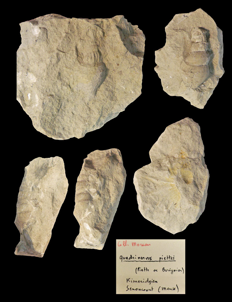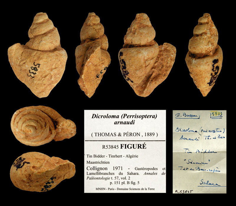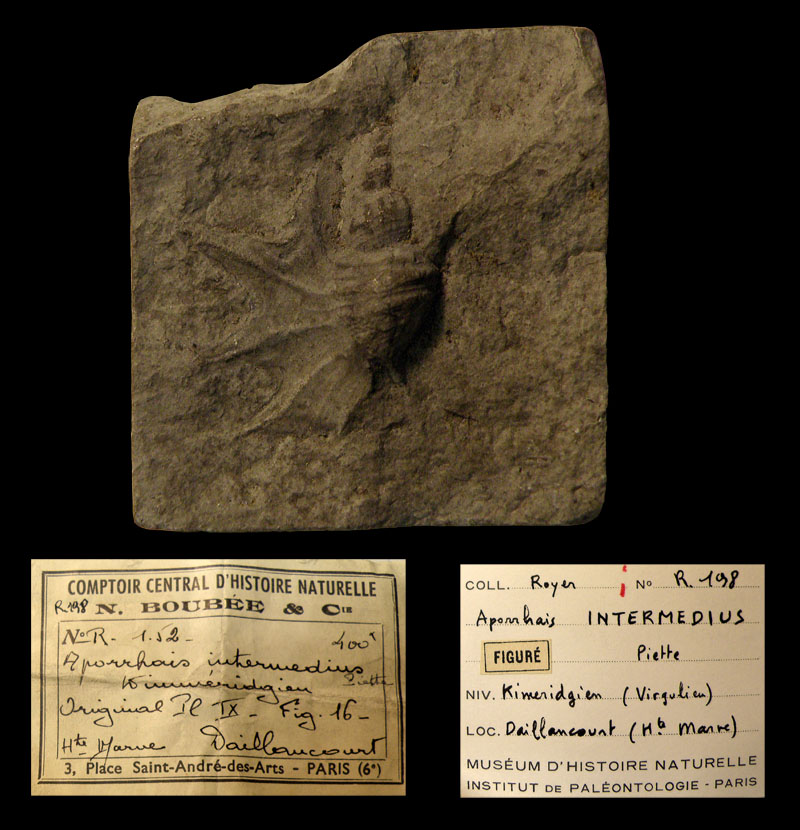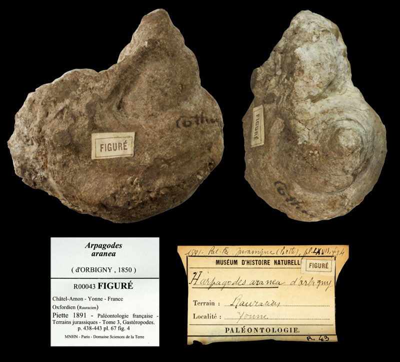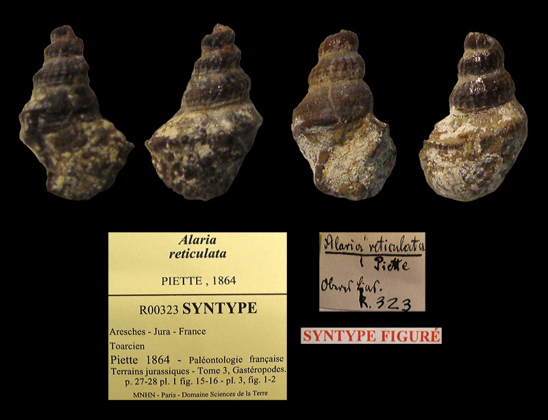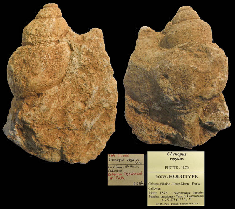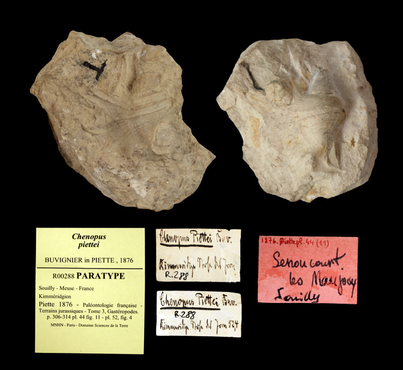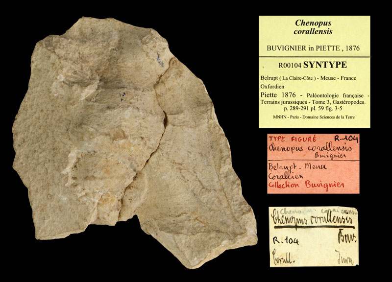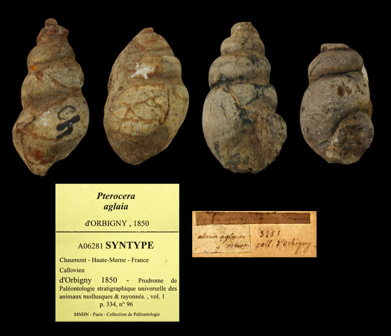![]() Quadrinervus autissiodorensis (Cotteau, 1854); Portlandian, Tithonian, upper Jurassic; Auxerre, Yonne Department, France; Coll. MNHN; Copyright MNHN ![]() Chenopus autissiodorensis Cotteau, 1854); Portlandian, Tithonian, upper Jurassic; Auxerre, Yonne Department, France; Coll. MNHN no. R003; Copyright MNHN ![]() Rostellaria angulicostata (Buvignier, 1852); Lectotype; Kimmeridgian, upper jurassic; Demanche-aux-Eaux, Meuse Department, France; Coll. MNHN no. R00042; Copyright MNHN ![]() Quadrinervus amoenus (Piette, 1856); Bathonian, middle Jurassic; Rumigny, Ardennes Department, France; 12.5 mm; Coll. MNHN no. R00017; Copyright MNHN ![]() Cuphotifer hamulus (Eudes-Deslongchamps, 1843); upper Bathonian, middle Jurassic; Luc, Calvados Department, France; Coll. Deshayes 1876-8; Copyright MNHN ![]() Cyphsolenus dyoniseus (Buvignier 1852); Portlandian, Tithonian, upper Jurassic; Auxerre, Yonne Department, France; Coll. MNHN; Copyright MNHN ![]() Rostellaria tenuistria (Buvignier, 1852); Lectotype; Kimmeridgian, upper Jurassic; Mauvages, Meuse Department, France; Coll. MNHN no. R00360 Copyright MNHN ![]() Cyphosolenus fusoides (Dolfus, 1863); Kimmeridgian, upper Jurassic; Cap de la Hève, Le Havre, Seine-Maritime Department, France; Coll. MNHN; Copyright MNHN ![]() Cuphosolenus sp.; Bajocian, middle Jurassic; Darma, Saudi Arabia; 57 mm; Coll. MNHN no. B74224; Copyright MNHN ![]() Cuphosolenus sp.; Bajocian, middle Jurassic; Darma, Saudi Arabia; 32 mm; Coll. MNHN no. B74224; Copyright MNHN ![]() Cuphosolenus sp.; Bajocian, middle Jurassic; Darma, Saudi Arabia; 70 mm; Coll. MNHN no. B74224; Copyright MNHN ![]() Cuphosolenus sp.; Bajocian, middle Jurassic; Wadi ar Rayn, Saudi Arabia; 65 mm; Coll. MNHN no. B74225; Copyright MNHN ![]() Dicroloma triseriatum Parnes, 1981; Bajocian, middle Jurassic; Shaqra, Saudi Arabia; 32 mm; Coll. MNHN no. B74223; Copyright MNHN ![]() Dicroloma glandina (Stoliczka, 1868); upper Cretaceous; Manandany, Madagascar; 15 mm, 15.5 mm; Coll. MNHN no. R06527; Copyright MNHN ![]() Dicroloma glandina (Stoliczka, 1868); upper Cretaceous; Manandany, Madagascar; Coll. MNHN no. R06527; Copyright MNHN ![]() Dicroloma glandina (Stoliczka, 1868); upper Cretaceous; Manandany, Madagascar; Coll. MNHN no. R06527; Copyright MNHN ![]() Dicroloma album (Thurmann, 1861); Oxfordian, upper Jurassic; Roche-sur-Vannon, Haute-Saône Department, France; Coll. MNHN no. A26146; Copyright MNHN ![]() Dicroloma polygonum Piette & Eudes-Deslongchamps, 1866; lower Bathonian, middle Jurassic; Hydrequent, Rinxent, Pas-de-Calais Department, France; Coll. MNHN; Copyright MNHN ![]() Pterocera athulia (d’Orbigny, 1850); Callovian, middle Jurassic; Chaumont, Haute-Marne Department, France; Coll. MNHN no. A06273; Copyright MNHN ![]() Pterocera athulia (d’Orbigny, 1850); Callovian, middle Jurassic; Pizieux, Sarthe Department, France; Coll. MNHN no. A06274; Copyright MNHN ![]() Dicroloma acuminatum (Piette, 1856); Bathonian, middle Jurassic; Hydrequent, Rinxent, Pas-de-Calais Department, France; 22 mm and 21 mm; Coll. MNHN; Copyright MNHN ![]() Dicroloma acuminatum (Piette, 1856); Bathonian, middle Jurassic; Rumigny, Ardennes Department, France; heigt 19.5 mm, width 14.5 mm; Coll. MNHN no. R00010; Copyright MNHN ![]() Dicroloma bervillei (Piette, 1856); Bathonian, middle Jurassic; Rumigny, Ardennes Department, France; heigt 18 mm and 15.5 mm; Coll. MNHN no. R00061; Copyright MNHN ![]() Dicroloma tridigitatum (Piette, 1856); Topotype; Bathonian, middle Jurassic; Rumigny, Ardennes Department, France; Coll. MNHN; Copyright MNHN ![]() Dicroloma tridigitatum (Piette, 1856); Topotype; Bathonian, middle Jurassic; Rumigny, Ardennes Department, France; Coll. MNHN; Copyright MNHN ![]() Dicroloma cirrus (Eudes-Deslongchamps, 1843); Bathonien, middle Jurassic; Rumigny, Ardennes Department, France; Coll. MNHN; Copyright MNHN ![]() Alaria martini Piette & Eudes-Deslongchamps, 1867; Oxfordian, upper Jurassic; Hauteville, Ain, Rhône-Alpes, France; Syntype; H. 24 mm; Coll. MNHN no. R00232; Copyright MNHN ![]() Alaria hamiformis Piette, 1867; Oxfordian, upper Jurassic; Neuvizy, Ardennes, Champagne-Ardenne, France; Syntype; H. 19 mm; Coll. MNHN no. A07328; Copyright MNHN ![]() Alaria trebochorum Piette, 1869; Callovian, middle Jurassic; La Maiche, Territoire de Belfort, Franche-Comté, France; Syntype; H. 15 mm; Coll. MNHN no. R05622; Copyright MNHN ![]() Alaria gignyensis Cotteau in Piette, 1867; Oxfordian, upper Jurassic; Gigny, Yonne, Bourgogne, France; Syntype; H. 21 mm; Coll. MNHN no. R00165; Copyright MNHN ![]() Alaria gignyensis Cotteau in Piette, 1867; Oxfordian, upper Jurassic; Val-de-Juilly, Côte-d'Or, Bourgogne, France; Syntype; H. 22 mm; Coll. MNHN no. R00166; Copyright MNHN ![]() Alaria subcarinella Thomas & Péron, 1889; Cenomanian, upper Cretaceous; Djebel Meghila; Tunesia; Syntype; H. 27 mm; Coll. MNHN no. B19222; Copyright MNHN ![]() Alaria reticulata Piette, 1864; Syntype; Toarcian, lower Jurassic; Aresches, Jura Department, France; Coll. MNHN no. R00323; Copyright MNHN ![]() Pietteia tridactyla (Buvignier, 1843); Oxfordian, upper Jurassic; Neuvisy, Ardennes Department, France; both 22 mm. Coll. MNHN; Ex-coll. Peron; Copyright MNHN ![]() Alaria subbicarinata (d'Orbigny, 1850); Oxfordian, upper Jurassic; Neuvizy, Ardennes Department, France; Coll. MNHN no. R00347; Copyright MNHN ![]() Rostellaria seminuda (Hebert & Deslongchamps, 1860); Syntype; Callovian, middle Jurassic; Le Chalet, Montreuil-Bellay, Maine-et-Loire Department, France; Coll. MNHN no. J00824; Copyright MNHN ![]() Pietteia distorta Fischer, 1964; lower Bathonian, middle Jurassic; Saint-Gaultier, Indre Department, France; Coll. MNHN; Copyright MNHN ![]() Cyphosolenus tetracer (d'Orbigny, 1825); Kimmeridgian, upper Jurassic; Tonnerre, Yonne Department, France; Coll. MNHN no. R00363; Copyright MNHN ![]() Pterocera cornuta (d’Orbigny,1850); Bathonian, middle Jurassic; Marquise, Pas-de-Calais Department, France; 12.5 mm; Coll. MNHN no. A04976