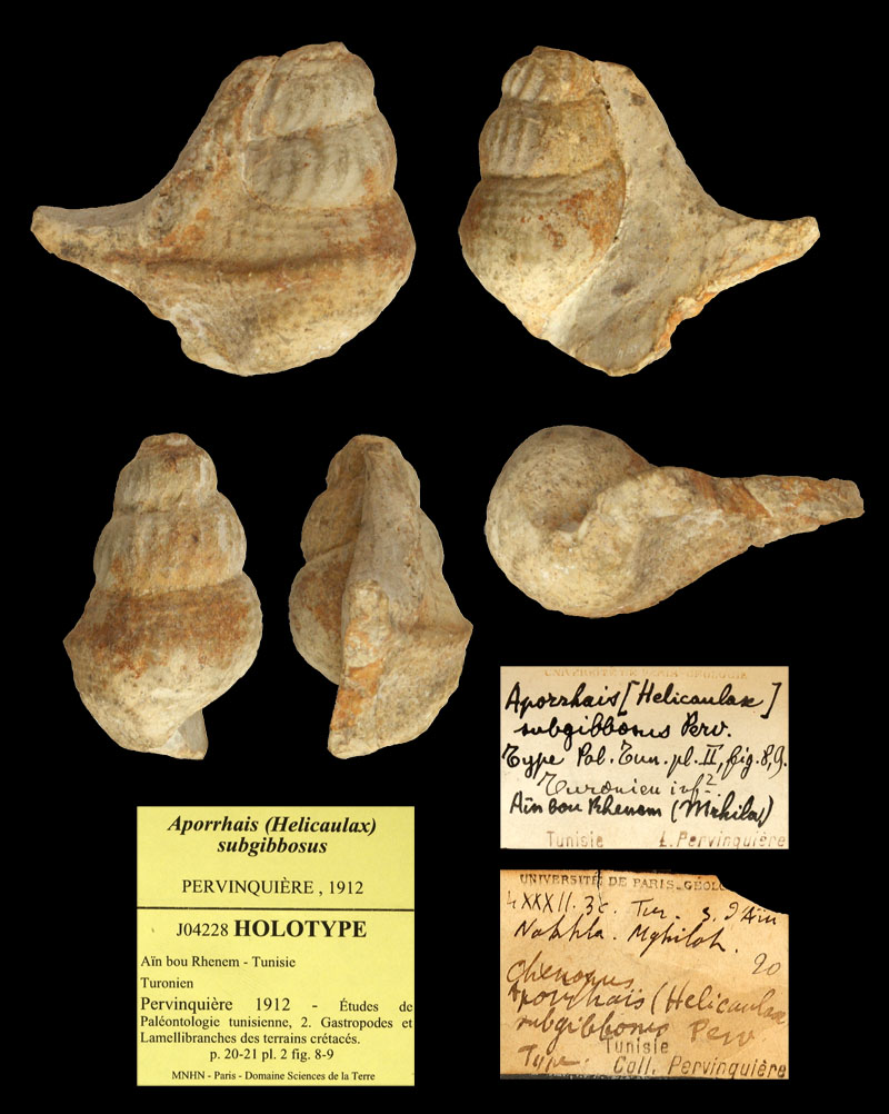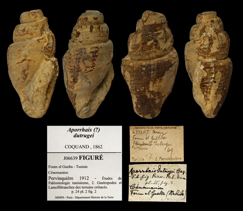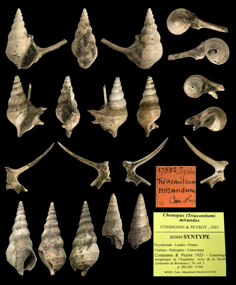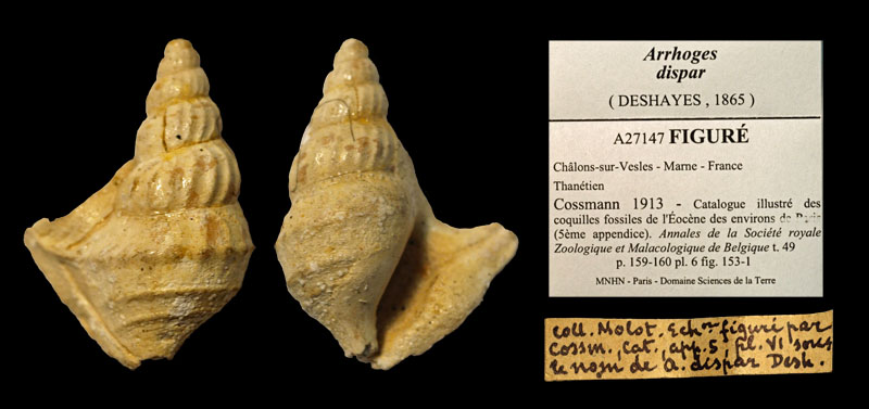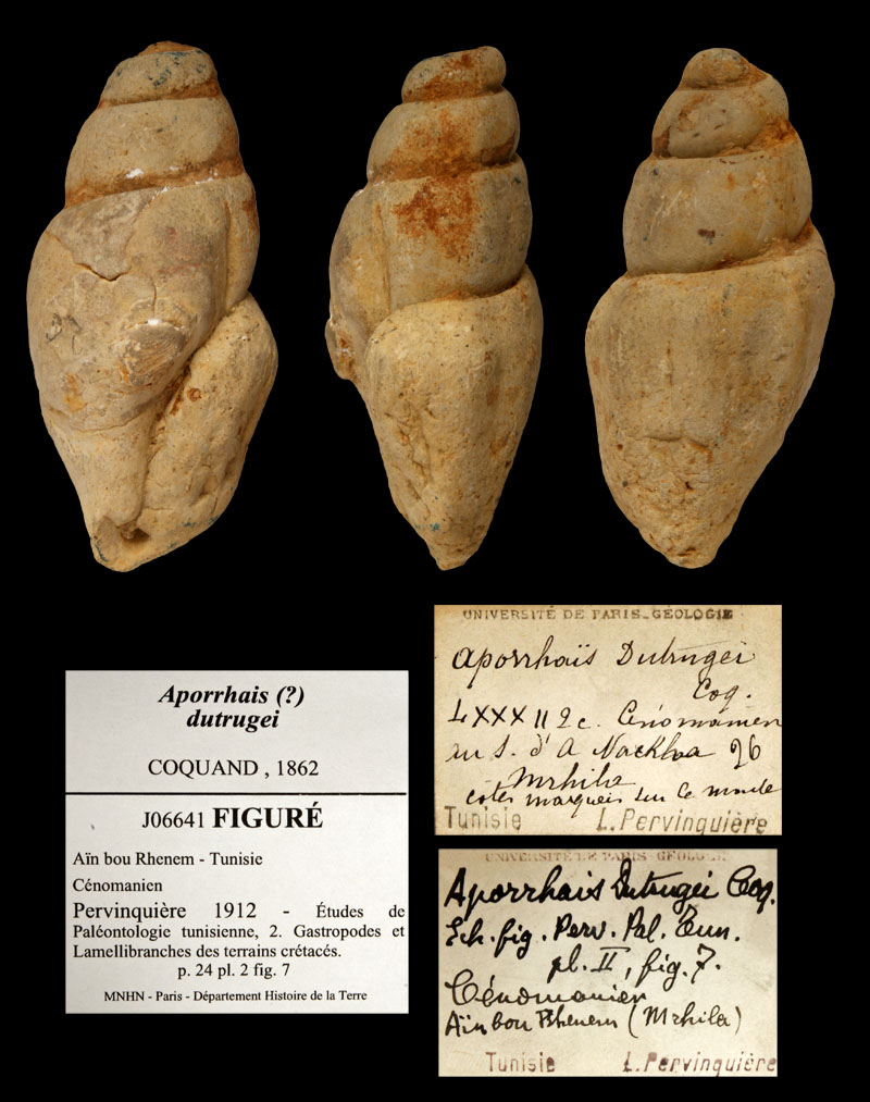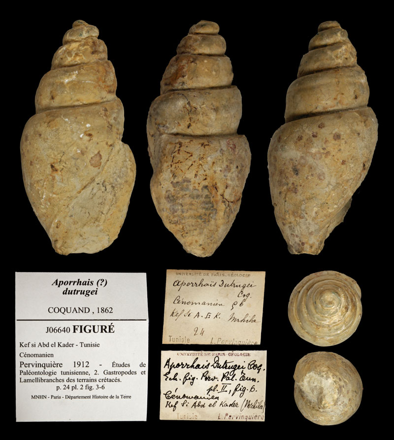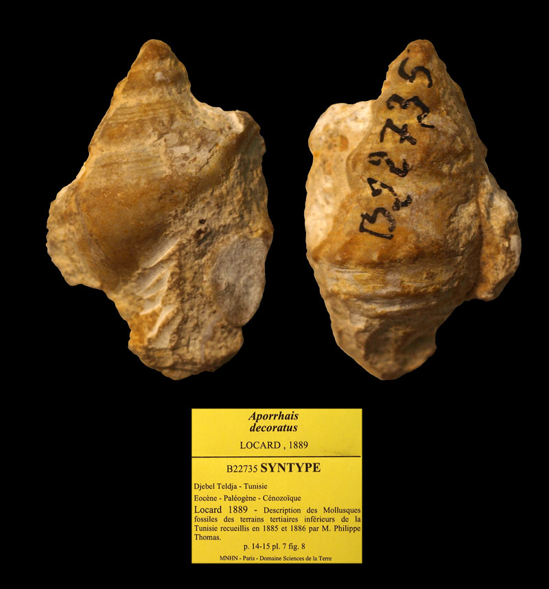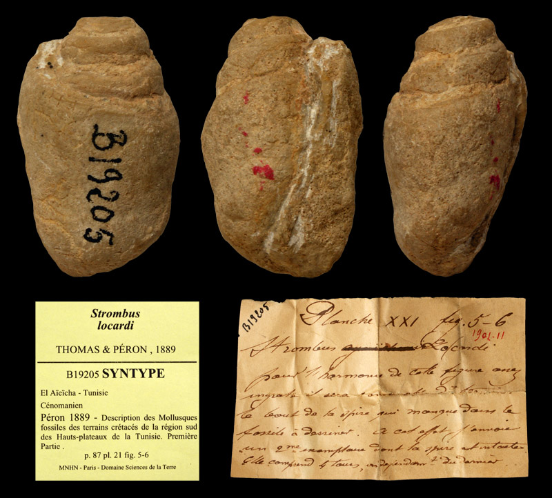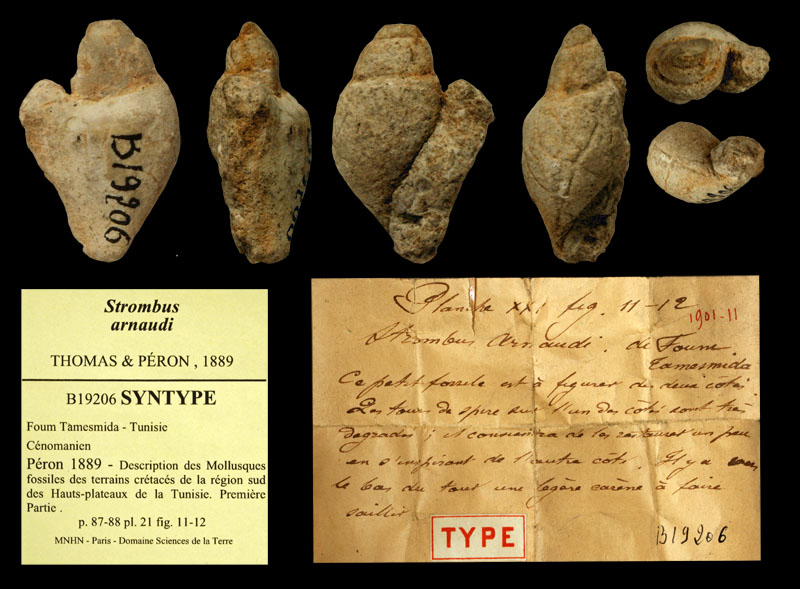 ![]() Strombus karikalensis (Cossmann, 1903); Pliocene; Karaikal (Karikal), Karaikal district, Union Territory of Puducherry, Coromandel Coast, India; Coll. MNHN no. J08663; Copyright MNHN ![]() Rostellaria (Hippochrenes) variculosa (Doncieux, 1908); Ypresian, lower Eocene; Coustouge, Aude Department, France; Coll. MNHN no. R64159; Copyright MNHN ![]() Rostellaria geoffroyi (Watelet, 1856); Syntypes; Cuisian, Ypresian, lower Eocene; Aizy-Jouy, Aisne Department, France; Ex-coll. Watelet; Coll. MNHN no. R63049; Copyright MNHN ![]() Tibia (Wateletia) geoffroyi (Watelet, 1856) ; Cuisian, Ypresian, lower Eocene; Mercin-et-Vaux, Aisne Department, France; 200 mm; Coll. MNHN no. A25385; Copyright MNHN ![]() Wateletia geoffroyi (Watelet, 1856); Cuisian, Ypresian, lower Eocene; Mercin-et-Vaux, Aisne Department, France; Coll. MNHN no. A25322; Copyright MNHN ![]() Rostellaria (Wateletia) geoffroyi (Watelet, 1856); Cuisian, Ypresian, lower Eocene; Aizy-Jouy, Aisne Department, France; Coll. MNHN no. J02540; Copyright MNHN ![]() Wateletia geoffroyi (Watelet, 1856); Cuisian, Ypresian, lower Eocene; Saint-Gobain, Aisne Department, France; Coll. MNHN no. A25323; Copyright MNHN ![]() Tibia (Wateletia) callosa (Deshayes, 1835); Coll. MNHN no. R64963; Copyright MNHN ![]() Rostellaria athleta (D'Orbigny, 1850); Lectotype; Bartonian, middle Eocene; Auvers-sur-Oise, Val d'Oise Department, France; 280 mm; Coll. MNHN no. R63043; Copyright MNHN ![]() Amplogladius athleta (D'Orbigny, 1850); Eocene; France; 240 mm; Coll. MNHN; Copyright MNHN ![]() Tibia (Eotibia) wrigleyi (Glibert, 1963); Cuisian, Ypresian, lower Eocene; Aizy-Jouy, Yonne Department, France; Coll. MNHN, UPMC no. 1665; Copyright MNHN ![]() Tibia (Eotibia) wrigleyi (Glibert, 1963); Cuisian, Ypresian, lower Eocene; Aizy-Jouy, Yonne Department, France; Coll. MNHN, UPMC no. 1665; Copyright MNHN ![]() Dientomochilus (Digitolabrum) princeps (Vasseur, 1881); Lutetian, middle Eocene; Coteau de Vauville, Fresville, Manche Department, France; Coll. MNHN no. B63091; Copyright MNHN ![]() Aporrhais decoratus Locard, 1889; Syntype; Eocene; Djebel Teldja, near Metlaoui, Tunisia; Coll. MNHN no. B22735; Copyright MNHN ![]() Aporrhais gabonensis Darteville & Brebion, 1956; Syntype; Turonian, upper Cretaceous; Mikamidzème, Bilagone, Gabon; Coll. MNHN no. R61098; Copyright MNHN ![]() Chenopus burdigalensis (d'Orbigny, 1852); Miocene; Baden, Vienna, Lower Austria State, Austria; Coll. MNHN no. B31573; Copyright MNHN ![]() Chenopus magdalenae Buvignier in Piette, 1852; Holotype; Kimmeridgian, upper Jurassic; Sénoncourt, Meuse, Lorraine, France, Photo: Gaëlle Doitteau; Coll. MNHN R00227; Copyright MNHN ![]() Chenopus magnificus Piette, 1876; syntype; Oxfordian, upper Jurassic; Neuvizy, Champagne-Ardenne, France; Photo: Jocelyn Falconnet; Coll. MNHN A07327; Copyright MNHN ![]() Chenopus ovatus Piette, 1876; holotype; Kimmeridgian, upper Jurassic; Le Banné, Franche-Compté, France; Photo: Gaëlle Doitteau; Coll. MNHN; Copyright MNHN ![]() Chenopus heberti (Deshayes, 1865); Holotype; Thanetian, Paleocene; La Fère, Aisne Department, France; Coll. MNHN no. J03353; Copyright MNHN ![]() Chenopus corallensis Buvignier in Piette, 1876; Syntype; Oxfordian, upper Jurassic; La Claire-Côte, Belrupt, Meuse Department, France; Coll. MNHN no. R00104; Copyright MNHN ![]() Chenopus (Maussenetia) roquesi Tessier, 1952; Syntypes; Ypresian, lower Eocene; N'Gazobil, South of Dakar, Thies Region, Senegal, West Africa; Coll. MNHN no. R05771; Copyright MNHN ![]() Chenopus pescarbonis (Brongniart, 1823); Priabonian, upper Eocene; Le-Vît-de-Castellane, Alpes-de-Hautes-Provence Department, France; Coll. MNHN no. A25811; Copyright MNHN ![]() Aporrhais oxydactyla (Sandberger, 1861); Sables de Morigny, Rupelian (Stampian), lower Oligocene; Morigny-Champigny, Essonne Department, France; Coll. MNHN ![]() Chenopus meridionalis (Basterot, 1825); in Cossmann & Peyrot; Burdigalian, lower Miocene; Saucats, Gironde Department, France; Coll. MNHN no. J05946; Copyright MNHN ![]() Pereiraia brevispira Lecointre, 1946, Holotype; Miocene; Oued Mellah, Mohammédia, Casablanca-Settat Region, Morocco; Coll. MNHN no. R06350; Copyright MNHN ![]() Strombus trigonus (Grateloup, 1834; lower Miocene; Le Thil, Leognan, Gironde Department, France; Coll. MNHN; Copyright MNHN ![]() Strombus (Monodactylus) tricornis Lamarck, 1822; Pleistocene; Ras Doumeira, Djibouti, Gulf of Aden, Arabian Sea; Coll. MNHN no. A26812; Copyright MNHN ![]() Strombus (Canarium) praegibberulus (Abrard, 1947); Syntypes; Pliocene; Nua River, Malekula Island, Malampa Province, Vanuatu Archipelago (formerly New Hebrides), South Pacific Ocean; Coll. MNHN no. A26978; Copyright MNHN ![]() Strombus (Canarium) terebellatus (Linnaeus, 1758); Pliocene; Nua River, Malekula Island, Malampa Province, Vanuatu Archipelago (formerly New Hebrides), South Pacific Ocean; Coll. MNHN no. A27083; Copyright MNHN ![]() Rostellaria curvirostris (Lamarck, 1822); Figured in Abrard, 1941; Pleistocene; Oued Baghenda, Obock Region, Djibouti, Gulf of Aden, Arabian Sea; 205 mm; Coll. MNHN no. A26811; Copyright MNHN ![]() Thersitea ponderosa Coquand, 1862; Cast; Eocene; Ksar Birine, Djelfa Province, Algeria; 95 mm; Coll. MNHN no. A26652; Copyright MNHN ![]() Thersitea verrucosa Locard, 1889; Syntype; Eocene; Djebel Teldja, near Metlaoui, Tunisia; Coll. MNHN no. B22761; Copyright MNHN ![]() Hemithersitea ventricosa Savornin, 1914; Cast of Syntype; Lutetian, middle Eocene; Sidi Aïssa d'Aulane, M'Sila Province, Algeria; Coll. MNHN no. A26651; Copyright MNHN ![]() Hemithersitea ventricosa Savornin, 1914; Lutetian, middle Eocene; Oued Zem, Khouribga Province, Béni Mellal-Khénifra Region, Morocco; Coll. MNHN no. R05545; Copyright MNHN ![]() Strombus (Dilatilabrum) fortisi (Brongniart, 1823); Lutetian, middle Eocene; Roncà, Verona Province, Veneto Region, Italy; Coll. MNHN no. B22092; Copyright MNHN ![]() Cyclomolops subhumerosa Oppenheim, 1915; Danian, Paleocene; Togblékové, Nort