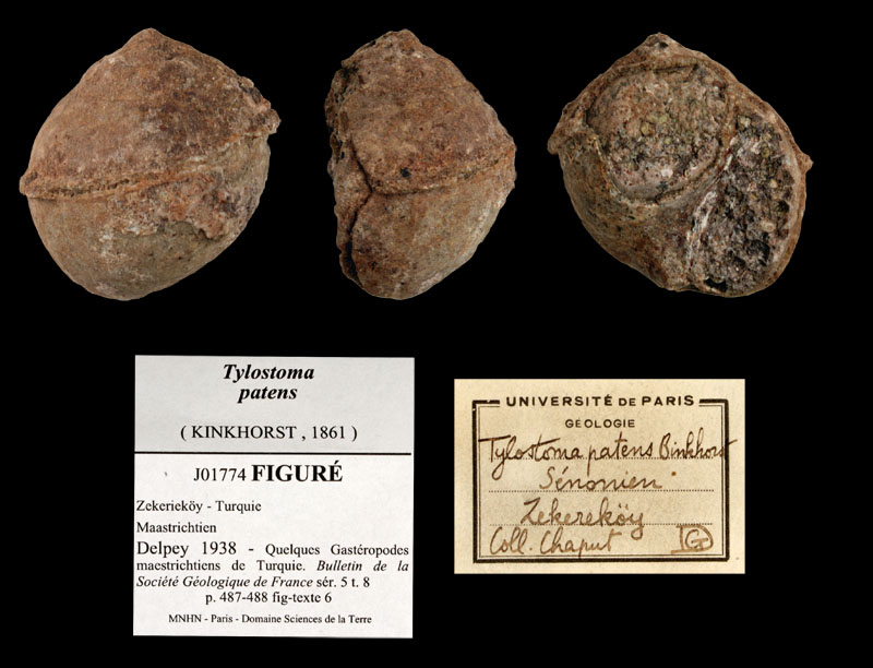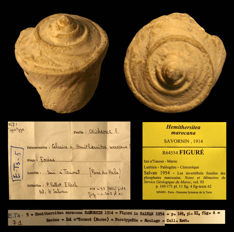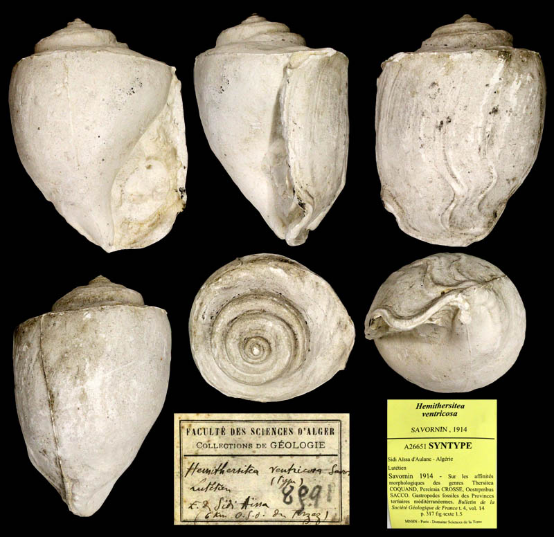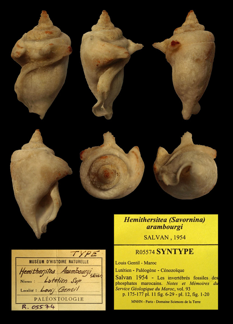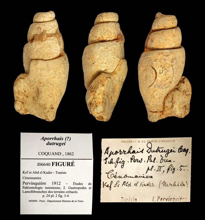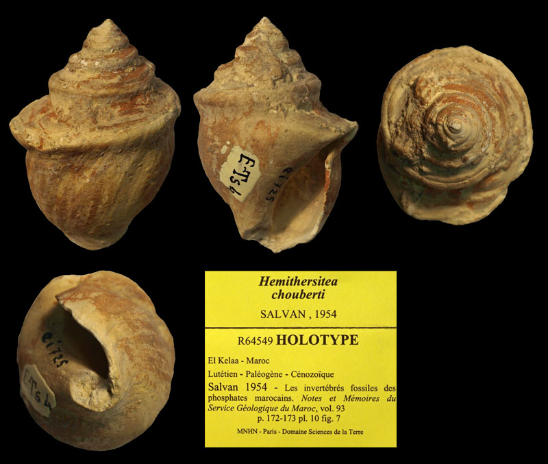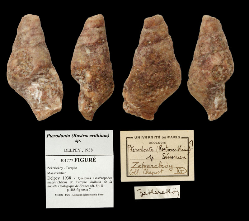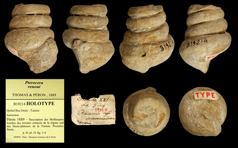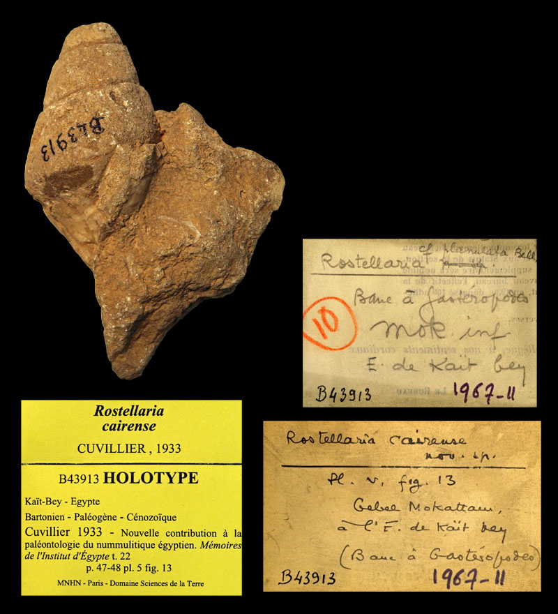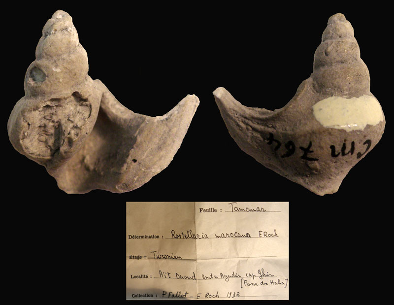 ![]() Thersitea gregaria (Antoine, 1943); Lutetian, middle Eocene; Khouribga, Khouribga Province, Béni Mellal-Khénifra Region, Morocco; Coll. MNHN no. R64559; Copyright MNHN ![]() Hemithersitea arambourgi Salvan, 1954; Syntype; Lutetian, middle Eocene; Youssoufia (formerly Louis Gentil), Marrakesh-Safi Region, Morocco; Coll. MNHN no. R05574; Copyright MNHN ![]() Hemithersitea arambourgi Salvan, 1954; Syntype; Lutetian, middle Eocene; Youssoufia (formerly Louis Gentil), Marrakesh-Safi Region, Morocco; Coll. MNHN no. R05574; Copyright MNHN ![]() Hemithersitea arambourgi Salvan, 1954; Syntype; Lutetian, middle Eocene; Youssoufia (formerly Louis Gentil), Marrakesh-Safi Region, Morocco; Coll. MNHN no. R05574; Copyright Museum national d'Histoire naturelle Paris ![]() Thersitea eremita; Antoine, 1943; Holotype; Lutetian, middle Eocene; Khouribga, Khouribga Province, Béni Mellal-Khénifra Region, Morocco; Coll. MNHN no. R64556 ; Copyright MNHN ![]() Hemithersitea chouberti Salvan, 1954; Lutetian, middle Eocene; El Kelaa, Marrakech-Safi Region, Morocco; Coll. MNHN no. R64549; Copyright MNHN ![]() Hemithersitea maroccana Salvan, 1954; Lutetian, middle Eocene; Imi n'Tanout, Morocco; Coll. MNHN no. R64554; Figured in Salvan, 1954; Copyright Museum national d'Histoire naturelle Paris ![]() Chenopus elegans Cuvillier, 1930, Syntypes; Mokattam, Egypt; Bartonian, Eocene; Coll. MNHN B43899, Copyright Museum national d'Histoire naturelle Paris ![]() Rostellaria americana d'Orbigny, 1842; Syntype MNHN.F.B15815; Anolaima, Colombia; Cretaceous; Photo: Gaëlle Doitteau; Coll. MNHN; Copyright MNHN ![]() Veatchia carolinae Maury, 1912; Paleocene; Marigot de Balling, Senegal; Figured: Tessier, 1952; Coll. MNHN no. R06288; Copyright Museum national d'Histoire naturelle Paris ![]() Chenopus hirsutus (Dollfus, 1863);Kimmeridgian, upper Jurassic; Mauvage, Meuse Department, Champagne-Ardenne, France; 30 mm; figured in Piette, 1876; Coll. MNHN R00189; Copyright MNHN ![]() Rostellaria barrensis Buvignier, 1852; Tithonian, upper Jurassic; Bar-le-Duc, Meuse Department, Lorraine, France; Lectotype; 35 mm; Coll. MNHN R00063; Copyright MNHN ![]() Rostellaria (Calyptrophorus) palliata (Forbes, 1846); "Senonian", upper Cretaceous; Fanivelona, Nosy Varika District, Vatovavy-Fitovinany Region, Madagascar; 49 mm; Coll. MNHN no. R07687; Copyright MNHN ![]() Rostellaria mosensis Buvignier, 1852;Kimmeridgian, upper Jurassic; Sénoncourt, Meuse Department, Lorraine, France; Lectotype; 20.5 mm; Coll. MNHN R00247; Copyright Museum national d'Histoire naturelle Paris ![]() Rostellaria mosensis Buvignier, 1852; Kimmeridgian, upper Jurassic; Sénoncourt, Meuse Department, Lorraine, France; Paralectotype; 16.5 mm; Coll. MNHN A24466; Copyright MNHN ![]() Rostellaria (Calyptrophorus) palliata (Forbes, 1846); "Senonian", upper Cretaceous; Antanihody, Mananjary, Vatovavy-Fitovinany Region, Madagascar; 29, 37 and 41 mm.; Coll. MNHN no. R07670; Copyright MNHN ![]() Strombus (Pugnellus) crassicostata Noetling, 1895; "Senonian", upper Cretaceous; Fanivelona, Nosy Varika District, Vatovavy-Fitovinany Region, Madagascar; 38 mm; Coll. MNHN no. R07167; Copyright MNHN ![]() Rostellaria cairense Cuvillier, 1933; Holotype; Bartonian, middle Eocene; Kaït-Bey, Cairo, Egypt; Coll. MNHN no. B43913; Copyright MNHN ![]() Rostellaria ornata (d'Orbigny, 1843); Lectotype; Turonian, upper Cretaceous; Uchaux, Vaucluse Department, France; Coll. MNHN no. B17816; Copyright MNHN ![]() Aporrhais cotteaui Péron, 1900; Hauterivian, lower Cretaceous; Gy-l'Evêque, Yonne, Bourgogne, France; Holotype; Coll. MNHN no. A24971; Copyright Museum national d'Histoire naturelle Paris ![]() Aporrhais cotteaui Péron, 1900; Hauterivian, lower Cretaceous; Gy-l'Evêque, Yonne, Bourgogne, France; Paratype; Coll. MNHN no. R61068; Copyright Museum national d'Histoire naturelle Paris ![]() Aporrhais(Helicaulax) subgibbosus (Pervinquière, 1912); Holotype; Turonian, upper Cretaceous; Aïn bou Rhenem, Djebel Mrhila, Central Tunesia; Coll. MNHN no. J04228; Copyright MNHN ![]() Rostellaria (Hippocrene) macroptera (Lamarck, 1803); Lutetian, middle Eocene; Chaussy, Val d'Oise Department, France; Coll. MNHN no. J03817; Copyright MNHN ![]() Rostellaria marocana Roch, 1932; Turonian, upper Cretaceous; Aït Daoud route d’Agadir, Fosses de Haha, Cap Ghir, Morocco; Coll. MNHN; Copyright MNHN ![]() Observation under ultraviolet light of residual colour patterns of Hippochrenes fissura (Coquebert de Montbret & Brongniart, 1793); Lutetian, middle Eocene; Châteaurouge, Oise Department, France; Ex-coll. Pascal Boucher; Coll. MNHN no. A29379; Copyright MNHN ![]() Strombus fissura Coquebert de Montbret & Brongniart, 1793; Syntype; Lutetian, middle Eocene; St-Germain-en-Laye, Yvelines Department, France; Coll. MNHN no. A25264; Copyright MNHN ![]() Hippochrenes boucheri Pacaud & Caze, 2011; Lutetian, middle Eocene; Fercourt, Oise Department, France; Coll. MNHN