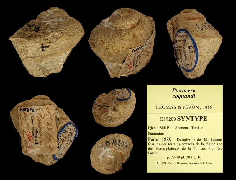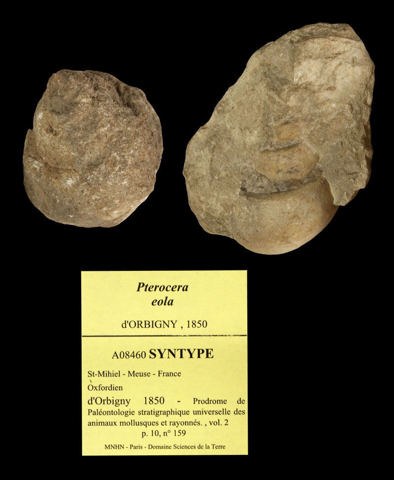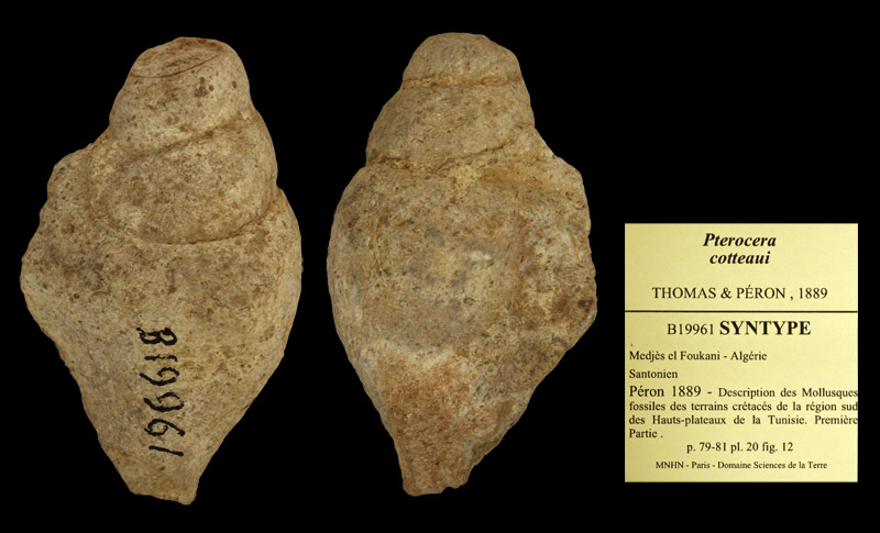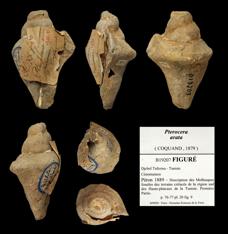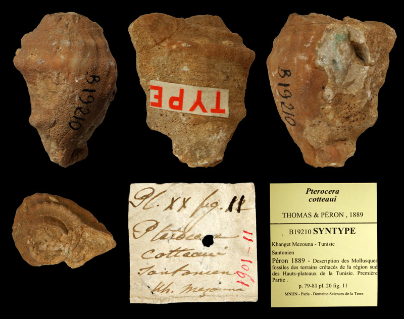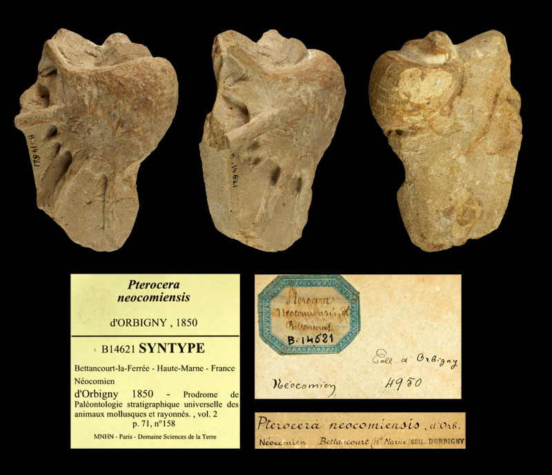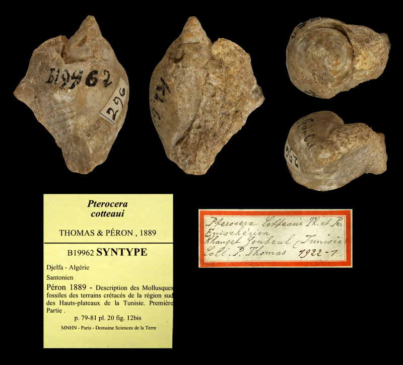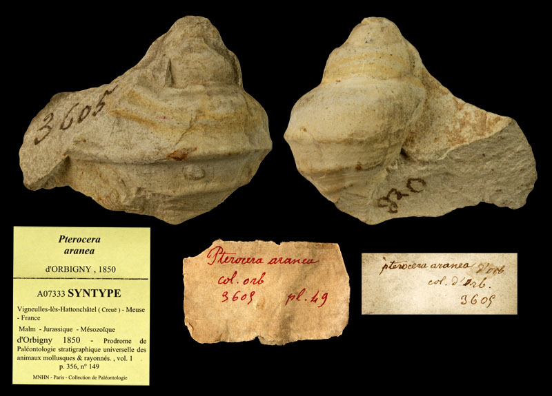 ![]() Pterocera arsinoe d'Orbigny, 1850; Lectotype; Callovian, middle Jurassic; Villers-sur-Mer, Calvados Department, France; Coll. MNHN no. R63536 ; Copyright MNHN ![]() Aporrhais intermedius Piette, 1869; Kimmeridgian, upper Jurassic; Daillancourt, Haute-Marne Department, France; Coll. MNHN no. R198; Copyright MNHN ![]() Pterocera glaucus d'Orbigny, 1850; Kimmeridgian, upper Jurassic; Villerville, Calvados Department, France; Coll. MNHN no. A09765; Copyright MNHN ![]() Pterocerus radix (Brongniart, 1823); Holotype; Priabonian, upper Eocene; Monte Grumi, Castelgomberto, Vicenza Province, Veneto Region, Italy; Coll. MNHN no. R53076; Copyright MNHN ![]() Strombus bonelli Brongniart, 1823; Paralectotype 1; Aquitanian, lower Miocene; Turin, Metropolitan City, Piedmont Region, Italy; Coll. MNHN no. R64078; Copyright MNHN ![]() Strombus bonelli Brongniart, 1823; Paralectotype 2; Aquitanian, lower Miocene; Turin, Metropolitan City, Piedmont Region, Italy; Coll. MNHN no. R64078; Copyright MNHN ![]() Strombus locardi Thomas & Peron, 1889; Syntype; Cenomanian, upper Cretaceous; El-Aïeïcha, Tunesia; 30 mm; Coll. MNHN no. B19205; Copyright MNHN ![]() Monocuphus vespa Eudes-Deslongchamps, 1843; Bathonian, middle Jurassic; Les Pichottes, Pas-de-Calais Department, France; 23 mm, 17 mm; Coll. MNHN; Copyright MNHN ![]() Pterocera amyntas (d'Orbigny, 1850); Syntype; Callovian, middle Jurassic; Pizieux, Sarthe Department, France; Coll. MNHN no. A06280; Copyright MNHN ![]() Pterocera amyntas (d'Orbigny, 1850); Syntype; Callovian, middle Jurassic; Pizieux, Sarthe Department, France; 19.5 mm; Coll. MNHN no. A06278; Copyright MNHN ![]() Pterocera aglaia d'Orbigny, 1850; Callovian, middle Jurassic; Chaumont, Haute-Marne Department, France; Coll. MNHN no. A06281; Copyright MNHN ![]() Spinigera compressa (d'Orbigny, 1850); Callovian, middle Jurassic; Pizieux, Sarthe Department, France; 17 mm; Coll. MNHN no. A06284; Copyright MNHN ![]() Spinigera compressa (d'Orbigny, 1850); Callovian, middle Jurassic; Montreuil-Bellay, Maine-et-Loire Department, France; 27 mm; Coll. MNHN no. J00825; Copyright MNHN ![]() Pterocera meslei Thomas and Peron, 1889; Maastrichtian, upper Cretaceous; Chebika, Tozeur Governorate, Tunesia; 85 mm; Coll. MNHN no. B19211; Copyright MNHN ![]() Pterocera cotteaui Thomas & Peron, 1889; Syntype; Santonian, upper Cretaceous; Khanget Mezouna, Tunesia; 38 mm; Coll. MNHN no. B19210; Copyright MNHN ![]() Pterocera cotteaui Thomas & Peron, 1889; Syntype; Santonian, upper Cretaceous; Medjès el Foukani, Algeria; 47 mm; Coll. MNHN no. B19961; Copyright MNHN ![]() Pterocera cotteaui Thomas & Peron, 1889; Syntype; Santonian, upper Cretaceous; Djelfa, Djelfa Province, Algeria; 34 mm; Coll. MNHN no. B19962; Copyright MNHN ![]() Pterocera coquandi Thomas & Peron, 1889; Syntype; Santonian, upper Cretaceous; Djebel Sidi bou Ghanem, Tunesia; 38 mm; Coll. MNHN no. B19209; Copyright MNHN ![]() Pterocera polycera (d'Orbigny, 1843); Syntype; Cenomanian, upper Cretaceous; Ile Madame, Charente-Maritime Department, France; Coll. MNHN no. R10043; Copyright MNHN ![]() Strombus (Pugnellus) auriculatus (Woods, 1906); Cretaceous; Satria, Ambovombe-Androy, Toliary, Madagascar; Coll. MNHN no. R06534; Copyright MNHN ![]() Strombus (Pugnellus) auriculatus difformis (Woods, 1906); Cretaceous; Satria, Ambovombe-Androy, Toliary, Madagascar; 39 mm; Coll. MNHN no. R06513; Copyright MNHN ![]() Pugnellus bilobatus Dartevelle & Brebion, 1956; Syntype; Campanian, upper Cretaceous; Logbatjeck, Edea Region, Cameroon; Coll. MNHN no. R61097; Copyright MNHN ![]() Pugnellus hourcqui Brebion, 1956; Syntype; "Senonian", upper Cretaceous; Fernan Vaz, Gabon; Coll. MNHN no. R6775; Copyright MNHN ![]() Pterodonta naticoides d'Orbigny, 1850; Syntype; Turonian, upper Cretaceous; Uchaux, Vaucluse, Provence-Alpes-Côte d'Azur, France; Coll. MNHN A52378; Photo: Jocelyn Falconnet; Copyright MNHN ![]() Pterodonta elongata d'Orbigny, 1843; Lectotype; Cenomanian, upper Cretaceous; Ile Madame, Charente-Maritime, Poitou-Charentes, France; Coll. MNHN B74377; Photo: Jocelyn Falconnet; Copyright MNHN ![]() Pterodonta elongata d'Orbigny, 1843; Paralectotype; Cenomanian, upper Cretaceous; Ile Madame, Charente-Maritime, Poitou-Charentes, France; Coll. MNHN A52050; Photo: Jocelyn Falconnet; Copyright MNHN ![]() Pterodonta elongata d'Orbigny, 1843; Paralectotype; Cenomanian, upper Cretaceous; Ile Madame, Charente-Maritime, Poitou-Charentes, France; Coll. MNHN A52051; Photo: Jocelyn Falconnet; Copyright MNHN ![]() Pterodonta elongata d'Orbigny, 1843; Paralectotype; Cenomanian, upper Cretaceous; Ile Madame, Charente-Maritime, Poitou-Charentes, France; Coll. MNHN A52052; Photo: Jocelyn Falconnet; Copyright MNHN ![]() Pterodonta elongata d'Orbigny, 1843; Paralectotype; Cenomanian, upper Cretaceous; Ile Madame, Charente-Maritime, Poitou-Charentes, France; Coll. MNHN A52053; Photo: Jocelyn Falconnet; Copyright MNHN ![]() Pterodonta elongata d'Orbigny, 1843; Paralectotype; Cenomanian, upper Cretaceous; Rochefort, Charente-Maritime, Poitou-Charentes, France; Coll. MNHN A52055; Photo: Jocelyn Falconnet; Copyright MNHN ![]() Pterodonta elongata d'Orbigny, 1843; Paralectotype; Cenomanian, upper Cretaceous; Rochefort, Charente-Maritime, Poitou-Charentes, France; Coll. MNHN A52056; Photo: Jocelyn Falconnet; Copyright MNHN ![]() Pterodonta elongata d'Orbigny, 1843; Paralectotype; Cenomanian, upper Cretaceous; Rochefort, Charente-Maritime, Poitou-Charentes, France; Coll. MNHN A52054; Photo: Jocelyn Falconnet; Copyright MNHN http://www.stromboidea.de/bilder/Pterodonta_elongata_ORBIGNY_1843_Paralectotype_ A52094.jpg Pterodonta elongata d'Orbigny, 1843; Paralectotype; Cenomanian, upper Cretaceous; Rochefort, Charente-Maritime, Poitou-Charentes, France; Coll. MNHN A52094; Photo: Jocelyn Falconnet; Copyright MNHN ![]() Pterodonta inflata d'Orbigny, 1843; Cenomanian, upper Cretaceous; El Ménia (formerly El Goléa), El Ménia District, Ghardaïa Province, Algeria; 24 mm; Coll. MNHN no