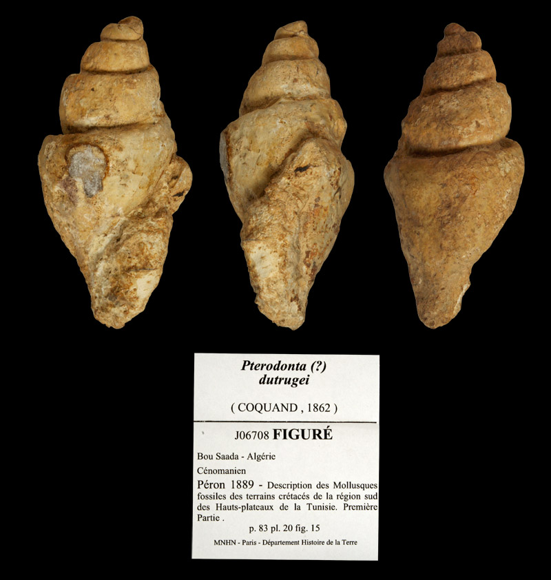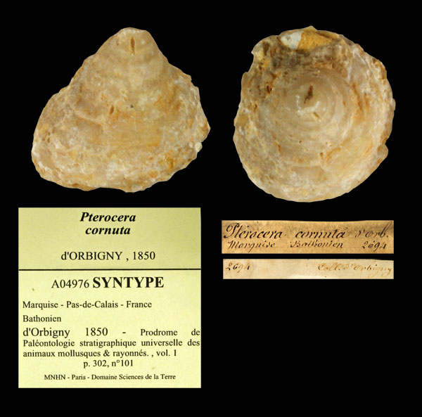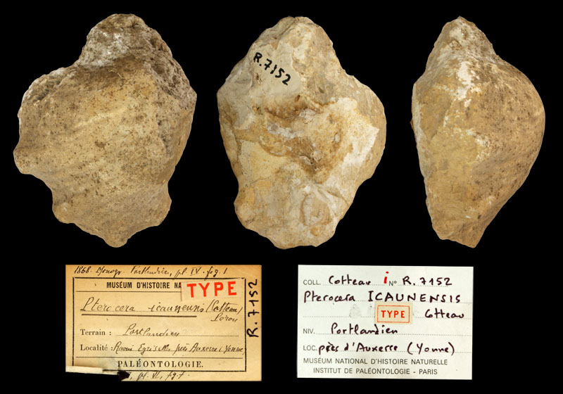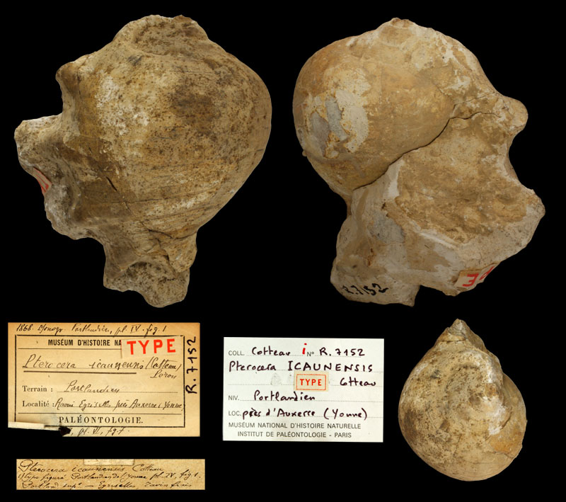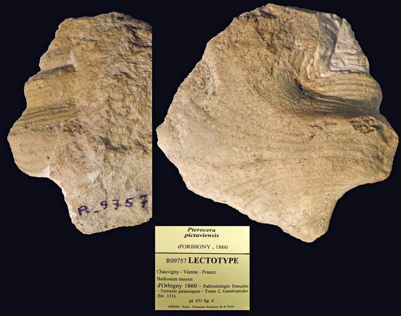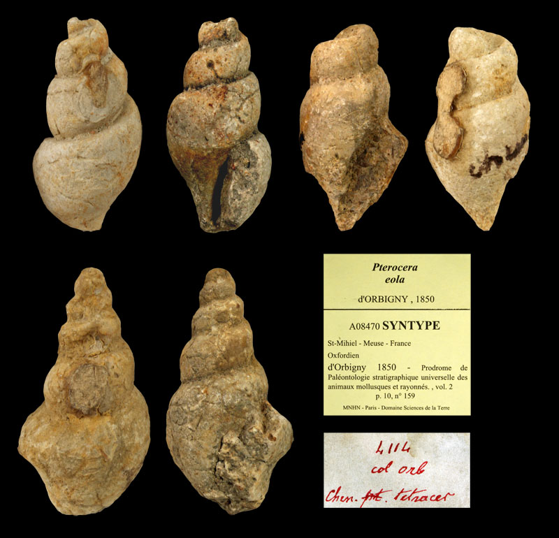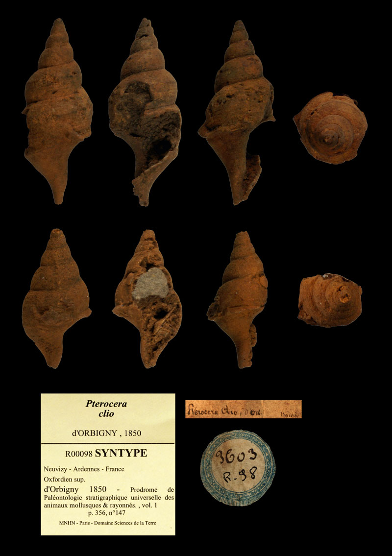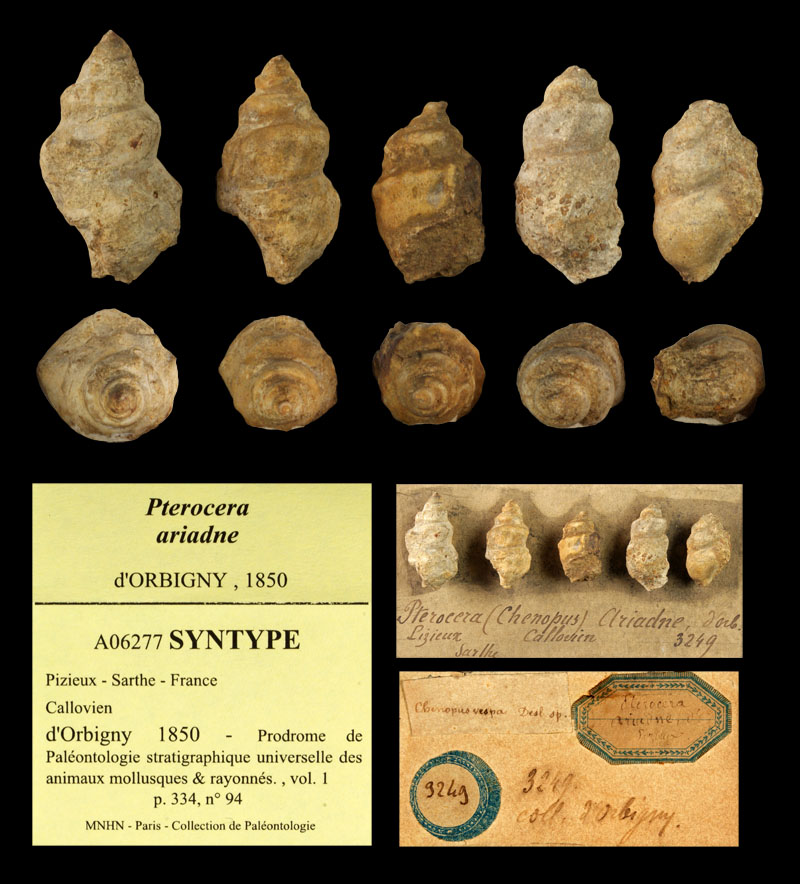 ![]() Pterocera arsinoe d'Orbigny, 1850; Lectotype; Callovian, middle Jurassic; Villers-sur-Mer, Calvados Department, France; Coll. MNHN no. R63536 ; Copyright MNHN ![]() Aporrhais intermedius Piette, 1869; Kimmeridgian, upper Jurassic; Daillancourt, Haute-Marne Department, France; Coll. MNHN no. R198; Copyright MNHN ![]() Pterocera glaucus d'Orbigny, 1850; Kimmeridgian, upper Jurassic; Villerville, Calvados Department, France; Coll. MNHN no. A09765; Copyright MNHN ![]() Pterocerus radix (Brongniart, 1823); Holotype; Priabonian, upper Eocene; Monte Grumi, Castelgomberto, Vicenza Province, Veneto Region, Italy; Coll. MNHN no. R53076; Copyright MNHN ![]() Strombus bonelli Brongniart, 1823; Paralectotype 1; Aquitanian, lower Miocene; Turin, Metropolitan City, Piedmont Region, Italy; Coll. MNHN no. R64078; Copyright MNHN ![]() Strombus bonelli Brongniart, 1823; Paralectotype 2; Aquitanian, lower Miocene; Turin, Metropolitan City, Piedmont Region, Italy; Coll. MNHN no. R64078; Copyright MNHN ![]() Strombus locardi Thomas & Peron, 1889; Syntype; Cenomanian, upper Cretaceous; El-Aïeïcha, Tunesia; 30 mm; Coll. MNHN no. B19205; Copyright MNHN ![]() Monocuphus vespa Eudes-Deslongchamps, 1843; Bathonian, middle Jurassic; Les Pichottes, Pas-de-Calais Department, France; 23 mm, 17 mm; Coll. MNHN; Copyright MNHN ![]() Pterocera amyntas (d'Orbigny, 1850); Syntype; Callovian, middle Jurassic; Pizieux, Sarthe Department, France; Coll. MNHN no. A06280; Copyright MNHN ![]() Pterocera amyntas (d'Orbigny, 1850); Syntype; Callovian, middle Jurassic; Pizieux, Sarthe Department, France; 19.5 mm; Coll. MNHN no. A06278; Copyright MNHN ![]() Pterocera aglaia d'Orbigny, 1850; Callovian, middle Jurassic; Chaumont, Haute-Marne Department, France; Coll. MNHN no. A06281; Copyright MNHN ![]() Spinigera compressa (d'Orbigny, 1850); Callovian, middle Jurassic; Pizieux, Sarthe Department, France; 17 mm; Coll. MNHN no. A06284; Copyright MNHN ![]() Spinigera compressa (d'Orbigny, 1850); Callovian, middle Jurassic; Montreuil-Bellay, Maine-et-Loire Department, France; 27 mm; Coll. MNHN no. J00825; Copyright MNHN ![]() Pterocera meslei Thomas and Peron, 1889; Maastrichtian, upper Cretaceous; Chebika, Tozeur Governorate, Tunesia; 85 mm; Coll. MNHN no. B19211; Copyright MNHN ![]() Pterocera cotteaui Thomas & Peron, 1889; Syntype; Santonian, upper Cretaceous; Khanget Mezouna, Tunesia; 38 mm; Coll. MNHN no. B19210; Copyright MNHN ![]() Pterocera cotteaui Thomas & Peron, 1889; Syntype; Santonian, upper Cretaceous; Medjès el Foukani, Algeria; 47 mm; Coll. MNHN no. B19961; Copyright MNHN ![]() Pterocera cotteaui Thomas & Peron, 1889; Syntype; Santonian, upper Cretaceous; Djelfa, Djelfa Province, Algeria; 34 mm; Coll. MNHN no. B19962; Copyright MNHN ![]() Pterocera coquandi Thomas & Peron, 1889; Syntype; Santonian, upper Cretaceous; Djebel Sidi bou Ghanem, Tunesia; 38 mm; Coll. MNHN no. B19209; Copyright MNHN ![]() Pterocera polycera (d'Orbigny, 1843); Syntype; Cenomanian, upper Cretaceous; Ile Madame, Charente-Maritime Department, France; Coll. MNHN no. R10043; Copyright MNHN ![]() Strombus (Pugnellus) auriculatus (Woods, 1906); Cretaceous; Satria, Ambovombe-Androy, Toliary, Madagascar; Coll. MNHN no. R06534; Copyright MNHN ![]() Strombus (Pugnellus) auriculatus difformis (Woods, 1906); Cretaceous; Satria, Ambovombe-Androy, Toliary, Madagascar; 39 mm; Coll. MNHN no. R06513; Copyright MNHN ![]() Pugnellus bilobatus Dartevelle & Brebion, 1956; Syntype; Campanian, upper Cretaceous; Logbatjeck, Edea Region, Cameroon; Coll. MNHN no. R61097; Copyright MNHN ![]() Pugnellus hourcqui Brebion, 1956; Syntype; "Senonian", upper Cretaceous; Fernan Vaz, Gabon; Coll. MNHN no. R6775; Copyright MNHN ![]() Pterodonta naticoides d'Orbigny, 1850; Syntype; Turonian, upper Cretaceous; Uchaux, Vaucluse, Provence-Alpes-Côte d'Azur, France; Coll. MNHN A52378; Photo: Jocelyn Falconnet; Copyright MNHN ![]() Pterodonta elongata d'Orbigny, 1843; Lectotype; Cenomanian, upper Cretaceous; Ile Madame, Charente-Maritime, Poitou-Charentes, France; Coll. MNHN B74377; Photo: Jocelyn Falconnet; Copyright MNHN ![]() Pterodonta elongata d'Orbigny, 1843; Paralectotype; Cenomanian, upper Cretaceous; Ile Madame, Charente-Maritime, Poitou-Charentes, France; Coll. MNHN A52050; Photo: Jocelyn Falconnet; Copyright MNHN ![]() Pterodonta elongata d'Orbigny, 1843; Paralectotype; Cenomanian, upper Cretaceous; Ile Madame, Charente-Maritime, Poitou-Charentes, France; Coll. MNHN A52051; Photo: Jocelyn Falconnet; Copyright MNHN ![]() Pterodonta elongata d'Orbigny, 1843; Paralectotype; Cenomanian, upper Cretaceous; Ile Madame, Charente-Maritime, Poitou-Charentes, France; Coll. MNHN A52052; Photo: Jocelyn Falconnet; Copyright MNHN ![]() Pterodonta elongata d'Orbigny, 1843; Paralectotype; Cenomanian, upper Cretaceous; Ile Madame, Charente-Maritime, Poitou-Charentes, France; Coll. MNHN A52053; Photo: Jocelyn Falconnet; Copyright MNHN ![]() Pterodonta elongata d'Orbigny, 1843; Paralectotype; Cenomanian, upper Cretaceous; Rochefort, Charente-Maritime, Poitou-Charentes, France; Coll. MNHN A52055; Photo: Jocelyn Falconnet; Copyright MNHN ![]() Pterodonta elongata d'Orbigny, 1843; Paralectotype; Cenomanian, upper Cretaceous; Rochefort, Charente-Maritime, Poitou-Charentes, France; Coll. MNHN A52056; Photo: Jocelyn Falconnet; Copyright MNHN ![]() Pterodonta elongata d'Orbigny, 1843; Paralectotype; Cenomanian, upper Cretaceous; Rochefort, Charente-Maritime, Poitou-Charentes, France; Coll. MNHN A52054; Photo: Jocelyn Falconnet; Copyright MNHN http://www.stromboidea.de/bilder/Pterodonta_elongata_ORBIGNY_1843_Paralectotype_ A52094.jpg Pterodonta elongata d'Orbigny, 1843; Paralectotype; Cenomanian, upper Cretaceous; Rochefort, Charente-Maritime, Poitou-Charentes, France; Coll. MNHN A52094; Photo: Jocelyn Falconnet; Copyright MNHN ![]() Pterodonta inflata d'Orbigny, 1843; Cenomanian, upper Cretaceous; El Ménia (formerly El Goléa), El Ménia District, Ghardaïa Province, Algeria; 24 mm; Coll. MNHN no