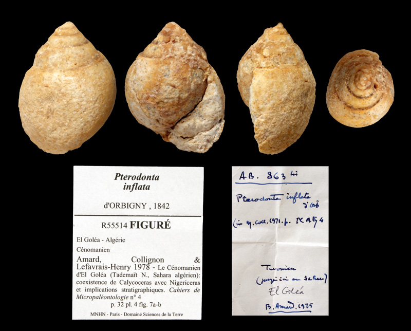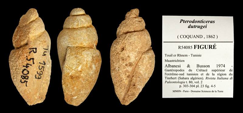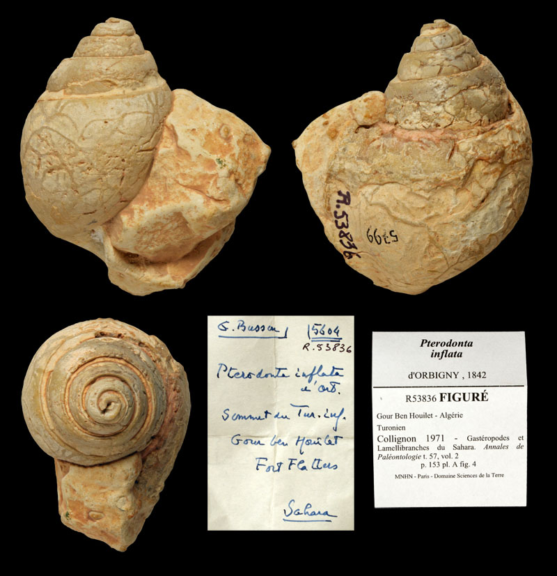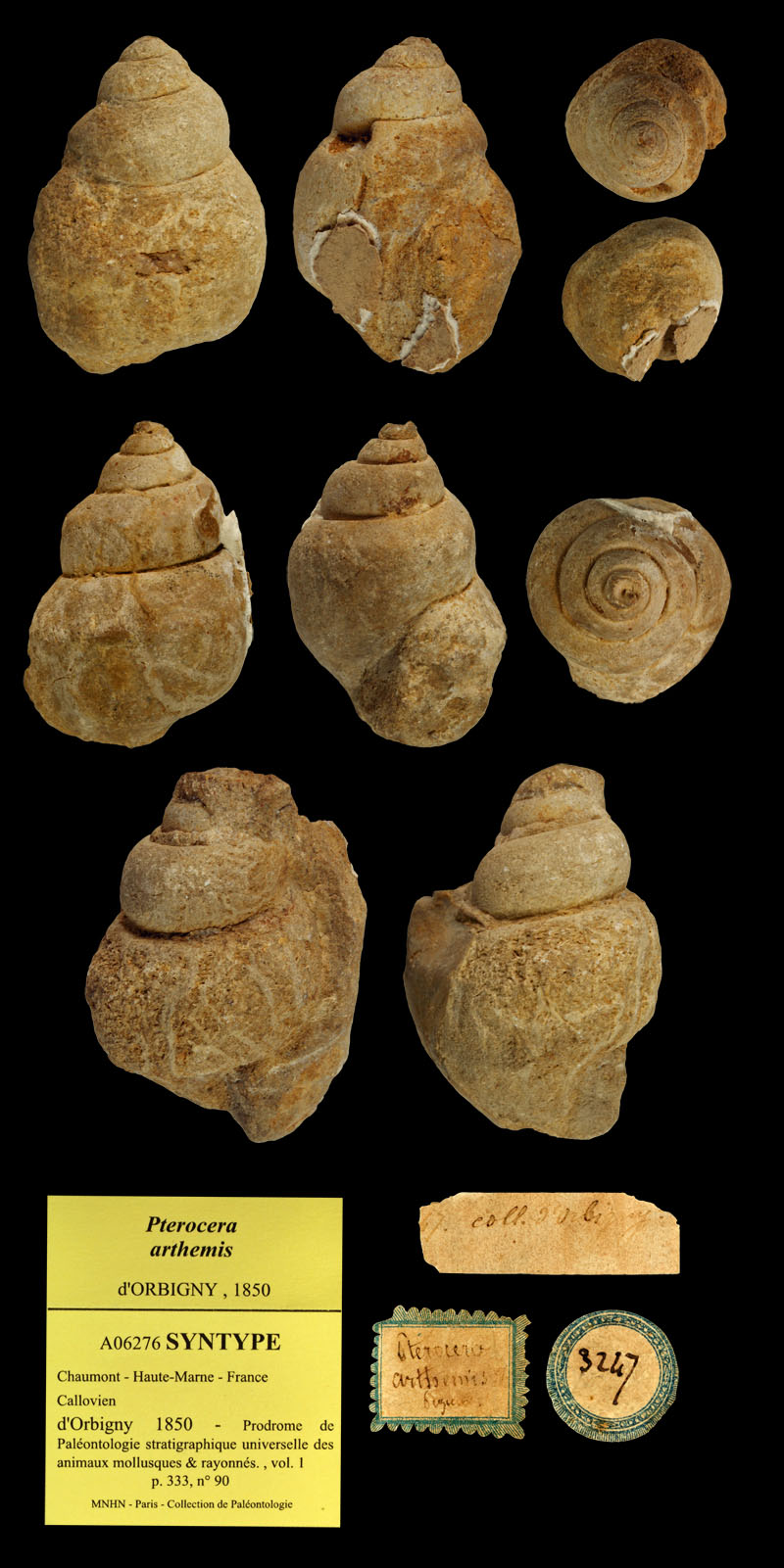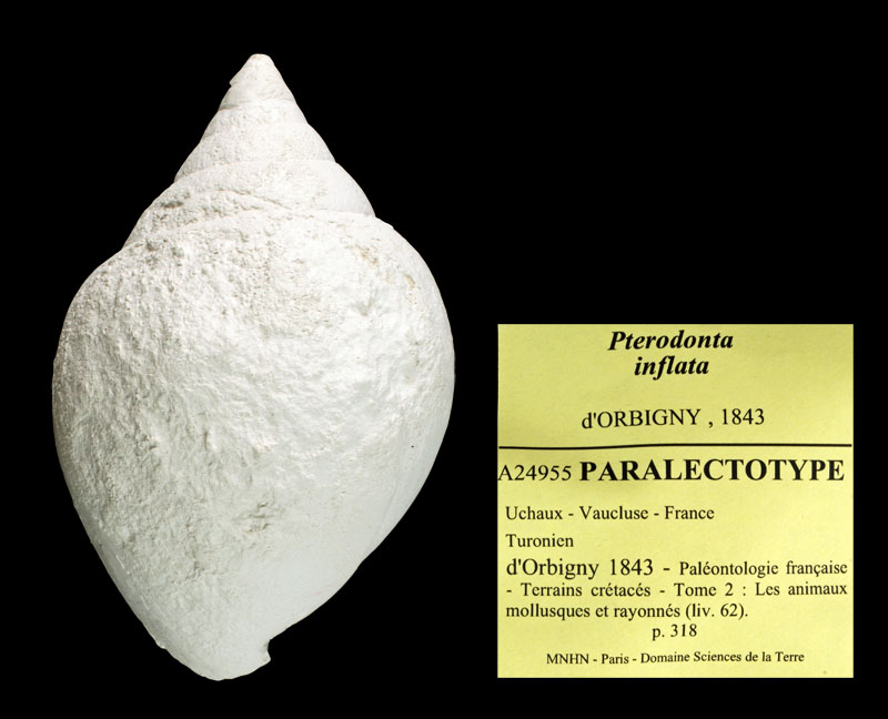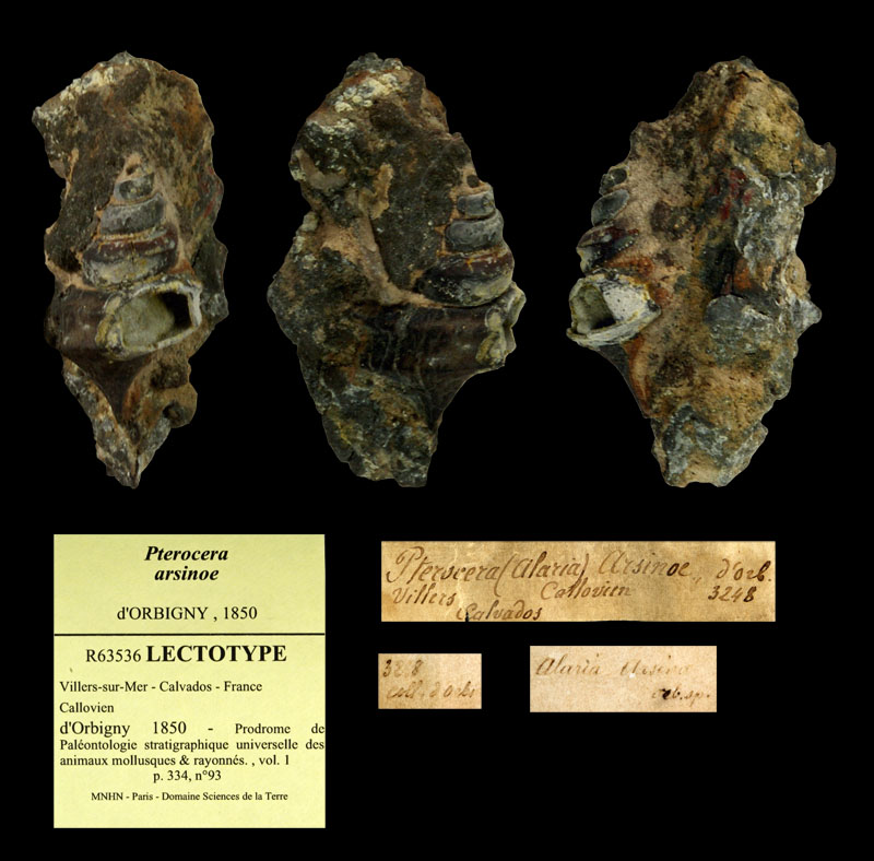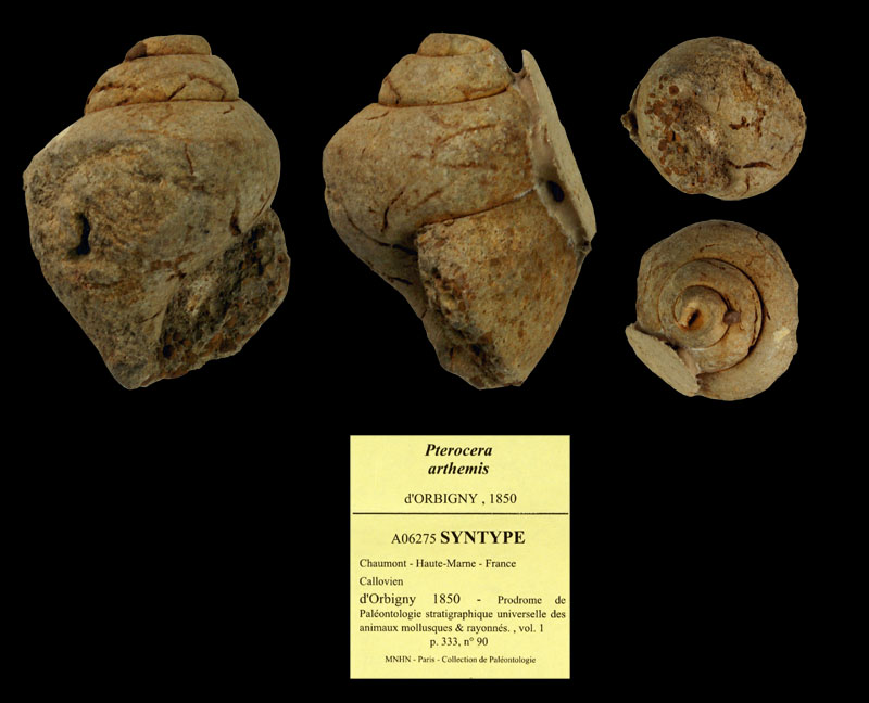 ![]() Pterocera arsinoe d'Orbigny, 1850; Lectotype; Callovian, middle Jurassic; Villers-sur-Mer, Calvados Department, France; Coll. MNHN no. R63536 ; Copyright MNHN ![]() Aporrhais intermedius Piette, 1869; Kimmeridgian, upper Jurassic; Daillancourt, Haute-Marne Department, France; Coll. MNHN no. R198; Copyright MNHN ![]() Pterocera glaucus d'Orbigny, 1850; Kimmeridgian, upper Jurassic; Villerville, Calvados Department, France; Coll. MNHN no. A09765; Copyright MNHN ![]() Pterocerus radix (Brongniart, 1823); Holotype; Priabonian, upper Eocene; Monte Grumi, Castelgomberto, Vicenza Province, Veneto Region, Italy; Coll. MNHN no. R53076; Copyright MNHN ![]() Strombus bonelli Brongniart, 1823; Paralectotype 1; Aquitanian, lower Miocene; Turin, Metropolitan City, Piedmont Region, Italy; Coll. MNHN no. R64078; Copyright MNHN ![]() Strombus bonelli Brongniart, 1823; Paralectotype 2; Aquitanian, lower Miocene; Turin, Metropolitan City, Piedmont Region, Italy; Coll. MNHN no. R64078; Copyright MNHN ![]() Strombus locardi Thomas & Peron, 1889; Syntype; Cenomanian, upper Cretaceous; El-Aïeïcha, Tunesia; 30 mm; Coll. MNHN no. B19205; Copyright MNHN ![]() Monocuphus vespa Eudes-Deslongchamps, 1843; Bathonian, middle Jurassic; Les Pichottes, Pas-de-Calais Department, France; 23 mm, 17 mm; Coll. MNHN; Copyright MNHN ![]() Pterocera amyntas (d'Orbigny, 1850); Syntype; Callovian, middle Jurassic; Pizieux, Sarthe Department, France; Coll. MNHN no. A06280; Copyright MNHN ![]() Pterocera amyntas (d'Orbigny, 1850); Syntype; Callovian, middle Jurassic; Pizieux, Sarthe Department, France; 19.5 mm; Coll. MNHN no. A06278; Copyright MNHN ![]() Pterocera aglaia d'Orbigny, 1850; Callovian, middle Jurassic; Chaumont, Haute-Marne Department, France; Coll. MNHN no. A06281; Copyright MNHN ![]() Spinigera compressa (d'Orbigny, 1850); Callovian, middle Jurassic; Pizieux, Sarthe Department, France; 17 mm; Coll. MNHN no. A06284; Copyright MNHN ![]() Spinigera compressa (d'Orbigny, 1850); Callovian, middle Jurassic; Montreuil-Bellay, Maine-et-Loire Department, France; 27 mm; Coll. MNHN no. J00825; Copyright MNHN ![]() Pterocera meslei Thomas and Peron, 1889; Maastrichtian, upper Cretaceous; Chebika, Tozeur Governorate, Tunesia; 85 mm; Coll. MNHN no. B19211; Copyright MNHN ![]() Pterocera cotteaui Thomas & Peron, 1889; Syntype; Santonian, upper Cretaceous; Khanget Mezouna, Tunesia; 38 mm; Coll. MNHN no. B19210; Copyright MNHN ![]() Pterocera cotteaui Thomas & Peron, 1889; Syntype; Santonian, upper Cretaceous; Medjès el Foukani, Algeria; 47 mm; Coll. MNHN no. B19961; Copyright MNHN ![]() Pterocera cotteaui Thomas & Peron, 1889; Syntype; Santonian, upper Cretaceous; Djelfa, Djelfa Province, Algeria; 34 mm; Coll. MNHN no. B19962; Copyright MNHN ![]() Pterocera coquandi Thomas & Peron, 1889; Syntype; Santonian, upper Cretaceous; Djebel Sidi bou Ghanem, Tunesia; 38 mm; Coll. MNHN no. B19209; Copyright MNHN ![]() Pterocera polycera (d'Orbigny, 1843); Syntype; Cenomanian, upper Cretaceous; Ile Madame, Charente-Maritime Department, France; Coll. MNHN no. R10043; Copyright MNHN ![]() Strombus (Pugnellus) auriculatus (Woods, 1906); Cretaceous; Satria, Ambovombe-Androy, Toliary, Madagascar; Coll. MNHN no. R06534; Copyright MNHN ![]() Strombus (Pugnellus) auriculatus difformis (Woods, 1906); Cretaceous; Satria, Ambovombe-Androy, Toliary, Madagascar; 39 mm; Coll. MNHN no. R06513; Copyright MNHN ![]() Pugnellus bilobatus Dartevelle & Brebion, 1956; Syntype; Campanian, upper Cretaceous; Logbatjeck, Edea Region, Cameroon; Coll. MNHN no. R61097; Copyright MNHN ![]() Pugnellus hourcqui Brebion, 1956; Syntype; "Senonian", upper Cretaceous; Fernan Vaz, Gabon; Coll. MNHN no. R6775; Copyright MNHN ![]() Pterodonta naticoides d'Orbigny, 1850; Syntype; Turonian, upper Cretaceous; Uchaux, Vaucluse, Provence-Alpes-Côte d'Azur, France; Coll. MNHN A52378; Photo: Jocelyn Falconnet; Copyright MNHN ![]() Pterodonta elongata d'Orbigny, 1843; Lectotype; Cenomanian, upper Cretaceous; Ile Madame, Charente-Maritime, Poitou-Charentes, France; Coll. MNHN B74377; Photo: Jocelyn Falconnet; Copyright MNHN ![]() Pterodonta elongata d'Orbigny, 1843; Paralectotype; Cenomanian, upper Cretaceous; Ile Madame, Charente-Maritime, Poitou-Charentes, France; Coll. MNHN A52050; Photo: Jocelyn Falconnet; Copyright MNHN ![]() Pterodonta elongata d'Orbigny, 1843; Paralectotype; Cenomanian, upper Cretaceous; Ile Madame, Charente-Maritime, Poitou-Charentes, France; Coll. MNHN A52051; Photo: Jocelyn Falconnet; Copyright MNHN ![]() Pterodonta elongata d'Orbigny, 1843; Paralectotype; Cenomanian, upper Cretaceous; Ile Madame, Charente-Maritime, Poitou-Charentes, France; Coll. MNHN A52052; Photo: Jocelyn Falconnet; Copyright MNHN ![]() Pterodonta elongata d'Orbigny, 1843; Paralectotype; Cenomanian, upper Cretaceous; Ile Madame, Charente-Maritime, Poitou-Charentes, France; Coll. MNHN A52053; Photo: Jocelyn Falconnet; Copyright MNHN ![]() Pterodonta elongata d'Orbigny, 1843; Paralectotype; Cenomanian, upper Cretaceous; Rochefort, Charente-Maritime, Poitou-Charentes, France; Coll. MNHN A52055; Photo: Jocelyn Falconnet; Copyright MNHN ![]() Pterodonta elongata d'Orbigny, 1843; Paralectotype; Cenomanian, upper Cretaceous; Rochefort, Charente-Maritime, Poitou-Charentes, France; Coll. MNHN A52056; Photo: Jocelyn Falconnet; Copyright MNHN ![]() Pterodonta elongata d'Orbigny, 1843; Paralectotype; Cenomanian, upper Cretaceous; Rochefort, Charente-Maritime, Poitou-Charentes, France; Coll. MNHN A52054; Photo: Jocelyn Falconnet; Copyright MNHN http://www.stromboidea.de/bilder/Pterodonta_elongata_ORBIGNY_1843_Paralectotype_ A52094.jpg Pterodonta elongata d'Orbigny, 1843; Paralectotype; Cenomanian, upper Cretaceous; Rochefort, Charente-Maritime, Poitou-Charentes, France; Coll. MNHN A52094; Photo: Jocelyn Falconnet; Copyright MNHN ![]() Pterodonta inflata d'Orbigny, 1843; Cenomanian, upper Cretaceous; El Ménia (formerly El Goléa), El Ménia District, Ghardaïa Province, Algeria; 24 mm; Coll. MNHN no
