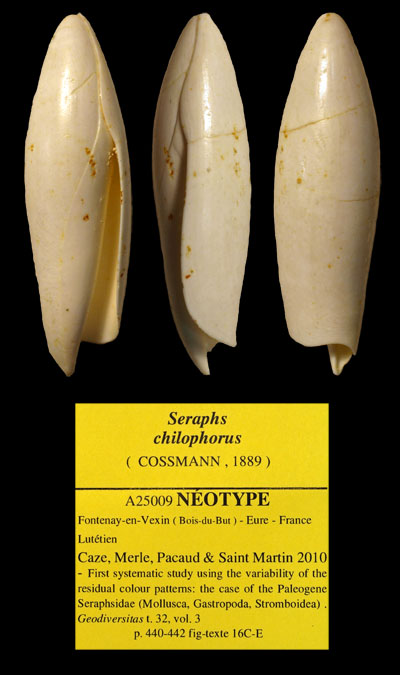 From their collection: ![]() Strombus olydius (Duclos, 1844); Holotype; Photo and Copyright MNHN ![]() Strombus athenius Duclos, 1844, syntypes; photos & copyright Muséum National D'Histoire Naturelle Paris MNHN-IM-2000-32907 ![]() Hippochrenes incrassata (Deshayes, 1865); Cuisian, Ypresian, lower Eocene; Mercin-et-Vaux, Aisne Department, France; 123 mm; Ex-coll. Schtrock; Coll. MNHN no. A25352; Copyright MNHN ![]() Paraseraphs tetanus Jung, 1974; Cuisian, Ypresian, lower Eocene; La Butte des Usages, Cuise-la-Motte, Oise Department, France; Coll. MNHN no. A28953; Copyright MNHN ![]() Paraseraphs tetanus Jung, 1974; Cuisian, Ypresian, lower Eocene; La Butte des Usages, Cuise-la-Motte, Oise Department, France; 23 mm; Coll. MNHN no. A28954; Copyright MNHN ![]() Seraphs leukoleptus Jung, 1974; Lutetian, middle Eocene; Les Garennes, Chaussy, Val-d'Oise, Île-de-France, France; Neotype; Coll. MNHN no. A28781; Copyright Museum national d'Histoire naturelle Paris ![]() Seraphs chilophorus (Cossmann, 1889); Neotype; Lutetian, middle Eocene; Bois-du-But, Fontenay-en-Vexin, Eure Department, France; Coll. MNHN no. A25009 ; Copyright MNHN ![]() Terebellopsis chantalae Pacaud & Leroy, 2006; Holotype; Cuisian, Ypresian, lower Eocene; Coeuvres-et-Valsery, Aisne Department, France; 40 mm; Coll. MNHN no. R64549; Copyright MNHN ![]()