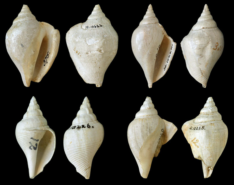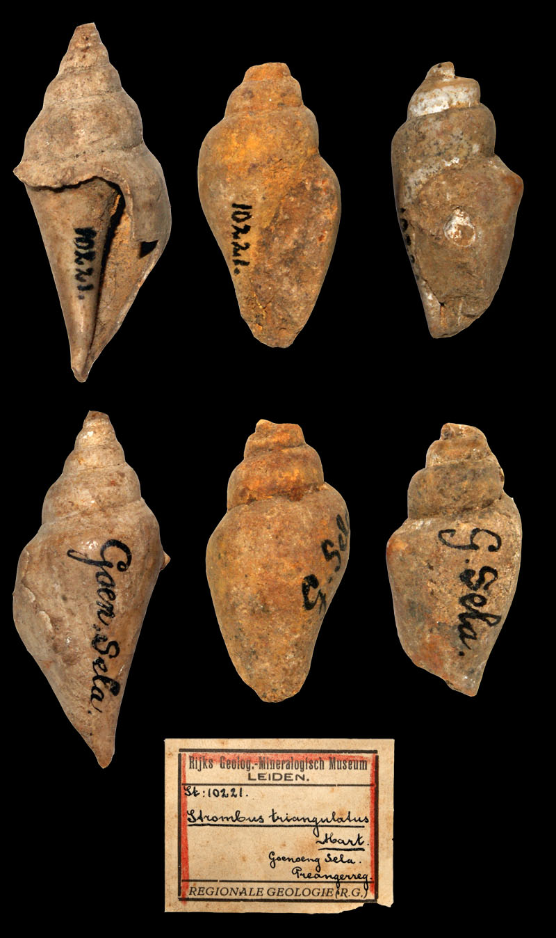 Internet from their collections: ![]() Margistrombus simanoki Liverani, 2013; Holotype; Tapaktuan, Aceh Province, northern end of Sumatra Island, Indonesia; 53,6 mm; Coll. Naturalis Leiden; Copyright Naturalis Leiden ![]() Dientomochilus ickei Martin, 1914; Holotype; middle Eocene; Kali Puru, Central Java Province, Java Island, Indonesia; 10,5 mm; Coll. Naturalis no. RGM 10330; Copyright Naturalis Leiden ![]() Rostellaria javana (Martin, 1879); Syntype; Miocene; Java Island, Indonesia; Coll. Naturalis no. RGM.10288; Copyright Naturalis Leiden ![]() Dientomochilus javanus (Martin, 1879); Syntype; Miocene; Java Island, Indonesia; In Leloux & Wesselingh, 2009; Coll. Naturalis no. RGM 10288; Copyright Naturalis Leiden ![]() Rimella tjilonganensis (Martin, 1899); Syntype; upper Miocene; Tjilintung, Java Island, Indonesia; Coll. Naturalis no. RGM 10306; Copyright Naturalis Leiden ![]() Rimella tjilonganensis (Martin, 1899); Syntypes; upper Miocene; Tjilintung, Java Island, Indonesia; In Leloux & Wesselingh, 2009; Coll. Naturalis nos. RGM 10305, 10306, 10308 and 10309a; Copyright Naturalis Leiden ![]() Jogjacartanus sultani (Martin, 1914); Holotype; middle Eocene; Kali Puru, Central Java Province, Java Island, Indonesia; In Leloux & Wesselingh, 2009; Coll. Naturalis no. RGM 10351; Copyright Naturalis Leiden ![]() Canarium rembangenense (Martin, 1899); Holotype; Rembang Beds, Tawum Fm., middle Miocene; near Sedan, Central Java Province, Java Island, Indonesia; In Leloux & Wesselingh, 2009; Coll. Naturalis no. RGM 10199; Copyright Naturalis Leiden ![]() Canarium spolongense (Martin, 1916); Syntypes; West Progo Beds, lower Miocene; Gunung Spolong, Yogyakarta Special Region, Java Island, Indonesia; In Leloux & Wesselingh, 2009; Coll. Naturalis no. RGM 10252, 10253a and 10254a; Copyright Naturalis Leiden ![]() Strombus spolongensis (Martin, 1916); Gunung Spolong, Yogyakarta Special Region, Java Island, Indonesia; Coll. Naturalis no. RGM 10253; Copyright Naturalis Leiden ![]() Canarium (Canarium) plicatus (Lamarck, 1816); Plio./Pleistocene; Nias Island, North Sumatra Province, Sumatra Island, Indonesia; Coll. Naturalis; Copyright Naturalis Leiden ![]() Canarium (Canarium) plicatus (Lamarck, 1816); Plio./Pleistocene; Nias Island, North Sumatra Province, Sumatra Island, Indonesia; Coll. Naturalis; Copyright Naturalis Leiden ![]() Canarium (Canarium) plicatus var. ustulatus (Schumacher, 1817); Plio./Pleistocene; Nias Island, North Sumatra Province, Sumatra Island, Indonesia; Coll. Naturalis; Copyright Naturalis Leiden ![]() Canarium (Canarium) plicatus var. ustulatus (Schumacher, 1817); Plio./Pleistocene; Nias Island, North Sumatra Province, Sumatra Island, Indonesia; Coll. Naturalis; Copyright Naturalis Leiden ![]() Strombus plicatus (Lamarck, 1816); Oi Kloi, West Timor Island, Indonesia; Coll. Naturalis; Copyright Naturalis Leiden ![]() Strombus plicatus (Lamarck, 1816); Coll. Naturalis; Copyright Naturalis Leiden ![]() Strombus gendinganensis Martin, 1899; Holotype; Pliocene; Java Island, Indonesia; Coll. Naturalis no. RGM 10244; Copyright Naturalis Leiden ![]() Terebellum (Terebellum) cinctum Martin, 1916; Holotype; West Progo Beds, lower Miocene; Kembang Sokkoh, Java Island, Indonesia; In Leloux & Wesselingh, 2009; Coll. Naturalis no. RGM 10337; Copyright Naturalis Leiden ![]() Terebellum papilliferum Martin, 1916; Syntypes; lower Miocene; Gunung Spolong, Yogyakarta Special Region, Java Island, Indonesia; 27 mm, 20 mm and 26 mm; In Leloux & Wesselingh, 2009; Coll. Naturalis nos. RGM 10339a, 10341a and 47059a; Copyright Naturalis Leiden ![]() Terebellum papilliferum Martin, 1916; Syntype; lower Miocene; Gunung Spolong, Yogyakarta Special Region, Java Island, Indonesia; 27 mm; Coll. Naturalis no. RGM 10339; Copyright Naturalis Leiden ![]() Seraphs squamosum (Martin, 1914); Syntypes; Nanggulan Formation, middle Eocene; Kali Songo River, Java Island, Indonesia; 16 mm, 18 mm, 17 mm, 40 mm, 39 mm, 36 mm and 40 mm; In Leloux & Wesselingh, 2009 ![]() Seraphs squamosum (Martin, 1914); Syntype; Nanggulan Formation, middle Eocene; Kali Songo River, Java Island, Indonesia; 36 mm; Coll. Naturalis no. RGM 10344; Copyright Naturalis Leiden ![]() Canarium unifasciatum (Martin, 1884); Syntype; Miocene; Yogyakarta, Java Island, Indonesia; Coll. Naturalis no. RGM 10245; Copyright Naturalis Leiden ![]() Canarium unifasciatum (Martin, 1884); Syntype; Miocene; Yogyakarta, Java Island, Indonesia; In Leloux & Wesselingh, 2009; Coll. Naturalis no. RGM 10249a; Copyright Naturalis Leiden ![]() Canarium bawenauruensis Wissema, 1947; Holotype; Plio./Pleistocene; Bawonauru, Nalawo Valley, Nias Island, North Sumatra Province, Sumatra Island, Indonesia; 28 mm; Coll. Naturalis; Copyright Naturalis Leiden ![]() Canarium bawenauruensis Wissema, 1947; Paratype; Plio./Pleistocene; Bawonauru, Nalawo Valley, Nias Island, North Sumatra Province, Sumatra Island, Indonesia; 40 mm; Coll. Naturalis; Copyright Naturalis Leiden ![]() Strombus sedanensis (Martin, 1899); Syntype; lower Miocene; near Sedan, Central Java Province, Java Island, Indonesia; In Leloux & Wesselingh, 2009; Coll. Naturalis no. RGM 10198; Copyright Naturalis Leiden ![]() Strombus sedanensis (Martin, 1899); Syntype; lower Miocene; near Sedan, Central Java Province, Java Island, Indonesia; Coll. Naturalis no. RGM 10198; Copyright Naturalis Leiden ![]() Canarium (Labiostrombus) labiosus->Species.DolomenaAbbotti]] (W. Wood, 1828); Pleisto-Pliocene; Nias Island, North Sumatra Province, Sumatra Island, Indonesia; Coll. Naturalis; Copyright Naturalis Leiden ![]() Strombus fennemai (Martin, 1899); Pliocene; Noil-Noni-Pene; 36 mm; Coll. Naturalis no. 13820; Copyright Naturalis Leiden ![]() Strombus herklotsi Martin, 1879; Syntypes; upper Miocene, loc. “Junghuhn K”, Java Island, Indonesia; 28 mm, 36 mm and 74 mm, In Leloux & Wesselingh, 2009; Coll. Naturalis no. RGM 10186a, 10180a and 10179 ![]() Strombus tjilonganensis Martin, 1899; Syntype; Strombus inflatus, In Martin 1879, 