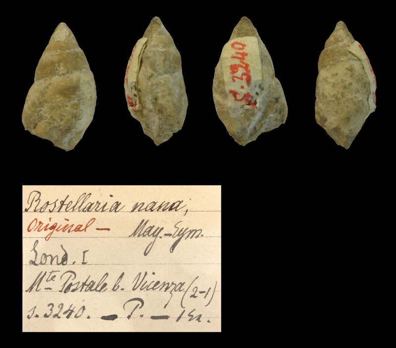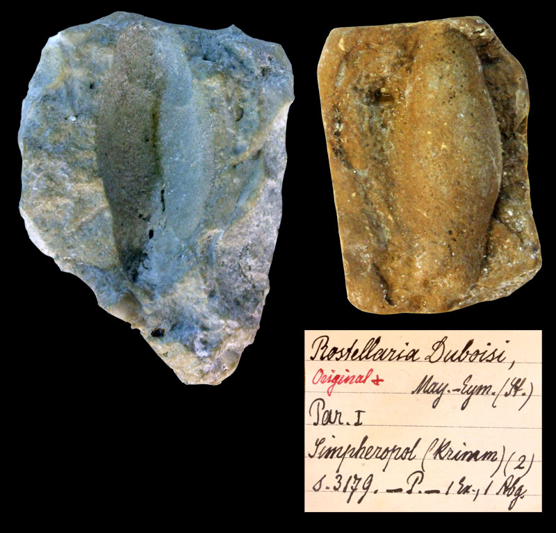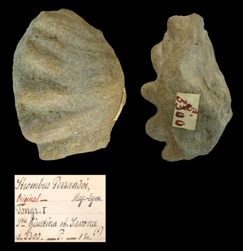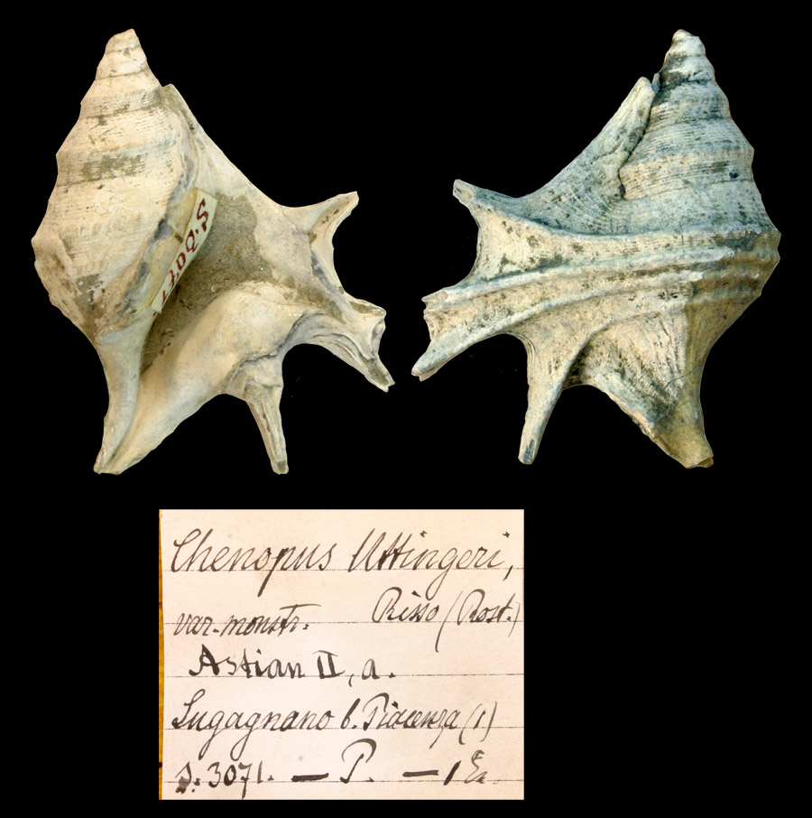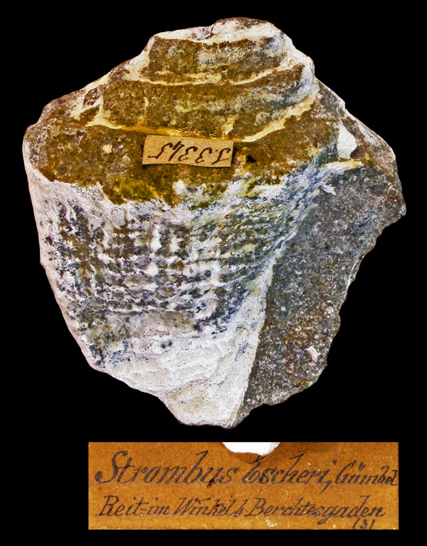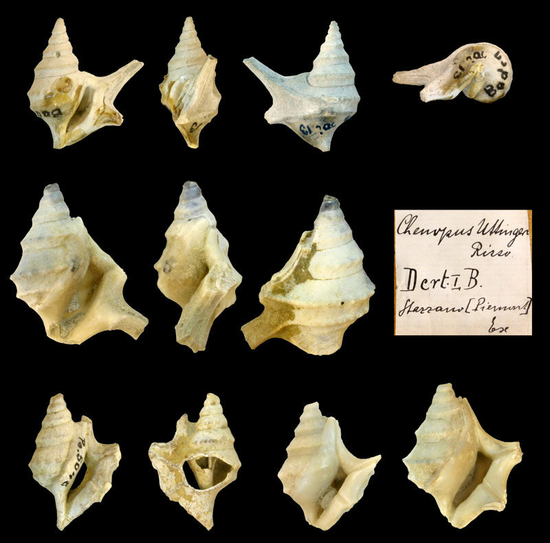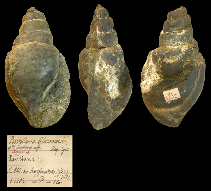 The Mayer-Eymar collection ![]() Strombus italicus Duclos, 1844; "Helvetian II", Miocene; Sao Vicente, Autonomous Region of Madeira, Madeira Island, Portugal; 238 mm; Coll. Mayer-Eymar no. Po.6240; Coll. ETH, Zürich ![]() Rostellaria tallavignesi Mayer-Eymar, 1888; Syntypes; Eocene; Monte Postale, NE of Bolca, Verona and Vicenza Provinces, Veneto Region, Italy; Coll. Mayer-Eymar no. s.3280; Coll. ETH, Zürich ![]() Rostellaria glaronensis Mayer-Eymar, 1866; Holotype; "Parisian I", Eocene; Koepfenstocks, Glarus, Switzerland; Coll. Mayer-Eymar no. s.3202; Coll. ETH, Zürich ![]() Rostellaria turgescens Mayer-Eymar, ?; Holotype; "Parisian I", Eocene; Kressenberg-Graben SW von Neukirchen, Landkreis/Stadt Traunstein, Bavaria, Germany; Coll. Mayer-Eymar no. s.3275; Coll. ETH, Zürich ![]() Rostellaria nana Mayer-Eymar, ?; Holotype not published; Eocene; Monte Postale, NE of Bolca, Verona and Vicenza Provinces, Veneto Region, Italy; Coll. Mayer-Eymar no. s.3240; Coll. ETH, Zürich ![]() Strombus perrandoi Mayer-Eymar, 1893; Holotype not published; Tongrian, Oligocene; Santa Giustina, Savona Province, Liguria Region, Italy; Coll. Mayer-Eymar no. vs.3300; Coll. ETH, Zürich ![]() Rostellaria strombiformis Mayer-Eymar, ?; Holotype; "Parisian I", Eocene; Simpheropol, Crimea, Russia; Coll. Mayer-Eymar no. s.3278; Coll. ETH, Zürich ![]() Rostellaria duboisi Mayer-Eymar, 1857; Holotype; "Parisian I", Eocene; Simpheropol, Crimea, Russia; Coll. Mayer-Eymar no. s.3179; Coll. ETH, Zürich ![]() Strombus (Oncoma) meneguzzoi Mayer-Eymar, ?; Holotype; "Parisian I", Eocene; Sauerbrunn, Switzerland; Coll. Mayer-Eymar no. s.3380; Coll. ETH, Zürich ![]() Strombus (Oncoma) meneguzzoi Mayer-Eymar, ?; "Parisian I", Eocene; Streckweid near Waag, Switzerland; 65 mm; Coll. Mayer-Eymar no. s.3381; Coll. ETH, Zürich ![]() Strombus escheri Gümbel, 1861; Reit im Winkel near Berchtesgarden, Germany; Coll. Mayer-Eymar no. s.3345; Coll. ETH, Zürich ![]() Rostellaria duboisi Mayer-Eymar, 1857; "Parisian I", Streckweid near Iberg, Blangg, Switzerland; Coll. Mayer-Eymar no. s.3178; Coll. ETH, Zürich ![]() Strombus (Oncoma) auriculatus Grateloup, 1834; Tongrian I, Oligocene; Monte Viale, Castelgomberto, Vicenza Province, Veneto Region, Italy; Coll. Mayer-Eymar no. s.3301; Coll. ETH, Zürich ![]() Pereiraea beyrichi Oppenheim, 1906; Eocene; Fajums, Egypt; Coll. Mayer-Eymar no. s.3123; Coll. ETH, Zürich; Photo Virgilio Liverani ![]() Rostellaria ampla (Solander in Brander, 1766); "Ligurian II", Eocene; Sangonini di Lugo, Vicentino, Italy; Coll. Mayer-Eymar no. s.3135; Coll. ETH, Zürich ![]() Pteroceras goniophora (Bellardi, 1852); Cavaso, Bassano, Italy; Coll. Mayer-Eymar no. vs.3298; Coll. ETH, Zürich ![]() Pteroceras goniophora (Bellardi, 1852); Scucsak near Cluj-Napoca (Sassag near Klausenburg), Cluj County, Cluj-Napoca metropolitan area, Romania; Coll. Mayer-Eymar, Coll. ETH, Zürich ![]() Eotibia lejeuni (Rouault, 1850); "Bartonian I", Eocene; Bosc d'Arras, Pau, Pyrénées-Atlantiques Department, France; Coll. Mayer-Eymar no. s.3206; Coll. ETH, Zürich ![]() Sulcogladius spiratus (Rouault, 1848); "Bartonian Ib", Eocene; Niederhorn, Thun BE, Switzerland; Coll. Mayer-Eymar no. s.3282; Coll. NMB no. H18317; Coll. ETH, Zürich; Photo Virgilio Liverani ![]() Rostellaria spirata (Rouault, 1848); "Bartonian Ib", Eocene; Niederhorn, Thun BE, Switzerland; Coll. Mayer-Eymar no. s.3282; Coll. NMB no. H18317; Coll. ETH, Zürich; Photo Virgilio Liverani ![]() Rostellaria hupei (Rouault, 1850); "Bartonian I", Eocene; Bosc d'Arros, Pau, Pyrénées-Atlantiques Department, France; Coll. Mayer-Eymar no. s.3201; Coll. ETH, Zürich ![]() Rostellaria turgescens Mayer-Eymar, ?; "Londinien I", Eocene; Monte Postale, NE of Bolca, Verona and Vicenza Provinces, Veneto Region, Italy; Coll. Mayer-Eymar no. s.3274; Coll. ETH, Zürich ![]() Chenopus speciosus var. margerini (De Koninck, 1838); "Tongrian I", lower Oligocene; Boom, Antwerpen, Belgium; Coll. Mayer-Eymar no. s.3051; Coll. ETH, Zürich ![]() Chenopus speciosus var. margerini (De Koninck, 1838); "Tongrian I", lower Oligocene; Boom, Antwerpen, Belgium; Coll. Mayer-Eymar no. s.3051, Coll. ETH, Zürich ![]() Chenopus uttingeri (Risso, 1826); "Dertonian I", Tortonian/Messinian, upper Miocene; Stazzano, Alessandria Province, Piedmont Region, Italy; Coll. Mayer-Eymar; Coll. ETH, Zürich ![]() Chenopus uttingeri (Risso, 1826); Freak; "Astian IIa", Pliocene; Lugagnano, Piacenza, Piacenza Province, Emilia-Romagna Region, Italy; Coll. Mayer-Eymar no. s.3071; Coll. ETH, Zürich ![]() Chenopus uttingeri (Risso, 1826); "Dertonian I", Tortonian/Messinian, upper Miocene; Stazzano, Alessandria Province, Piedmont Region, Italy; Coll. Mayer-Eymar; Coll. ETH, Zürich