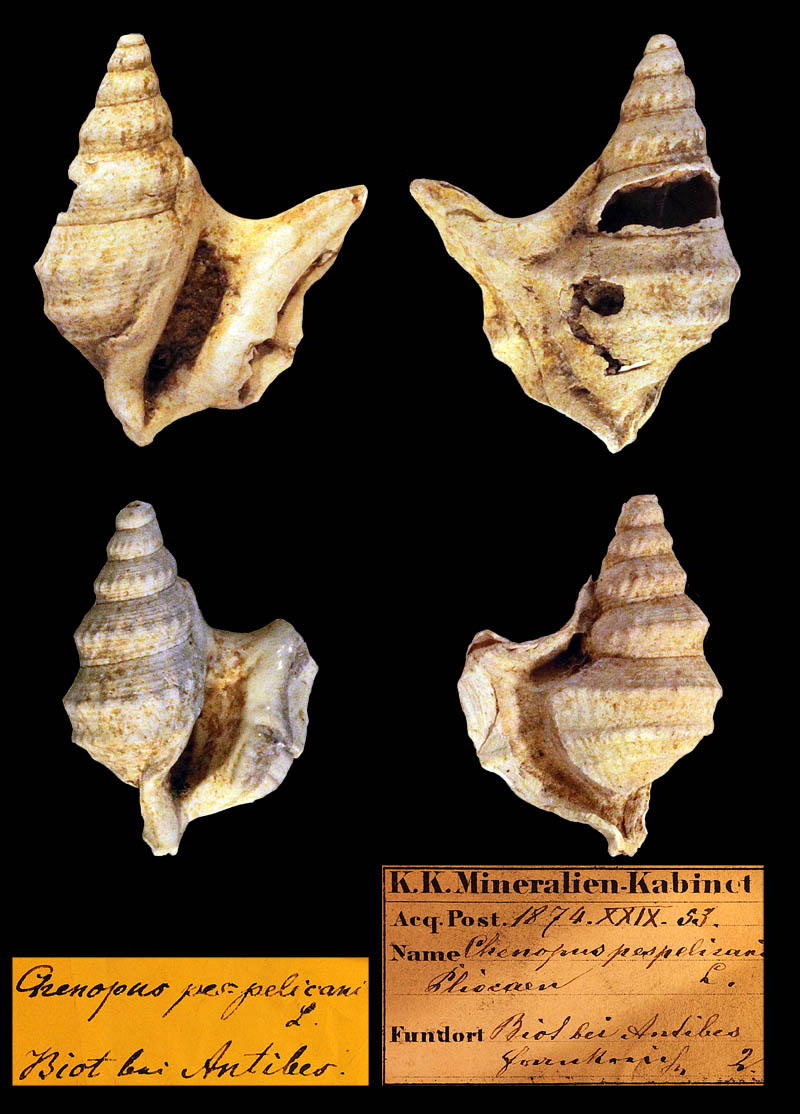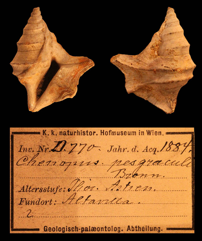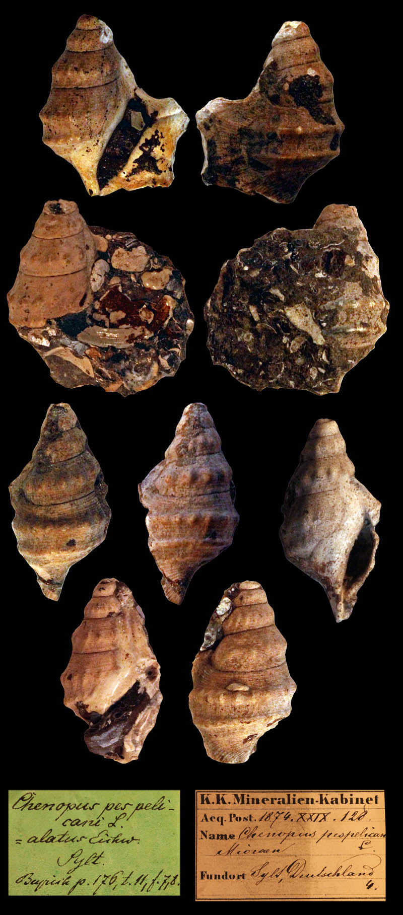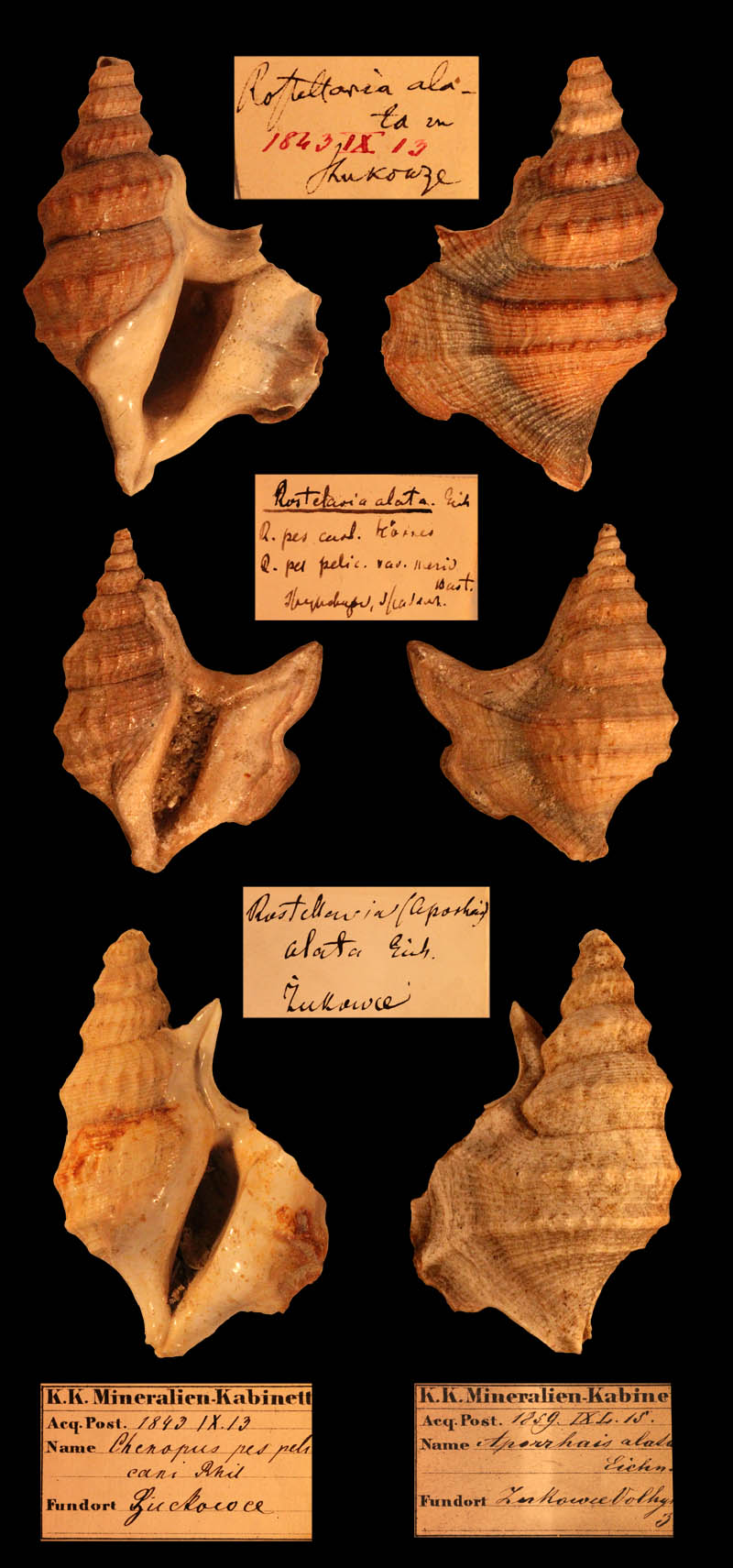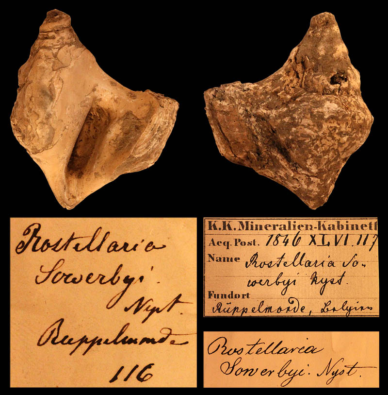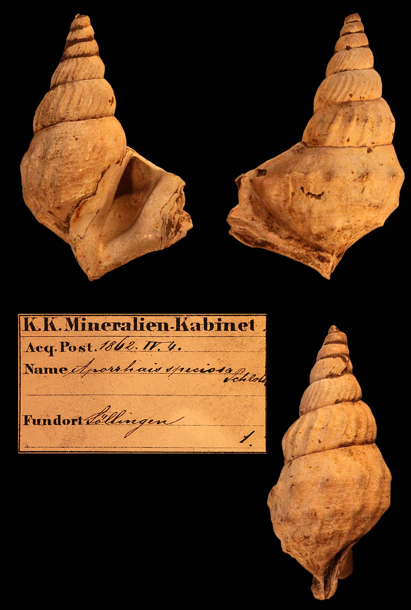 ![]() cf. Pletzachia sp.; Hofergraben, Gosau, Gmunden District, Upper Austria State, Austria; Coll. NHMW ![]() Phyllocheilus haueri (Zekeli, 1852); Gosau, Gmunden District, Upper Austria State, Austria; Coll. NHMW; Basis of drawing by Reuss, 1853, pl. 1, fig. 1 ![]() Rostellaria burmeisteri (Geinitz, 1846); Cretaceous; Tyssa, Czech Republic; Coll. NHMW ![]() Helicaulax granulatus (Sowerby, 1832); "Gosau-Schichten", upper Cretaceous; Nefgraben, Gosau, Gmunden District, Upper Austria State, Austria; Coll. NHMW ![]() Helicaulax granulatus (Sowerby, 1832); "Gosau-Schichten", upper Cretaceous; Windbach, Austria; Coll. NHMW ![]() Helicaulax cf. granulatus (Sowerby, 1832); "Gosau-Schichten", upper Cretaceous; Windbach, Austria; Coll. NHMW ![]() Helicaulax granulatus (Sowerby, 1832); "Gosau-Schichten", upper Cretaceous; Windbach, Austria; Coll. NHMW ![]() aff. Helicaulax granulatus (Sowerby, 1832); Tridorsatum-Zone, upper Turonian, upper Cretaceous; Strobl, Weißenbachtal, Salzburg State, Austria; Coll. NHMW ![]() Quadrinervus carinatus (Zekeli, 1852); lower Gosau Group, upper Cretaceous; Pletzach Alm, Kramsach, Tyrol State, Austria; 55 mm; Ex-coll. Herbert Gratt; Coll. NHMW no. 2008z0015/0004 ![]() Pletzachia furcata Kollmann, 2008; Paratype; lower Gosau Group, upper Cretaceous; Pletzach Alm, Kramsach, Tyrol State, Austria; Ex-coll. Herbert Gratt; Coll. NHMW ![]() Pletzachia furcata Kollmann, 2008; Paratype; lower Gosau Group, upper Cretaceous; Pletzach Alm, Kramsach, Tyrol State, Austria; Ex-coll. Herbert Gratt; Coll. NHMW ![]() Rostellaria kneri; Nagorzany; Coll. Naturhistorisches Museum Wien ![]() Pteroceras sp.; Priesen (Brezno), Coll. Naturhistorisches Museum Wien ![]() Guilfordia waageni Jahn, 1893, Brezno (Priesen), Czechia; Coll. Naturhistorisches Museum Wien ![]() Rostellaria divaricata; "Baculitenthon", Brezno (Priesen), Czech Republic; Coll. NHMW 1864 XII 145 ![]() Strombus coronatus, holotype of Persististrombus pannonicus Harzhauser & Kronenberg, 2013; Tortonian, upper Miocene; Ritzing, Burgenland State, Austria; Coll. NHMW no. 1930/0006/0058 ![]() Persististrombus pannonicus Harzhauser & Kronenberg, 2013; Badenian (Langhian), middle Miocene; Ritzing, Burgenland State, Austria; Coll. NHMW no. 2012/0025/0004 ![]() Persististrombus pannonicus Harzhauser & Kronenberg, 2013; Badenian (Langhian), middle Miocene; Ritzing, Burgenland State, Austria; Coll. NHMW no. 2012/0025/0002 ![]() Strombus bernielandaui (Harzhauser, 2007); Holotype; Warak Formation, Chattian, upper Oligocene; Gebel Madrakah, Oman; Coll. NHMW, No. 2006z0231/0035 ![]() Strombus bernielandaui (Harzhauser, 2007); Paratype; Warak Formation, Chattian, upper Oligocene; Gebel Madrakah, Oman; Coll. NHMW no. 2006z0231/0039 ![]() Persististrombus kronenbergi Harzhauser, 2009; Aquitanian, lower Miocene; Ras Tipuli, Lindi, Tanzania; pl. 3, fig, 4, 5; Coll. NHMW no. 2007z0181/0021 ![]() Strombus gijskronenbergi (Harzhauser, 2007); Paratype; Ghubbarah Formation, Aquitanian, lower Miocene; Gebel Madrakah, Oman; Coll. NHMW no. 2006z0231/0031 ![]() Persististrombus depertitus (Sowerby, 1840); Chasra Formation, Burdigalian, lower Miocene; Kankawati River, Gujarat State, Western India; Coll. NHMW no. 2008z0257/0013 ![]() Persististrombus daviesi (Dey, 1962); Quilon Limestone, lower Burdigalian, Miocene; Quilon, Kerala State, Malabar Coast, India; Coll. NHMW ![]() Strombus coronatus (Defrance, 1827); Pliocene; Larnaka, Cyprus Island; Coll. NHMW no. 1861/XLII/8 ![]() Strombus coronatus (Defrance, 1827); Pliocene; Larnaka, Cyprus Island; Coll. NHMW no. 1861/XLII/10 ![]() Strombus vokesae Landau, Kronenberg & Herbert, 2008; Holotype; Cercado Formation, upper Miocene; Rio Cana, area equivalent to NMB loc. no. 16832/16833 and TU 1230, Dominican Republic, Hispaniola Island, Greater Antilles, Caribbean; Length 220 mm, dorso-ventral height (restored) 165 mm, width 190 mm; Coll. NHMW no. 2007z0161/0001 ![]() Strombus schroeckingeri (Hörnes in Hörnes & Auinger, 1884); Badenian (Langhian), middle Miocene; Lapugiu de Sus (Lapugy), Hunedoara County, Transylvanian Region, Romania; Coll. NHMW no. 1855/XLIII/19 ![]() Strombus neugeboreni ?; Badenian (Langhian), middle Miocene; Lapugiu de Sus (Lapugy), Hunedoara County, Transylvanian Region, Romania; Coll. NHMW no. 1872/V/25 ![]() Strombus schroeckingeri (Hörnes in Hörnes & Auinger, 1884); lower Badenian (Langhian), middle Miocene; Costeiu de Sus (Kostej), Timis County, Banat Region, Transylvanian Basin, Romania; Coll. NHMW no. 1867/XIX/72 ![]() Strombus schroeckingeri (Hörnes in Hörnes & Auinger, 1884); lower Badenian (Langhian), middle Miocene; Costeiu de Sus (Kostej), Timis County, Banat Region, Transylvanian Basin, Romania; Coll. NHMW no. 1867/XIX/72 ![]() Europrotomus schroeckingeri (Hörnes in Hörnes & Auinger, 1884); lower Badenian (Langhian), middle Miocene; Costeiu de Sus (Kostej), Timis County, Banat Region, Transylvanian Basin, Romania; Coll. NHMW no. 2007z0114/0005 ![]() Europrotomus schroeckingeri (Hörnes in Hörnes & Auinger, 1884); lower Badenian (Langhian), middle Miocene; Costeiu de Sus (Kostej), Timis County, Banat Region, Transylvanian Basin, Romania; Coll. NHMW no. 2007z0114 ![]() Europrotomus schroeckingeri (Hörnes in Hörnes & Auinger, 1884); lower Badenian (Langhian), middle Miocene; Costeiu de Sus (Kostej), Timis County, Banat Region, Transylvanian Basin, Romania; Coll. NHMW no. 2007z0114 ![]() Europrotomus schroeckingeri (Hörnes in Hörnes & Auinger, 1884); lower Badenian, middle Miocene; Costeiu de Sus (Kostej), Timis County, Banat Region, Transylvanian Basin, Romania; Coll. NHMW no. 2007z0114 ![]() Europrotomus schroeckingeri (Hörnes in Hörnes & Auinger, 1884); lower Badenian, middle Miocene; Costeiu de Sus (Kostej), Timis County, Banat Region, Transylvanian Basin, Romania; Coll. NHMW no. 2007z0114 ![]() Strombus bonelli Brongniart, 1823; Miocene; Turin, Metropolitan City, Piedmont Region, Italy; Coll. NHMW no. 1862/XLIX/15 ![]() Strombus bonelli Brongniart, 1823; Mi