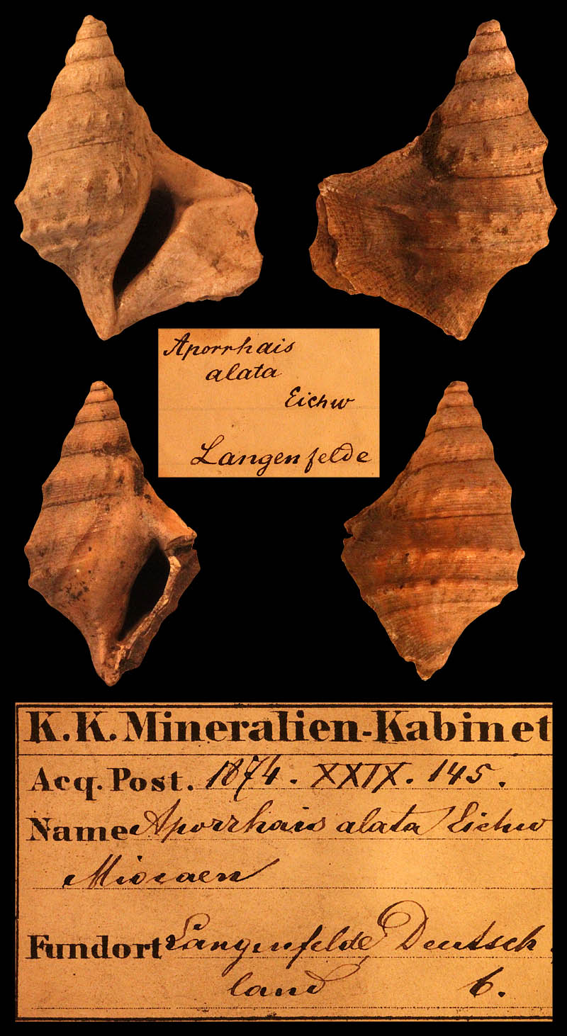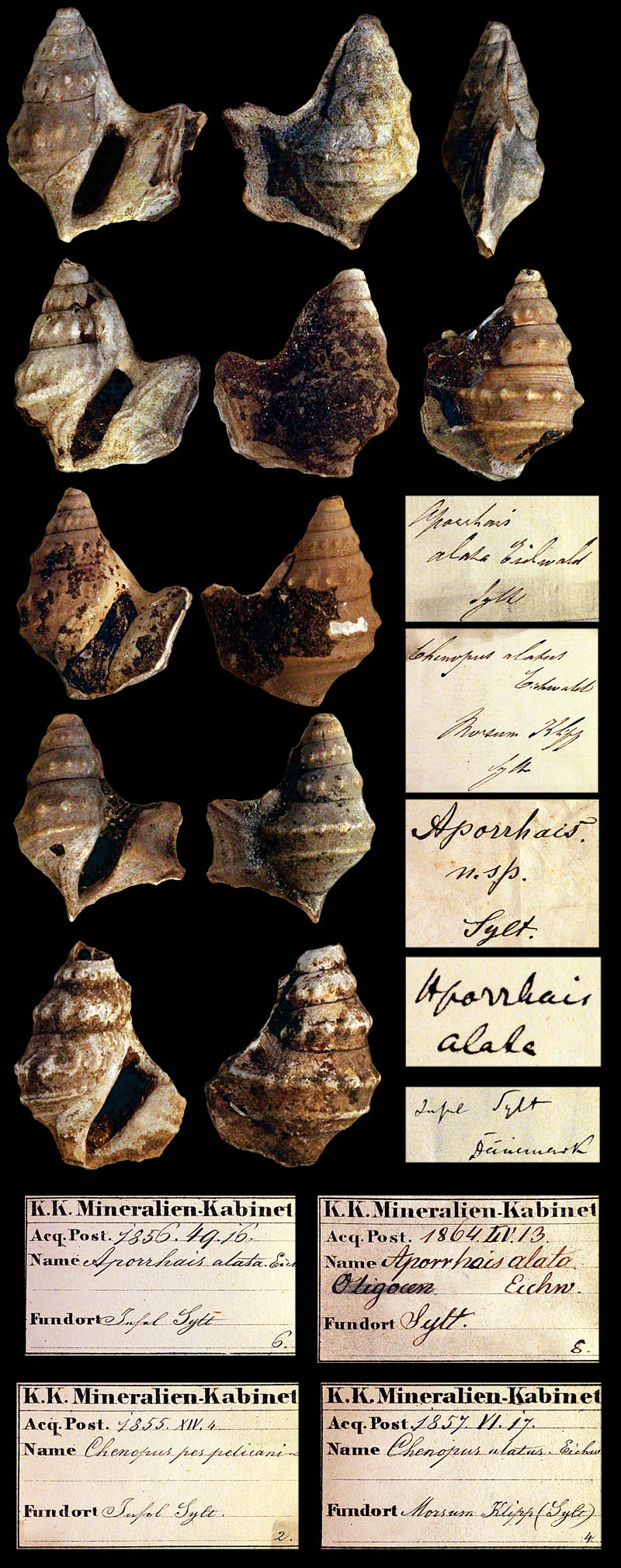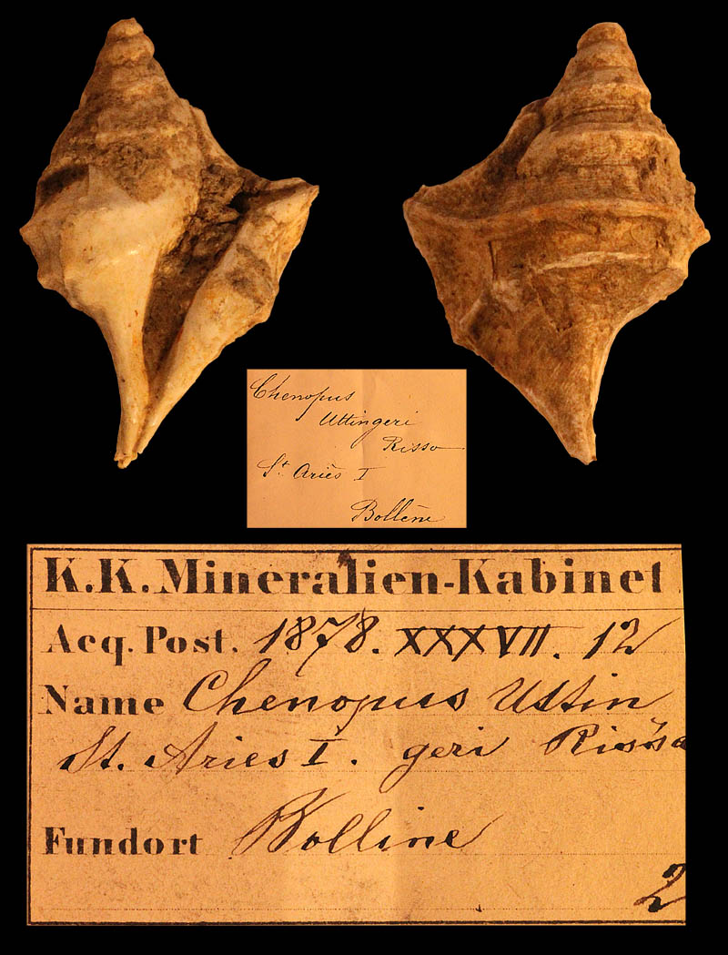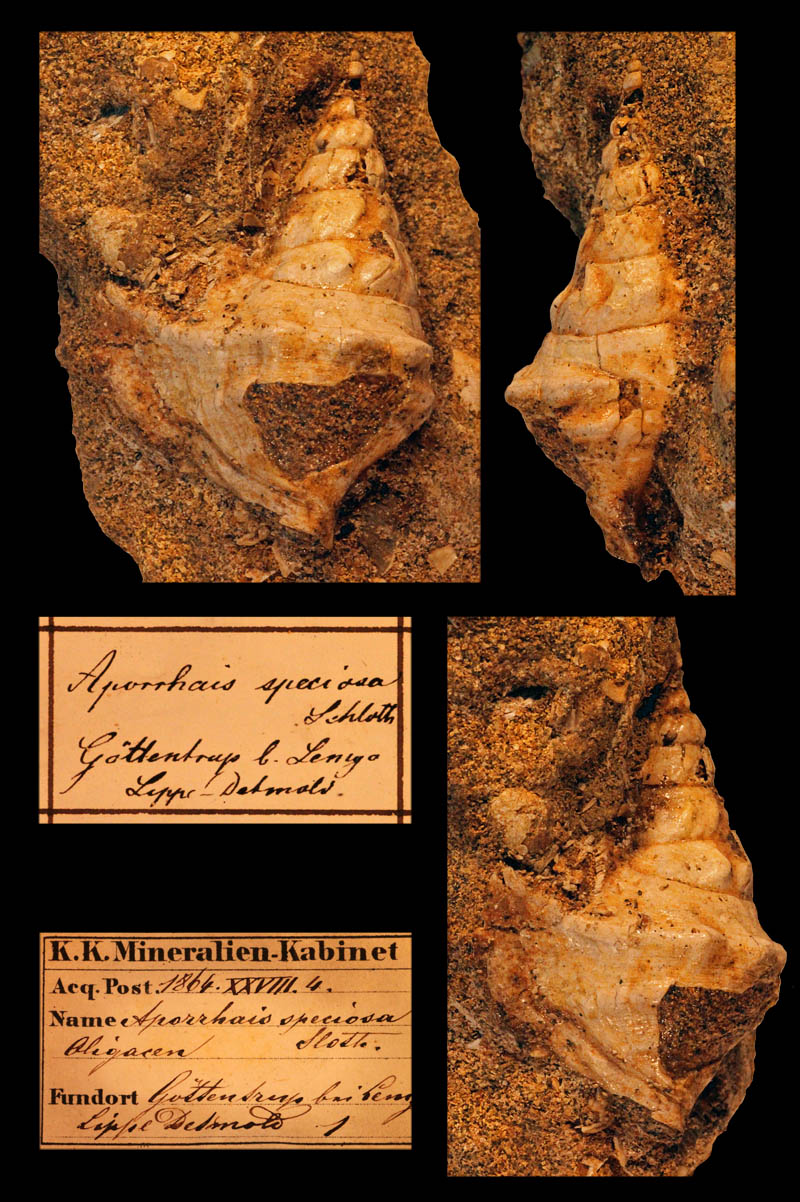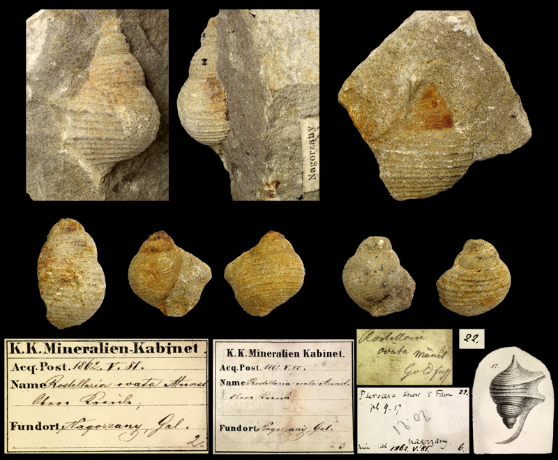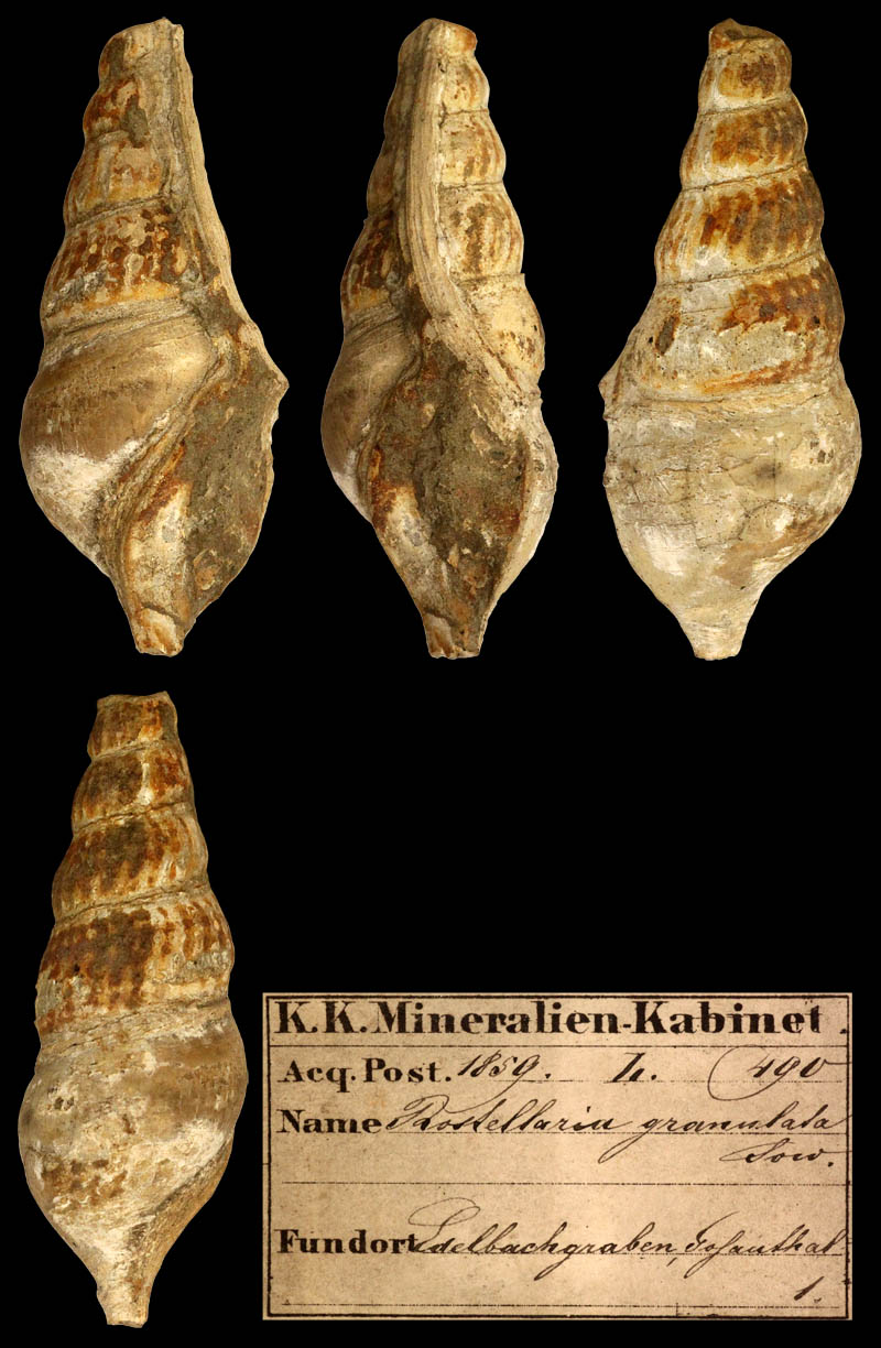 ![]() cf. Pletzachia sp.; Hofergraben, Gosau, Gmunden District, Upper Austria State, Austria; Coll. NHMW ![]() Phyllocheilus haueri (Zekeli, 1852); Gosau, Gmunden District, Upper Austria State, Austria; Coll. NHMW; Basis of drawing by Reuss, 1853, pl. 1, fig. 1 ![]() Rostellaria burmeisteri (Geinitz, 1846); Cretaceous; Tyssa, Czech Republic; Coll. NHMW ![]() Helicaulax granulatus (Sowerby, 1832); "Gosau-Schichten", upper Cretaceous; Nefgraben, Gosau, Gmunden District, Upper Austria State, Austria; Coll. NHMW ![]() Helicaulax granulatus (Sowerby, 1832); "Gosau-Schichten", upper Cretaceous; Windbach, Austria; Coll. NHMW ![]() Helicaulax cf. granulatus (Sowerby, 1832); "Gosau-Schichten", upper Cretaceous; Windbach, Austria; Coll. NHMW ![]() Helicaulax granulatus (Sowerby, 1832); "Gosau-Schichten", upper Cretaceous; Windbach, Austria; Coll. NHMW ![]() aff. Helicaulax granulatus (Sowerby, 1832); Tridorsatum-Zone, upper Turonian, upper Cretaceous; Strobl, Weißenbachtal, Salzburg State, Austria; Coll. NHMW ![]() Quadrinervus carinatus (Zekeli, 1852); lower Gosau Group, upper Cretaceous; Pletzach Alm, Kramsach, Tyrol State, Austria; 55 mm; Ex-coll. Herbert Gratt; Coll. NHMW no. 2008z0015/0004 ![]() Pletzachia furcata Kollmann, 2008; Paratype; lower Gosau Group, upper Cretaceous; Pletzach Alm, Kramsach, Tyrol State, Austria; Ex-coll. Herbert Gratt; Coll. NHMW ![]() Pletzachia furcata Kollmann, 2008; Paratype; lower Gosau Group, upper Cretaceous; Pletzach Alm, Kramsach, Tyrol State, Austria; Ex-coll. Herbert Gratt; Coll. NHMW ![]() Rostellaria kneri; Nagorzany; Coll. Naturhistorisches Museum Wien ![]() Pteroceras sp.; Priesen (Brezno), Coll. Naturhistorisches Museum Wien ![]() Guilfordia waageni Jahn, 1893, Brezno (Priesen), Czechia; Coll. Naturhistorisches Museum Wien ![]() Rostellaria divaricata; "Baculitenthon", Brezno (Priesen), Czech Republic; Coll. NHMW 1864 XII 145 ![]() Strombus coronatus, holotype of Persististrombus pannonicus Harzhauser & Kronenberg, 2013; Tortonian, upper Miocene; Ritzing, Burgenland State, Austria; Coll. NHMW no. 1930/0006/0058 ![]() Persististrombus pannonicus Harzhauser & Kronenberg, 2013; Badenian (Langhian), middle Miocene; Ritzing, Burgenland State, Austria; Coll. NHMW no. 2012/0025/0004 ![]() Persististrombus pannonicus Harzhauser & Kronenberg, 2013; Badenian (Langhian), middle Miocene; Ritzing, Burgenland State, Austria; Coll. NHMW no. 2012/0025/0002 ![]() Strombus bernielandaui (Harzhauser, 2007); Holotype; Warak Formation, Chattian, upper Oligocene; Gebel Madrakah, Oman; Coll. NHMW, No. 2006z0231/0035 ![]() Strombus bernielandaui (Harzhauser, 2007); Paratype; Warak Formation, Chattian, upper Oligocene; Gebel Madrakah, Oman; Coll. NHMW no. 2006z0231/0039 ![]() Persististrombus kronenbergi Harzhauser, 2009; Aquitanian, lower Miocene; Ras Tipuli, Lindi, Tanzania; pl. 3, fig, 4, 5; Coll. NHMW no. 2007z0181/0021 ![]() Strombus gijskronenbergi (Harzhauser, 2007); Paratype; Ghubbarah Formation, Aquitanian, lower Miocene; Gebel Madrakah, Oman; Coll. NHMW no. 2006z0231/0031 ![]() Persististrombus depertitus (Sowerby, 1840); Chasra Formation, Burdigalian, lower Miocene; Kankawati River, Gujarat State, Western India; Coll. NHMW no. 2008z0257/0013 ![]() Persististrombus daviesi (Dey, 1962); Quilon Limestone, lower Burdigalian, Miocene; Quilon, Kerala State, Malabar Coast, India; Coll. NHMW ![]() Strombus coronatus (Defrance, 1827); Pliocene; Larnaka, Cyprus Island; Coll. NHMW no. 1861/XLII/8 ![]() Strombus coronatus (Defrance, 1827); Pliocene; Larnaka, Cyprus Island; Coll. NHMW no. 1861/XLII/10 ![]() Strombus vokesae Landau, Kronenberg & Herbert, 2008; Holotype; Cercado Formation, upper Miocene; Rio Cana, area equivalent to NMB loc. no. 16832/16833 and TU 1230, Dominican Republic, Hispaniola Island, Greater Antilles, Caribbean; Length 220 mm, dorso-ventral height (restored) 165 mm, width 190 mm; Coll. NHMW no. 2007z0161/0001 ![]() Strombus schroeckingeri (Hörnes in Hörnes & Auinger, 1884); Badenian (Langhian), middle Miocene; Lapugiu de Sus (Lapugy), Hunedoara County, Transylvanian Region, Romania; Coll. NHMW no. 1855/XLIII/19 ![]() Strombus neugeboreni ?; Badenian (Langhian), middle Miocene; Lapugiu de Sus (Lapugy), Hunedoara County, Transylvanian Region, Romania; Coll. NHMW no. 1872/V/25 ![]() Strombus schroeckingeri (Hörnes in Hörnes & Auinger, 1884); lower Badenian (Langhian), middle Miocene; Costeiu de Sus (Kostej), Timis County, Banat Region, Transylvanian Basin, Romania; Coll. NHMW no. 1867/XIX/72 ![]() Strombus schroeckingeri (Hörnes in Hörnes & Auinger, 1884); lower Badenian (Langhian), middle Miocene; Costeiu de Sus (Kostej), Timis County, Banat Region, Transylvanian Basin, Romania; Coll. NHMW no. 1867/XIX/72 ![]() Europrotomus schroeckingeri (Hörnes in Hörnes & Auinger, 1884); lower Badenian (Langhian), middle Miocene; Costeiu de Sus (Kostej), Timis County, Banat Region, Transylvanian Basin, Romania; Coll. NHMW no. 2007z0114/0005 ![]() Europrotomus schroeckingeri (Hörnes in Hörnes & Auinger, 1884); lower Badenian (Langhian), middle Miocene; Costeiu de Sus (Kostej), Timis County, Banat Region, Transylvanian Basin, Romania; Coll. NHMW no. 2007z0114 ![]() Europrotomus schroeckingeri (Hörnes in Hörnes & Auinger, 1884); lower Badenian (Langhian), middle Miocene; Costeiu de Sus (Kostej), Timis County, Banat Region, Transylvanian Basin, Romania; Coll. NHMW no. 2007z0114 ![]() Europrotomus schroeckingeri (Hörnes in Hörnes & Auinger, 1884); lower Badenian, middle Miocene; Costeiu de Sus (Kostej), Timis County, Banat Region, Transylvanian Basin, Romania; Coll. NHMW no. 2007z0114 ![]() Europrotomus schroeckingeri (Hörnes in Hörnes & Auinger, 1884); lower Badenian, middle Miocene; Costeiu de Sus (Kostej), Timis County, Banat Region, Transylvanian Basin, Romania; Coll. NHMW no. 2007z0114 ![]() Strombus bonelli Brongniart, 1823; Miocene; Turin, Metropolitan City, Piedmont Region, Italy; Coll. NHMW no. 1862/XLIX/15 ![]() Strombus bonelli Brongniart, 1823; Mi