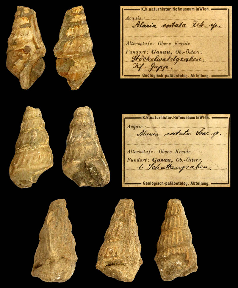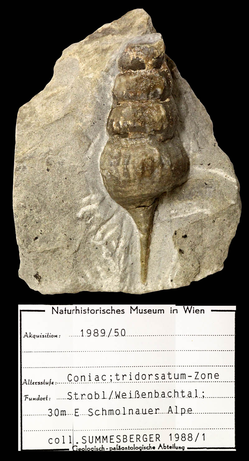 Naturhistorisches Museum Wien ![]() Latiala sp.; Rando/Zimmergraben, Gosau, Gmunden District, Upper Austria State, Austria; Coll. NHMW ![]() Latiala sp.; Rando/Zimmergraben, Gosau, Gmunden District, Upper Austria State, Austria; Coll. NHMW ![]() Rostellaria costata Sowerby, 1832; Gosau, Gmunden District, Upper Austria State, Austria; Coll. NHMW ![]() Rostellaria costata Sowerby, 1832; Randograben, Gosau, Gmunden District, Upper Austria State, Austria; 1978; Coll. NHMW ![]() Rostellaria costata Sowerby, 1832; Gosau, Gmunden District, Upper Austria State, Austria; Coll. NHMW ![]() Rostellaria costata Sowerby, 1832; Gosau, Gmunden District, Upper Austria State, Austria; Coll. NHMW ![]() Rostellaria costata Sowerby, 1832; Gosau, Gmunden District, Upper Austria State, Austria; Coll. NHMW ![]() Rostellaria costellata Buvignier, 1843; [sic, Lapsus Calami?]; Gosau, Gmunden District, Upper Austria State, Austria; Coll. NHMW ![]() Alaria costata Sowerby, 1832; Hofergraben, Gosau, Gmunden District, Upper Austria State, Austria; Coll. NHMW ![]() Arrhoges (Latiala) costata Sowerby, 1832; "Gosauschichten", upper Cretaceous; Randobach near Russbach, Salzburg State, Austria; l:46 mm, r:26 mm; Coll. Gero Moosleitner; Coll. NHMW ![]() Quadrinervus subtilis (Zekeli, 1852); Santonian, upper Cretaceous; Russbach, Salzburg State, Austria; Coll. NHMW ![]() Quadrinervus subtilis (Zekeli, 1852); Bibereck, Salzburg State, Austria; Coll. NHMW ![]() Pletzachia sp.; Santonian, upper Cretaceous; Russbach, Salzburg State, Austria; 141 mm; Coll. NHMW ![]() Pletzachia sp.; upper Santonian Sandkalkbank of the Hochmoosschichten in the Gosau Basin; Bibereck, Salzburg State, Austria; Coll. NHMW