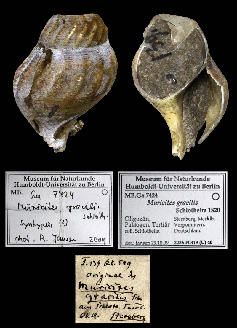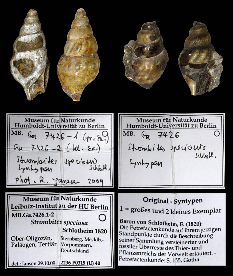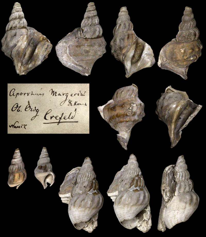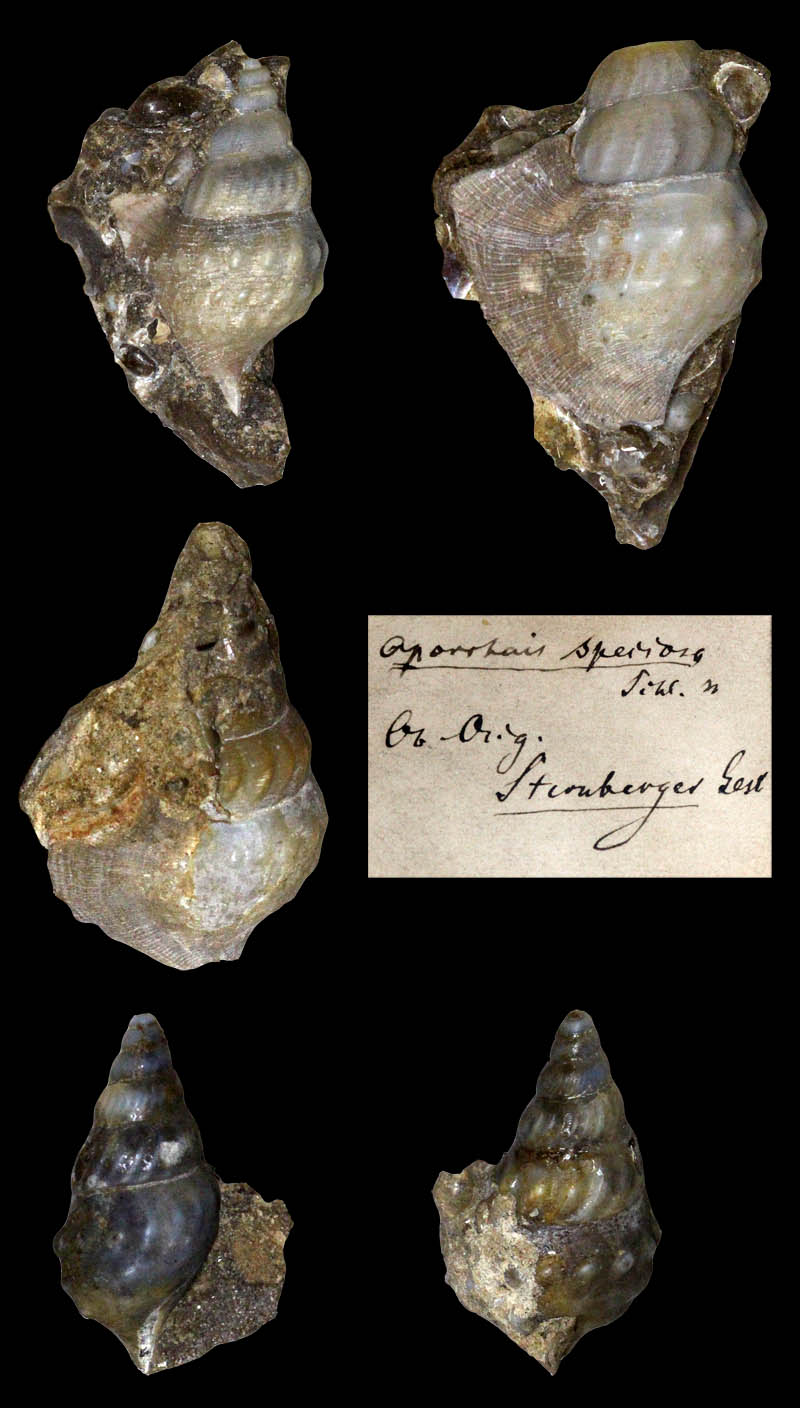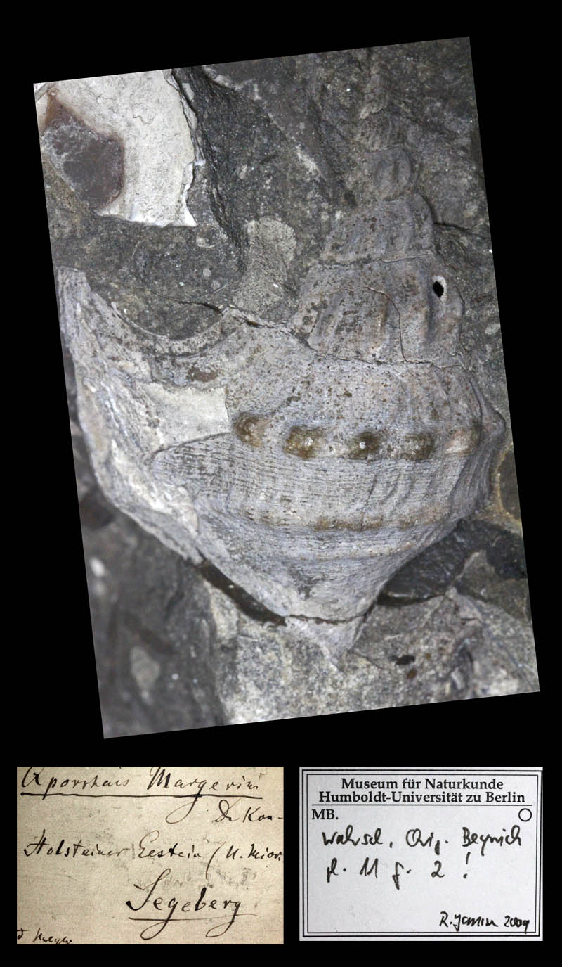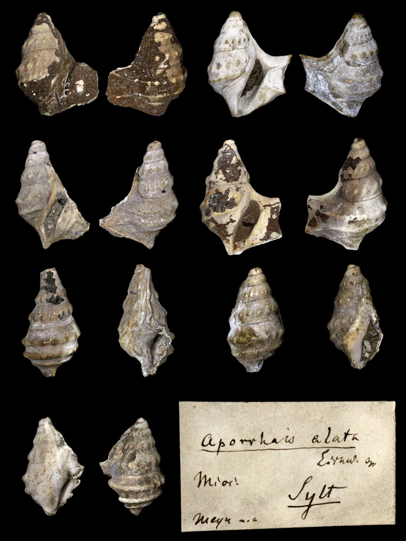 from their collection ![]() 'Aporrhais marginata'' (J. de C. Sowerby in Fitton, 1836); Gault, Albian, lower Cretaceous; Folkestone, Kent County, South East Region, England; Coll. and Copyright Museum für Naturkunde Berlin MB.Ga.2284 ![]() Aporrhais aff. unisinuata (Sandberger, 1861); Tongrian (Rupelian), lower Oligocene; Latdorf (=Lattorf) near Bernburg, Saxony-Anhalt State, Germany; Coll. Naturkunde Museum Berlin ![]() Aporrhais aff. unisinuata (Sandberger, 1861); Tongrian (Rupelian), lower Oligocene; Latdorf (=Lattorf) near Bernburg, Saxony-Anhalt State, Germany; Coll. Naturkunde Museum Berlin ![]() Aporrhais aff. unisinuata (Sandberger, 1861); Tongrian (Rupelian), lower Oligocene; Latdorf (=Lattorf) near Bernburg, Saxony-Anhalt State, Germany; Coll. Naturkunde Museum Berlin ![]() Aporrhais aff. unisinuata (Sandberger, 1861); Tongrian (Rupelian), lower Oligocene; Latdorf (=Lattorf) near Bernburg, Saxony-Anhalt State, Germany; Coll. Naturkunde Museum Berlin ![]() Aporrhais aff. unisinuata (Sandberger, 1861); lower Oligocene; Amersdorf(?); Coll. Naturkunde Museum Berlin ![]() Strombites speciosus von Schlotheim, 1820; Syntypes; Chattian, upper Oligocene; Sternberg, Mecklenburg-West Pomerania State, Germany; Coll. Naturkundemuseum Berlin no. MB.Ga.7426.1-2 ![]() Aporrhais speciosa (von Schlotheim, 1820); Chattian, upper Oligocene; Sternberg, Mecklenburg-West Pomerania State, Germany; Coll. Naturkundemuseum Berlin ![]() Aporrhais speciosa tenuis Boll, 1846; Chattian, upper Oligocene; Sternberg, Mecklenburg-West Pomerania State, Germany; Coll. Naturkundemuseum Berlin no. MB.Ga.7425 ![]() Aporrhais tenuis (Boll, 1846); Grafenberg-Formation, Chattian, upper Oligocene; Neuss, North Rhine-Westphalia State, Germany; Coll. Naturkundemuseum Berlin ![]() Aporrhais cf. speciosa (von Schlotheim, 1820); upper Oligocene; Doberg, Bünde, North Rhine-Westphalia State, Germany; Coll. Naturkundemuseum Berlin ![]() Aporrhais cf. speciosa (von Schlotheim, 1820); Oligocene; Krefeld, North Rhine-Westphalia State, Germany; Coll. Naturkundemuseum Berlin ![]() Aporrhais aff. speciosa (von Schlotheim, 1820); lower Oligocene; Latdorf (=Lattorf) near Bernburg, Saxony-Anhalt State, Germany; Coll. Naturkundemuseum Berlin ![]() Muricites gracilis von Schlotheim, 1820; Chattian, upper Oligocene; Sternberg, Mecklenburg-West Pomerania State, Germany; 23,3 mm; Coll. Naturkundemuseum Berlin no. MB.Ga.7424 ![]() Aporrhais margerini (De Koninck, 1838); Vierlandian (Aquitanian and early Burdigalian), lower Miocene; Segeberg, Schleswig-Holstein State, Germany; Coll. Naturkundemuseum Berlin ![]() Aporrhais alata (Eichwald, 1830); Dingden, Bocholt, North Rhine Westphalia, Germany; middle Miocene; Coll. Naturkundemuseum Berlin ![]() Aporrhais alata (Eichwald, 1830); Dingden, Bocholt, North Rhine Westphalia, Germany; middle Miocene; Coll. Naturkundemuseum Berlin ![]() Aporrhais alata (Eichwald, 1830); Miocene; Sylt, Schleswig-Holstein State, Germany; Coll. Naturkundemuseum Berlin |