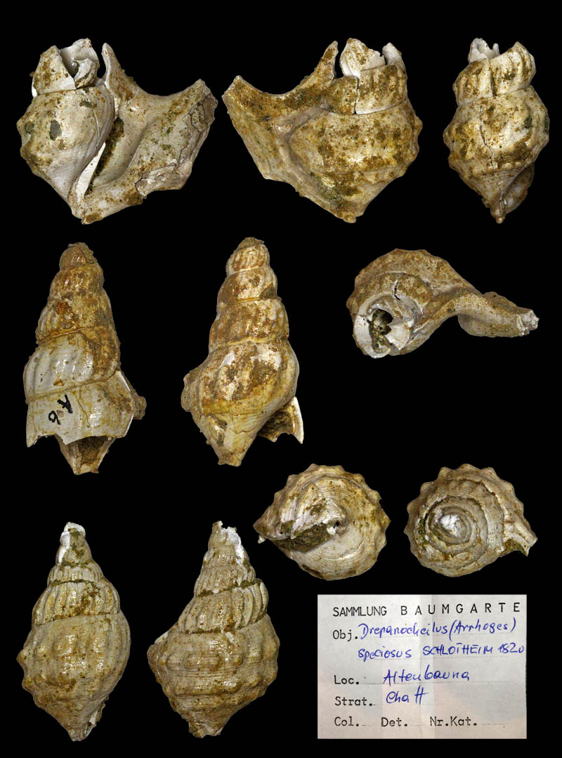 Naturkundemuseum im Ottoneum Kassel from their collections ![]() "Drepanocheilus (Arrhoges) speciosus megapolitana (Beyrich, 1853); Chatt, Oberoligozän, Tertiär; Glimmerode; Slg. Busse PA 95 443"; Coll. Naturkundemuseum im Ottoneum Kassel ![]() Aporrhais unisinuata (Sandberger, 1861); Chattian, upper Oligocene; Brandkopf, Oberes Ahnetal, Hesse State, Germany; 25,1 mm; Coll. Naturkundemuseum im Ottoneum Kassel ![]() Aporrhais cf. unisinuata (Sandberger, 1861); Chattian, upper Oligocene; Brandkopf, Oberes Ahnetal, Hesse State, Germany; Coll. Naturkundemuseum im Ottoneum Kassel ![]() Cerycium paradoxum Philippi, 1841; Chattian, upper Oligozän; Tagebau Höllkopf, Glimmerode near Kassel, Hesse state, Germany; Coll. Naturkundemuseum im Ottoneum Kassel ![]() Cerycium paradoxum Philippi, 1841; Chattian, upper Oligozän; Glimmerode near Kassel, Hesse state, Germany; Coll. Naturkundemuseum im Ottoneum Kassel ![]() Aporrhais cf. speciosa; "Kasseler Meeressand", Chattian, Oligocene; Altenbauna, Baunatal, Hesse state, Germany; exColl. Baumgarte, Coll. Naturkundemuseum im Ottoneum Kassel ![]() Aporrhais cf. speciosa; Chattian, upper Oligocene; Glimmerode, Niestetal, Hesse State, Germany; Coll. Naturkundemuseum im Ottoneum Kassel ![]() Aporrhais cf. speciosa; "Kasseler Meeressand", Chattian, Oligocene; Tagebau Höllkopf, Glimmerode, Hesse state, Germany; Coll. Naturkundemuseum im Ottoneum Kassel ![]() Aporrhais cf. speciosa; "Kasseler Meeressand", Chattian, Oligocene; Brandkopf, Ahnetal near Kassel, Hesse state, Germany; Coll. Museum Historiae Natiralis Casselensis PA 95.248 A