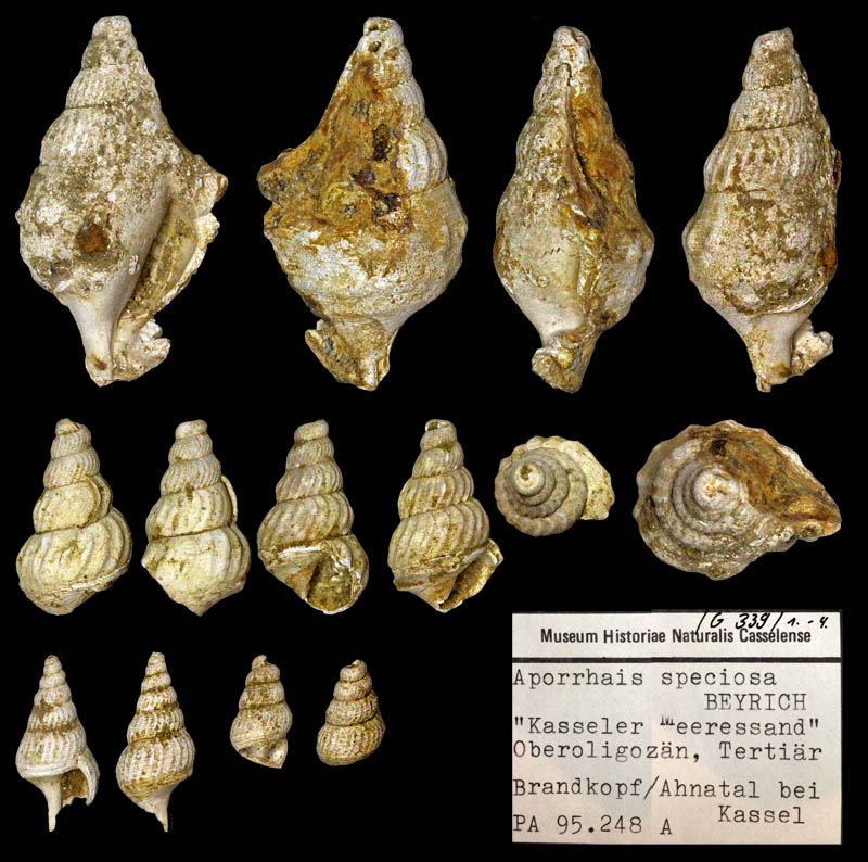 ![]() Aporrhais oxydactyla (Sandberger, 1861); Meeressand, Rupelian, lower Oligocene; Trift, Alzey-Weinheim, Mainz Basin, Rhineland-Palatinate State, Germany; Coll. Naturkundemuseum im Ottoneum Kassel References
