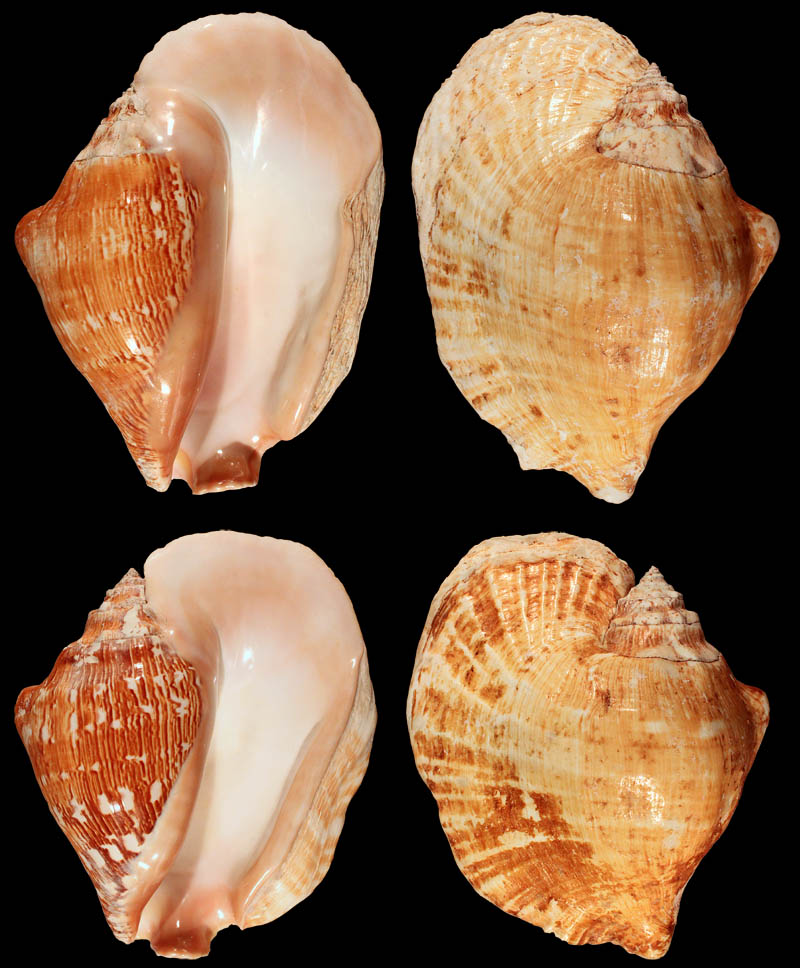 ![]() Margistrombus septimus (Duclos, 1844); Pouebo, North Province, New Caledonia, Melanesia; t: 53 mm, b: 43 mm; Coll. Christian Börnke ![]() Sinustrombus latissimus (Linnaeus, 1758); Thio Village, South Province, east coast, New Caledonia, Melanesia; external reef, muddy sand; from 30 m; t: 202 mm, b: 197 mm; Coll. Christian Börnke ![]() Sinustrombus sinuatus (Lightfoot, 1786); New Caledonia, Melanesia; t: 79 mm, b: 92 mm; Coll. Christian Börnke ![]() Thersistrombus thersites (Swainson, 1823); North of Noumea, South Province, New Caledonia, Melanesia; scuba on sand bottom; 1995; Coll. Guido Poppe ![]() Tridentarius dentatus (Linnaeus, 1758); New Caledonia, Melanesia; from 70-80 m; 40 mm; Coll. Franck Leterrier References