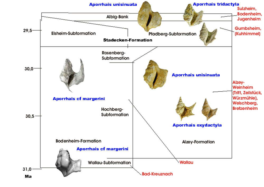 Hoelzl, 1962 mentions three Aporrhais species from the Schmerold Graben for the Rupelian of the upper Bavarian Oligocene Molasse.