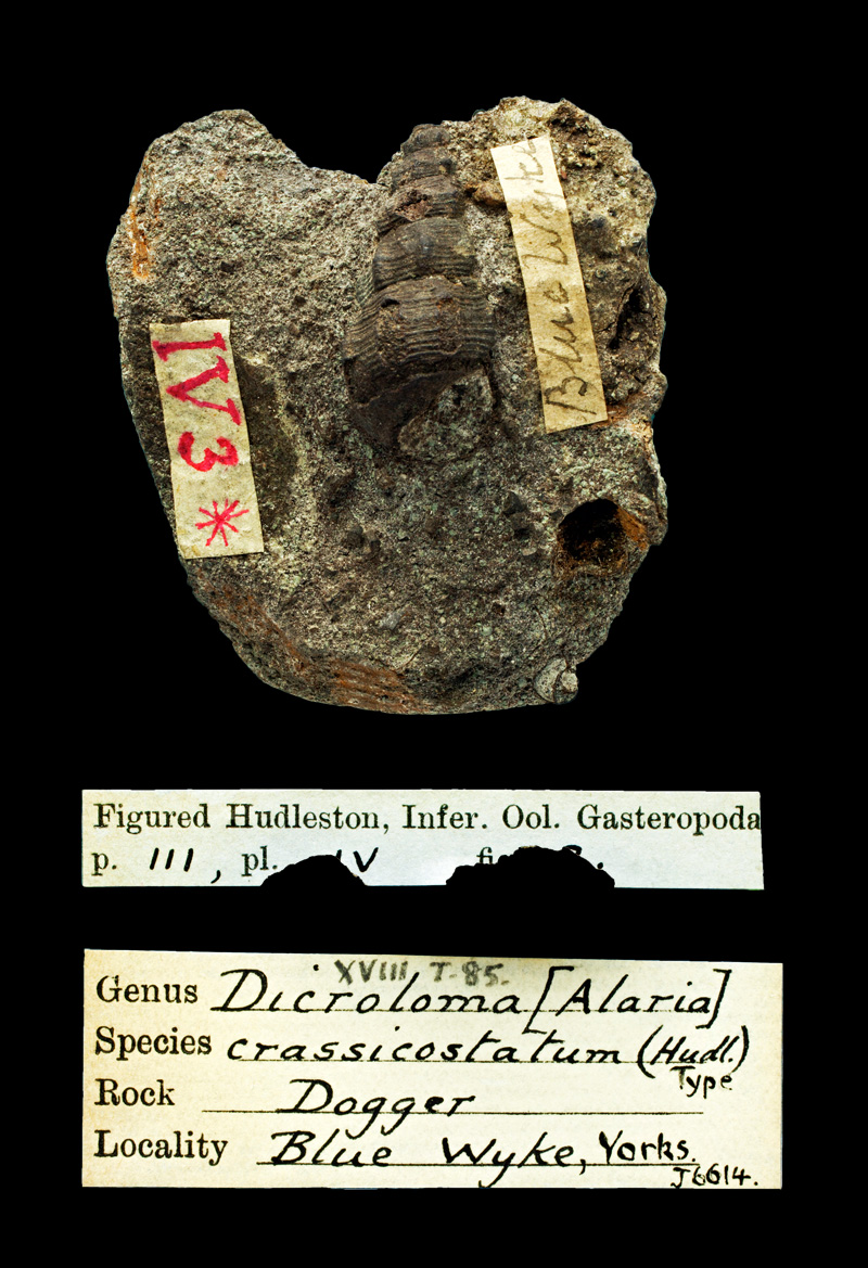 Alaria crassicostata Hudleston, 1887; Dogger, Inferior Oolite, middle Jurassic; Blue Wyke, Yorkshire, England; Undifferentiated Type; Copyright Sedgwick Museum of Earth Sciences