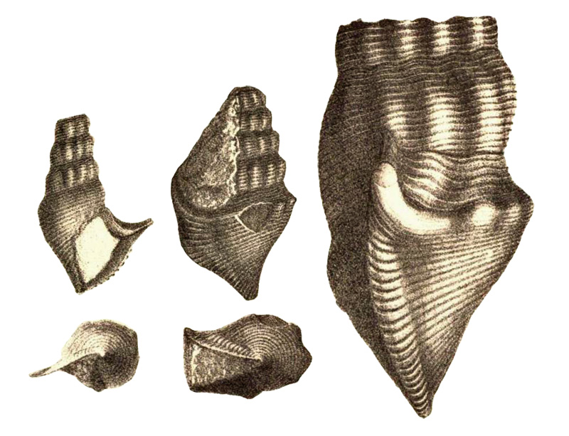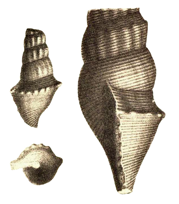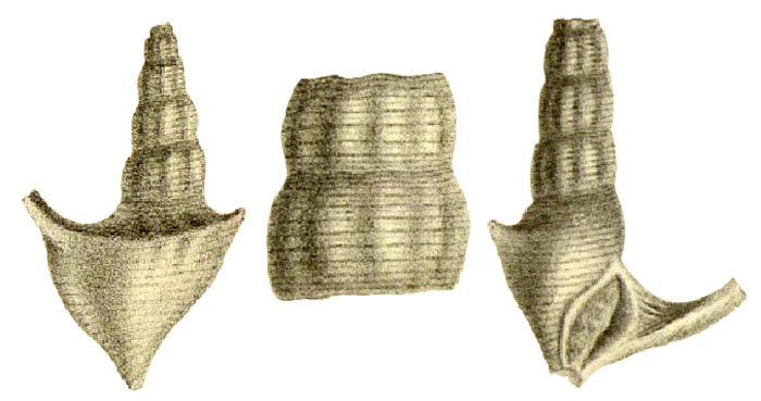 - "Testâ turritâ, transverse striatâ; anfractibus numerosis, convexis, transverse striatis, costas longitudinaliter ferentibus; ultimo carinato; alâ monodactylâ, recurvâ; canali brevi rectoque."