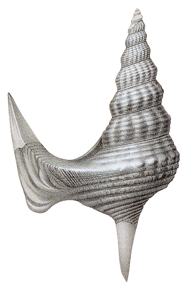 - "Shell large; body, exclusive of the wing and including the beak, subfusiform; spire elongate, about equal in length to the body volution and the beak together; volutions ten or twelve, moderately convex; those of the spire marked by longitudinal nodes, which disappear before reaching the suture at either side of the volution, but they approach more nearly to that of the proximal side; suture linear or faintly impressed; surface of the volutions of the spire marked by from five to seven strong revolving raised lines, which are of about equal strength upon and between the longitudinal nodes; numerous minute revolving raised lines also cover the surface between the stronger ones just mentioned, and these are crossed by numerous fine, sharply raised lines of growth, giving the well-preserved surface of the shell a finely cancellated appearance under the lens. Upon the body-volution, the longitudinal nodes gradually disappear and are replaced by a median row of smaller nodes, continuous with the former, and also with the strong plain carina which extends out upon the wing to its posterior extremity, and lies near to and nearly paralle with the posterior border of the wing. The stronger revolving lines of the spire become still stronger with the increase in size of the volutions, but they disappear upon reaching the wing. Four or five of those immediately in front of the median convexity of the body-volutions are especially strong, and become sharply raised ridges with channels of about equal width between them; in front of these is a series of smaller ones, the representatives of which are covered by the successive turns of the spire, and which terminate upon and at the base of the beak. Beak long, slender, straight, pointed. Wing large, projecting much beyond the aperture, constricted in the middle of its transverse portion, but expanding again beyond; the posterior part much extended and terminating in a long, somewhat strong, pointed process, which is angular along its back; the anterior portion of the outer part of the wingis prominent, projecting forward and abruptly rounded; posterior border deeply concave; exterior border nearly or quite straight; anterior border having a general concavity, but a sinuous outline. Outer surface of the wing more or less strongly wrinkled in the direction of the lines of growth. The direction of these wrinkles and of the lines of growth indicates that before the wing was fully formed the antero-exterior portion of the wing was less prominent than when adult. Inner lip apparently without a callus."