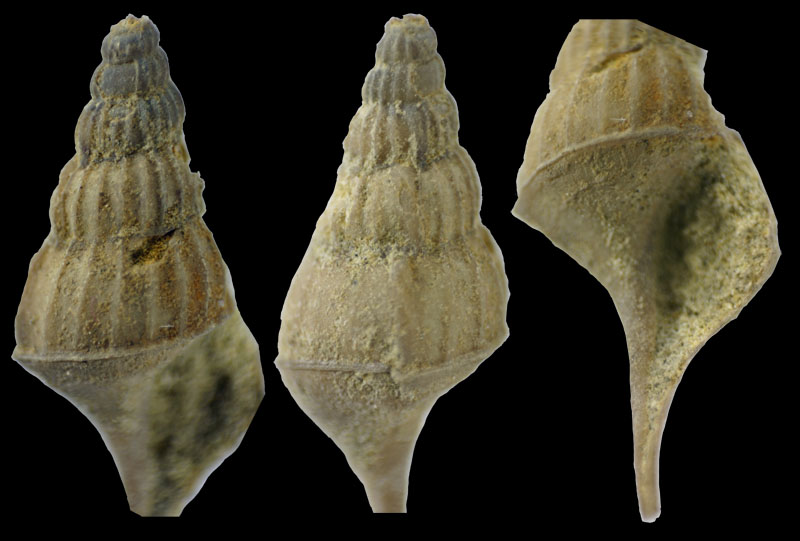 Aporrhais cf. beisseli; "Vaalser Grünsand", Campanian, Cretaceous; Vaals, Netherlands; l: 16 mm, m,r: 26 mm; Coll. Röper
