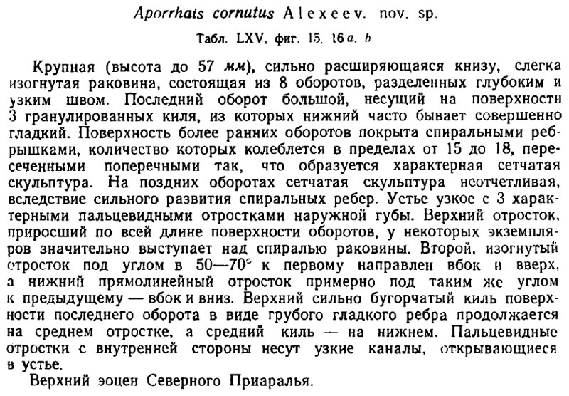 Original Description of Aporrhais cornutus by Alekseev in Korobkov, 1949, p. 244: