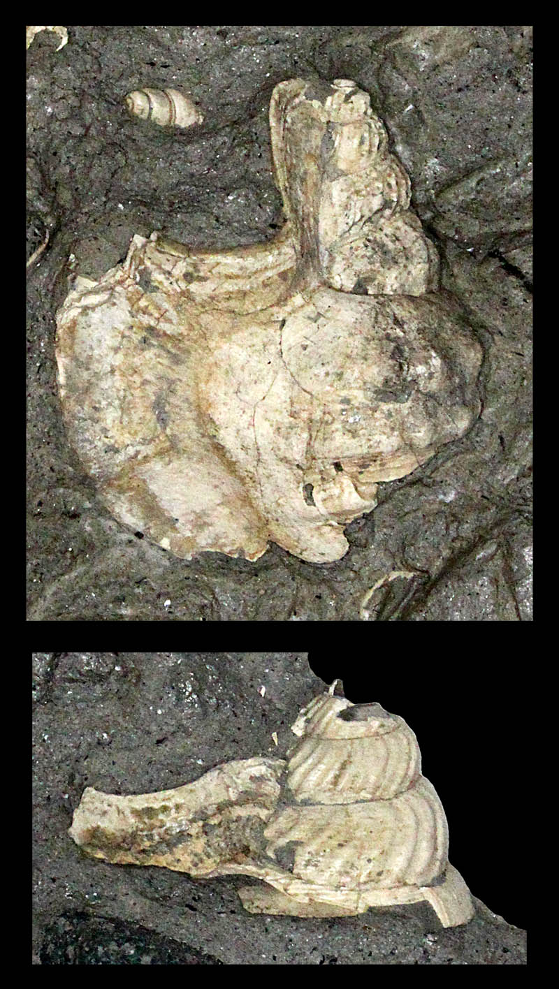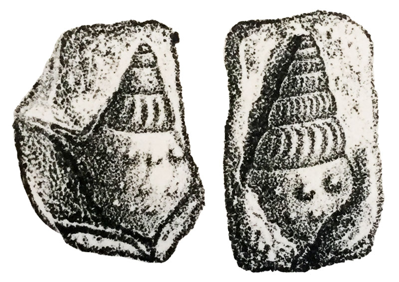 - "Rostellaria pes carbonis Brong. Vicent, 6, 2. Eilf Windungen; Breite zur Länge von der Spitze bis zum oberen Mundwinkel wie 3:5; 22 Längsstreifen, welche nur an der unteren letzten Windung sich zu undeutlichen Warzen erheben. Daher findet sich auch keine carina, sodern die Windungen sind bauchig. Von den Queerstreifen bleiben 22 auf den WIndungen unbedeckt. Auf der ersten Windung zählt man 42 Queerstreifen, schmale und breite abwechselnd. (L. v. Buch.) - Häufig."