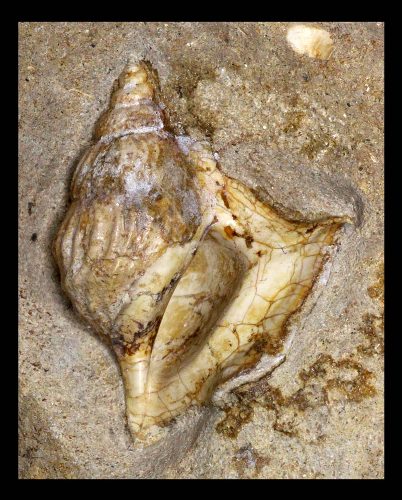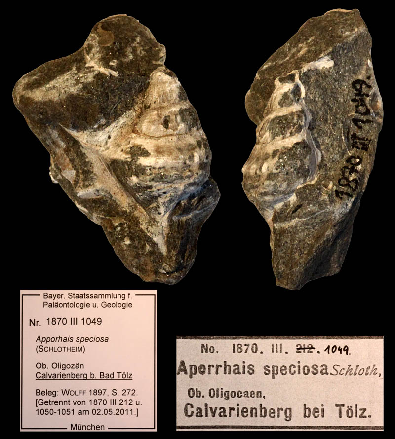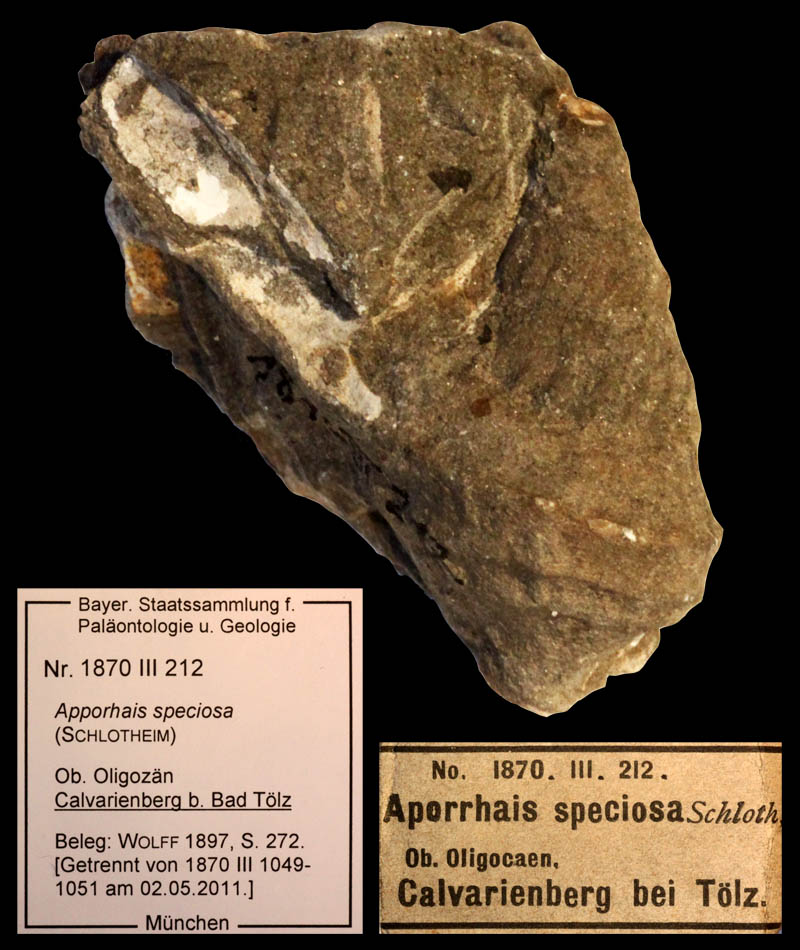 - "Aporrhais speciosa Schloth.sp. In schöner Erhaltung von Ober-Kaufungen. Die gleiche Varietät dieser variablen Art, welche De Koninck aus dem belgischen Thon von Boom Rostellaria Margerini genannt hat. In norddeutschem Septarienthon ist sie von Görzig bei Köthen gekannt. Die Art findet sich auch in den nächstälteren und jüngeren Tertiärfaunen, in abweichenden Varietäten auch häufig im gelben Sande von Cassel wie im Sternberger Gestein."
