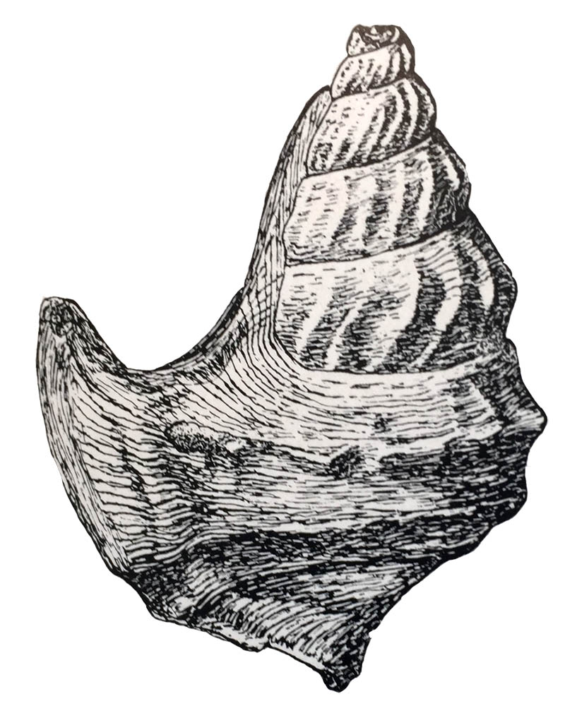 - "Rostellaria pes carbonis. Brogniart Vicentin Tab. IV. fig. 2. Fr. Hoffmann, Pogg. Annal. XII. 119. ungemein häufig. Sie ist es doch nicht, weder in den Schichten von England oder von Frankreich. Eilf Windungen, Breite zur Länge von der Spitze bis zum nächsten oder oberen Mundwinkel wie 3 zu 5. 22 Längsstreifen, welche nur an der unteren letzten Windung sich zu undeutlichen Warzen erheben. Daher findet sich auch keine Kante oder carina, sondern die Windungen sind bauchig. Von den Querstreifen bleiben 22 auf den Windungen unbedeckt. Auf der ersten Windung zählt man 42 Querstreifen, schmale und breite abwechselnd von der Sutur bis zum zweiten Rande, welcher in den oberen Stachel des Flügels ausläuft."