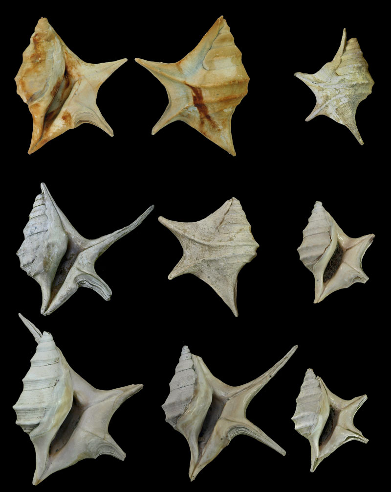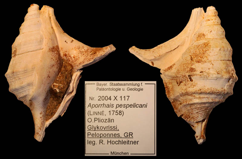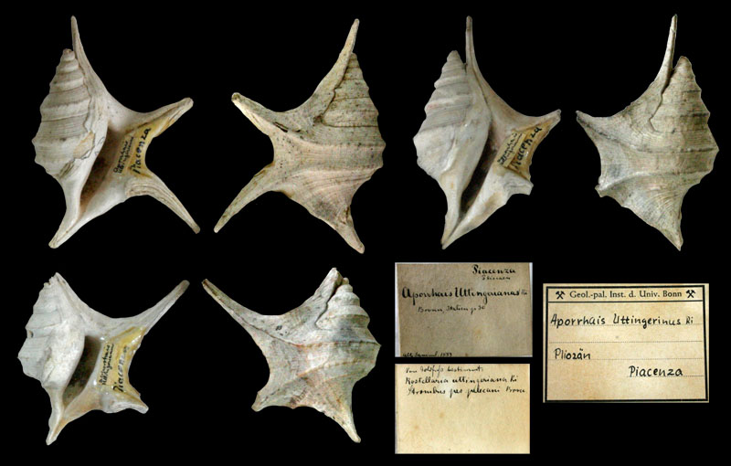 Specimens from institutional collections ![]() Aporrhais uttingerianus (Risso, 1826); Pliocene; Piacenza, Piacenza Province, Emilia-Romagna Region, Italy; Coll. Goldfuß Museum Bonn ![]() Aporrhais pesgraculi Bronn,1827; Pliocene; Biot, Antibes, Alpes-Maritimes Department, France; Coll. NHMW no. 0.2393 1882 ![]() Chenopus uttingeri (Risso, 1826); freak; "Astian IIa", upper Pliocene; Lugagnano, Piacenza Province, Emilia-Romagna Region, Italy; Coll. Mayer-Eymar no. s.3071; Coll. ETH, Zürich ![]() Chenopus uttingeri (Risso, 1826); Pliocene; Saint-Aries, near Bollène, Vaucluse Department, France; Coll. NHMW no. 1878.XXXVII.12 ![]() Chenopus pesgraculi Bronn,1827; Astian, upper Pliocene; Altavilla Monferrato, Alessandria Province, Piedmont Region, Italy; Coll. NHMW no. d.770 1884 ![]() Chenopus uttingeri (Risso, 1826); "Dertonien IB", Tortonian/Messinian, upper Miocene; Stazzano, Alessandria Province, Piedmont Region, Italy; Coll. Mayer-Eymar; Coll. ETH, Zürich ![]() Aporrhais uttingeriana (Risso, 1826); upper Pliocene; Glykovrissi, Laconia Regional unit, Peleponnes Region, Greece; Coll. BSPG no. 2004 X 117 ![]() Chenopus uttingeri (Risso, 1826); "Dertonien IB", Tortonian/Messinian, upper Miocene; Stazzano, Alessandria Province, Piedmont Region, Italy; Coll. Mayer-Eymar; Coll. ETH, Zürich