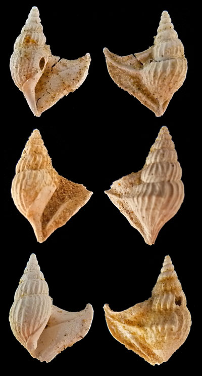 - "Notre espèce parisienne est oblongue, fusiforme, assez courte; la spire, formée de sept tours est obtuse au sommet; ces tours sont convexes, réunis par une suture linéaire et profonde; les trois premiers sont lisses, les suivant sont ornés de petites côtes longitudinales étroites, régulières, un peu courbées, descendant d'une suture à l’autre, elles sont traversées par des stries transverses, serrées, très-fines, très-régulières, et qui se continuent sur toute la surface du dernier tour; celui-ci est un peu plus long que la spire, il se termine en avant par un canal court et très-étroit; les côtes onduleuses viennent disparaitre vers l'origine du canal, sur le dos et vers l'ouverture apparait un angle qui devient de plus en plus proéminent en se prolongeant le long de la digitation unique du bord droit. L'ouverture est allongée, oblique, étroite, son bord droit dilaté en aile triangulaire se prolonge en arrière en une digitation assez épaisse, courbée et dont l'extrémité est séparée de la spire par une large sinuosité concave; le bord est obtus et épaissi en dedans; un petit canal est creusé le long de la digitation, un petit lobe se détachant de l'extrémité du bord gauche remonte jusqu'a la suture de l'avant-dernier tour. La columelle est allongée, légèrement concave et garnie d'un bord gauche large, épais et calleux, surtout en avant."