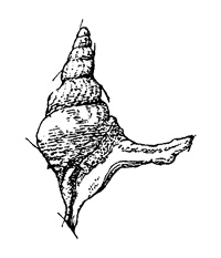 - "Coquille de taille médiocre, élancée, fusiforme, composée de tours convexes, séparés par une suture légèrement enfoncée. Les deux premiers tours, peu nets, paraissent lisses; les suivants sont couverts de costules courbes et obliques, plus ou moins rapprochées suivant les individus, allant d'une suture à l'autre et traversées par des rubans spiraux, fins et serrés. Dernier tour un peu plus long que la moitié de la longueur totale, dépourvu de carène et de costules axiales, mais portant une fine striation spirale, serrée, dont les éléments sont plus accusés et plus espacés sur la base: il s'étend latéralement en une aile étroite, formée d'une digitation unique, épaisse, arquée et pointue à l'extrémité; cette digitation porte une côte correspondant au prolongement de la carène postérieure du tour, si celle-ci avait existé, et., sur sa face interne, un sillon, contre-partie de cette côte. Ouverture assez grande, ovale-trapézoïdale, se terminant en avant en un canal long et étroit. Le bord postérieur de l'aile, creusé en gouttière, se rattache, d'une part, à la spire jusqu'à la moitié de l'avant-dernier tour, d'autre part, à la lèvre columellaire, qui est épaisse et calleuse. Columelle presque rectiligne."