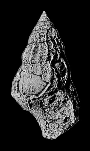 - "Shell small, slender. Whorls of the conch probably about 7, those of the protoconch 4. Initial turn minute, the 3 succeding nuclear whorls rapidly enlarging, broadly rounded and separated by incised suture lines. Sculpture initiated on earlist postnuclear whorl. Adolescent sculpture of narrow, feebly arcuate, protractive riblets averaging about 14 to the whorl and crossed by about 7 feeble, flattened, spiral threads; axial sculpture evanescent on the next to the final whorl, the spiral sculpture increasingly feeble. Adult veil produced backward. Apertural face in the type flattened; an obscure callus fold on either side and a prominent node midway between them at the rear of the shell. Anterior extremity not preserved in any specimen. Outer lip much thickened and produced backward; the callus covering a large spatulate area on the back of the 3 or 4 later whorls. Callus margins thickened and separated only by a deep groove extending in the adult from the posterior angel of the aperture (in the specimen figured) to the suture line between the third and fourth whorls; callus following the suture for a fraction of a whorl, then curving forward to the body. Body rounded and obliquely constricted to the slender pillar."