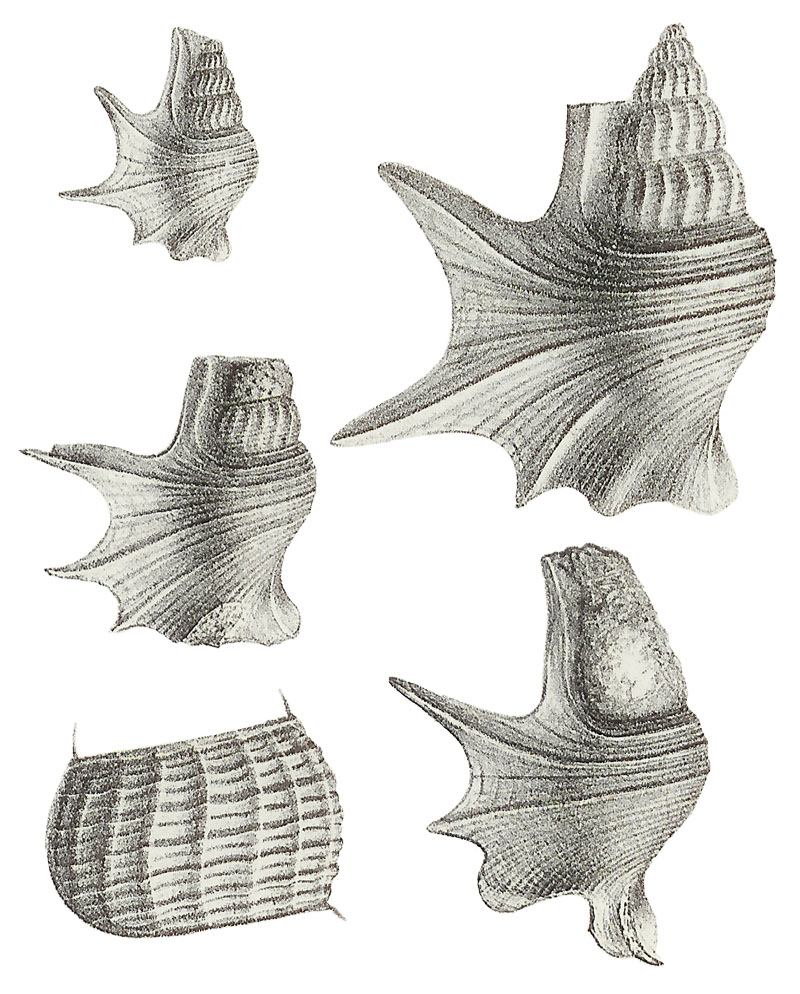 ![]() Chenopus intermedius Piette, 1869, pl. 44, fig. 9, 10, 11, 12, 13 ![]() Aporrhais intermedius Piette in Struckmann, 1878, pl. VIII, fig. 6 ![]() Aporrhais intermedius (Piette, 1869); Kimmeridgian, upper Jurassic; Daillancourt, Haute-Marne Department, France; Coll. MNHN no. R198; Copyright Museum national d'Histoire naturelle Paris |