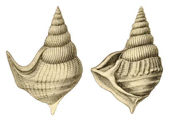 - "Coquille allongée, pointue, composée de neuf à dix tours convexes, réunis par une suture linéaire. Les tours sont ornés d'un très-grand nombre de côtes longitudinales, fines, très-serrées et légèrement courbées. Le dernier tour est à peu près de la même longueur que la spire et se terminait, d'après ce que l'on peut en juger, par un canal court. Le bord droit de l'ouverture se dilate en une aile triangulaire qui se continue en une digitation ; son bord antérieur forme une lèvre qui se replie en dehors, se prolonge le long de la spire et s'arrête à la suture du deuxième tour. A peu de distance de ce bord se remarque une côte très-proéminente qui part de la suture, suit le contour de l'aile et, arrivée à la naissance de la digitation d'où part une fine costule qui se continue jusqu'à l'extrémité de la digitation, forme un angle et se poursuit ensuite en s'atténuant insensiblement jusqu'au bas du tour, en décrivant une légère courbe. L'espace compris entre cette côte et le bord de l'aile forme une gouttière profonde. Sur le dernier tour se montrent quatre côtes transverses, régulièrement distantes, traversées par des costules longitudinales, obliques, peu accentuées et qui s'effacent insensiblement après avoir dépassé le cordon transversal supérieur. Par le passage de ces dernières sur la côte transverse supérieure il se forme, au point de rencontre, des tubercules qui rendent le tour légèrement caréné. Outre ces ornements, toute sa surface est couverte de fines costules serrées. Nous nous trouvons dans l'impossibilité de faire connaître les caractères de l'ouverture, ne possédant que des échantillons montrant la face opposée."