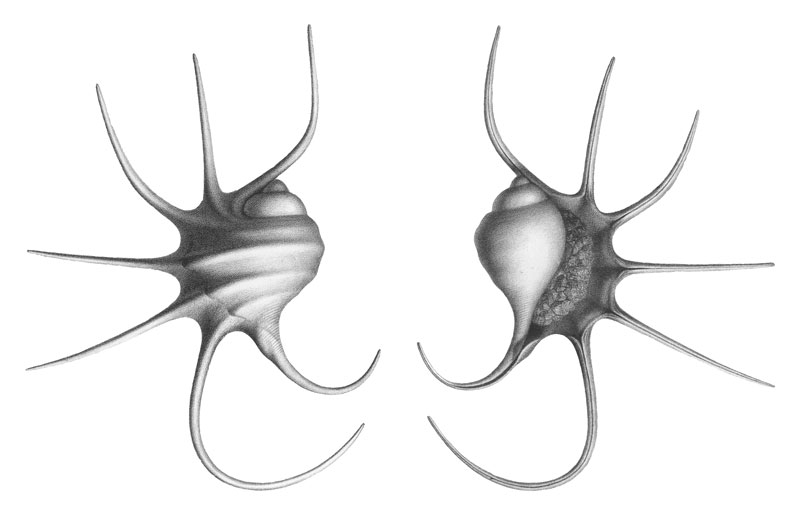 Locus typicus: Creuë, Vigneulles-lès-Hattonchâtel, Meuse Department, France Stratum typicum: Malm, upper Jurassic ![]() Harpagodes aranea (d’Orbigny, 1850); Syntype; "Malm", upper Jurassic; Creuë, Vigneulles-lès-Hattonchâtel, Meuse Department, France; Coll. MNHN no. A 07333; Copyright Museum national d'Histoire naturelle Paris ![]() Pterocera aranea d’Orbigny, 1850; Syntype; Oxfordian, Jurassic; Creuë, Vigneulles-lès-Hattonchâtel, Meuse Department, France; Coll. MNHN no. A 07332; Photo: Gaëlle Dotteau; Copyright Museum national d'Histoire naturelle Paris ![]() Pterocera aranea d’Orbigny, 1850; Syntype; Oxfordian, Jurassic; Creuë, Vigneulles-lès-Hattonchâtel, Meuse Department, France; Coll. MNHN no. B12700; Photo: Gaëlle Dotteau; Copyright Museum national d'Histoire naturelle Paris ![]() Pterocera polypoda Buvignier, 1852; Creue, France; inferior coral-rag, Oxfordian, upper Jurassic; Coll. MNHN R10052; Photo: Gaëlle Doitteau; Copyright Museum national d'Histoire naturelle Paris History and Synonymy 1852 ![]() Pterocera polypoda in Buvignier, 1852 pl. XXIX fig. 3 and 4; Creue, France; inferior coral-rag, Oxfordian, upper Jurassic 1891 ![]() Harpagodes aranea in Piette, 1891, pl. 67, fig. 4, 5 Specimens from institutional collections ![]() Harpagodes aranea (d’Orbigny, 1850); Oxfordian, upper Jurassic; Châtel-Amon, Yonne Department, France; Coll. MNHN no. R 00043; Copyright Museum national d'Histoire naturelle Paris Specimens from private collections ![]() Harpagodes aranea (d’Orbigny, 1850); Oxfordian, upper Jurassic; Sénonville, Meuse Department, France; 110mm; Coll. Denis Bailliot ![]() Harpagodes aranea (d'Orbigny, 1850); Oxfordian, upper Jurassic; L'Hôpital du Grosbois, Doubs Department, France; 140mm; Coll. Philippe Simonet References: