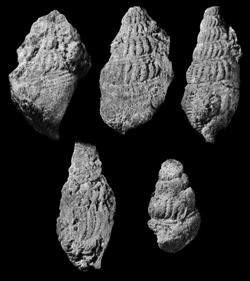 - "Shell small to medium-sized, spindle-shaped. Spire relatively high and composed of about 4 to 6 overlapping whorls, which are convex in outline. Body whorl carinate, moderately inflated and accounting for about 1/3 of shell height. Suture slightly impressed. Ornamentation consisting of 16-20 opisthocline axial ribs. These are crossed by a variable number of relatively finer spiral cords and separated by narrower interspaces, which are occupied by very fine spiral threads. The intersection of both axial and spiral elements produces tubercles, which are elongated in a spiral direction. Aperture small, lanceolate, with incomplete outer lip.