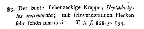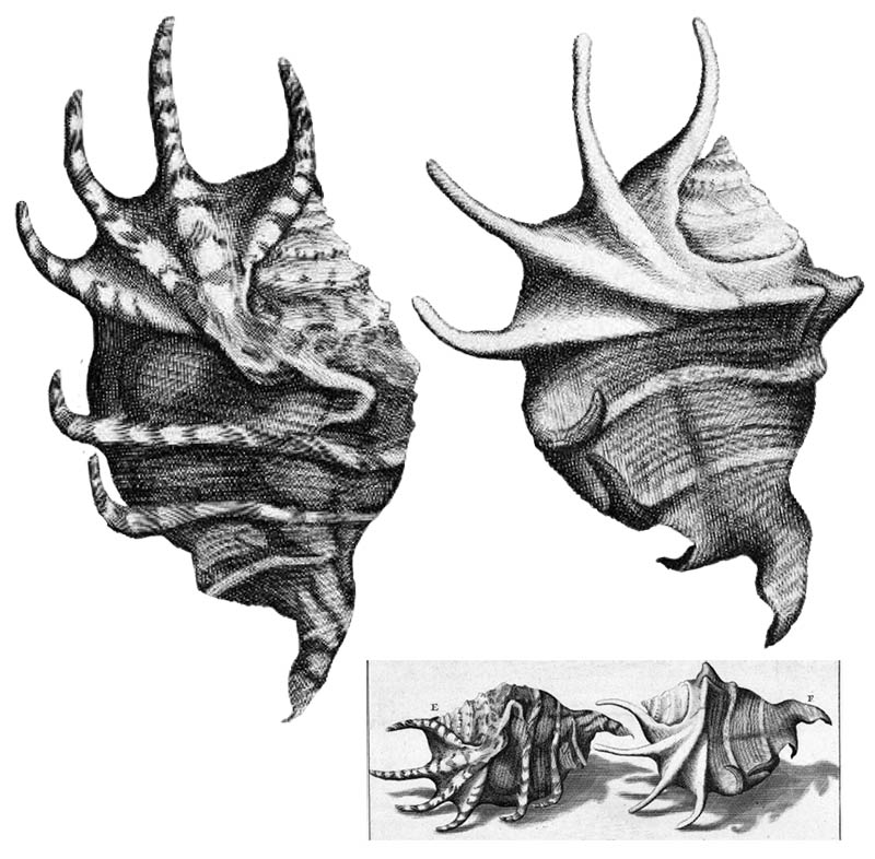 1705 ![]() in Rumphius, 1705, pl. 35, fig. E, F 1742 ![]() in Argenville, 1742, pl. 17, fig. E 1758 ![]() Alata ala divisa. Aporrhais. in Regenfuss, 1758, pl. IV, fig. 45 1766 ![]() Cornuta in Rumphius, 1766, pl. XXXV, fig. E, F ![]() Cornuta in Rumphius, 1766, pl. XXXVI, fig. G 1769 ![]() Lambis lambis by Chemnitz, 1769, pl. 158 fig. 1478 1787 Abel, 1787 mentions Heptadactylos marmorata. ![]() Abel, 1787, p. 117 1842 ![]() Pteroceras lambis in Sowerby, 1842, pl. 11, fig. 5, 6, 7 ![]() Pteroceras lambis in Gray, 1842, pl. 1, fig. 1