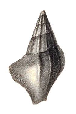 - "Coquille peu allongée. Spire formée d'un angle régulier, composée de tours peu convexes, ornés, en travers, par révolution spirale, de treize côtes aiguës, un peu obliques, et correspondant d'un tour à l'autre; le dernier tour, gibbeux, est marqué, en travers, de trois grosses côtes; le reste, vers l'aile, paraît être lisse. Je ne connais que le commencement de l'aile."