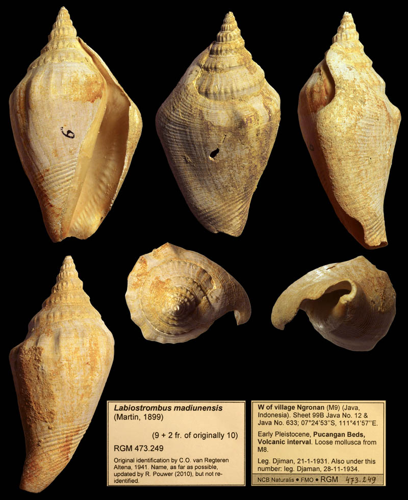 Labiostrombus madiunensis; Syntype; unnamed beds from the Pliocene; near Sondé Village, Madiun, Java, Indonesia; syntype; in Leloux & Wesselingh, 2009; Coll. Naturalis RGM 10211a; Copyright Naturalis