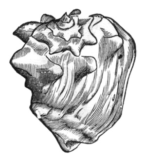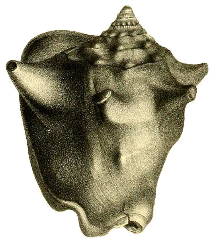 - "STROMBE COURONNÉ: Strombus coronatus, Def.; Knorr, Petref., tab. 38, fig. 1 et 2. Cette espèce, qui a plus de quatre pouces de longueur, a le têt très-épais au bord droit; elle est très-remarquable par les longs tubercules dont le haut de chaque tour est garni comme dans le strombus gigas. On trouve des coquilles de cette espèce aux environs de Sienne."