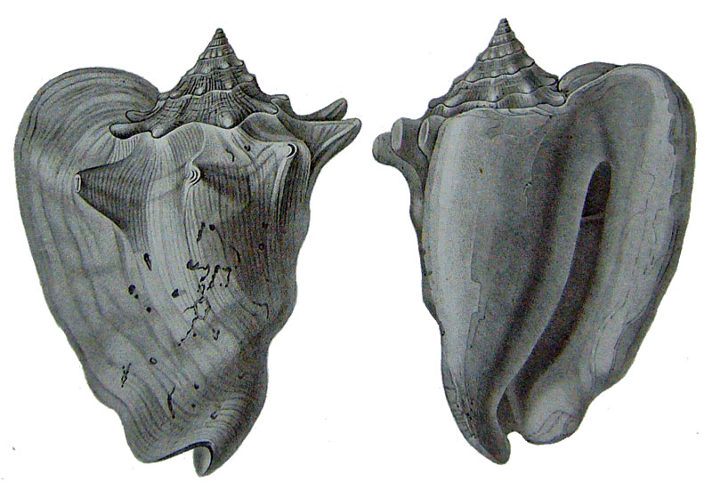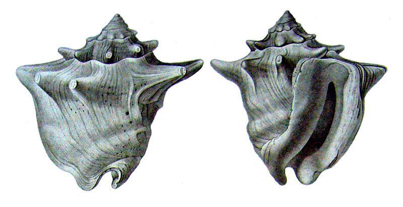 - "St. testa magna, ovata, crassa et ponderosa, laevigata; spira brevissima, obtuso-conica; anfractibus angustis; basi nodulosis; ultimo maximo, totam fere test m efformante, antice tuberculis magnis, distantibus, transverse paulum compressis, retro subcurvatis, postice duabus nodorum obtusorum, distantium, seriebus ornato; apertura praelonga, angusta, in canalem brevem, contortum exeunte; labro crassiusculo, inferne paulum dilatato, repandoque; columella callo latissimo. Long. 190, lat. 130 mill."