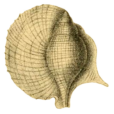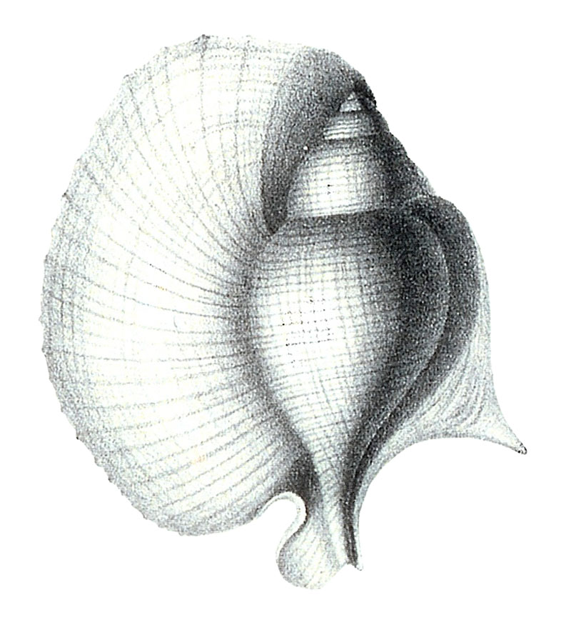 - "P. testâ brevi, ovata; spirâ, angulo convexo 40°; anfractibus convexis, longitudinaliter costatis, transversim striatis; ultimo convexo; labro dilatissimo."