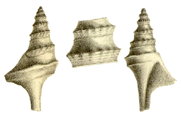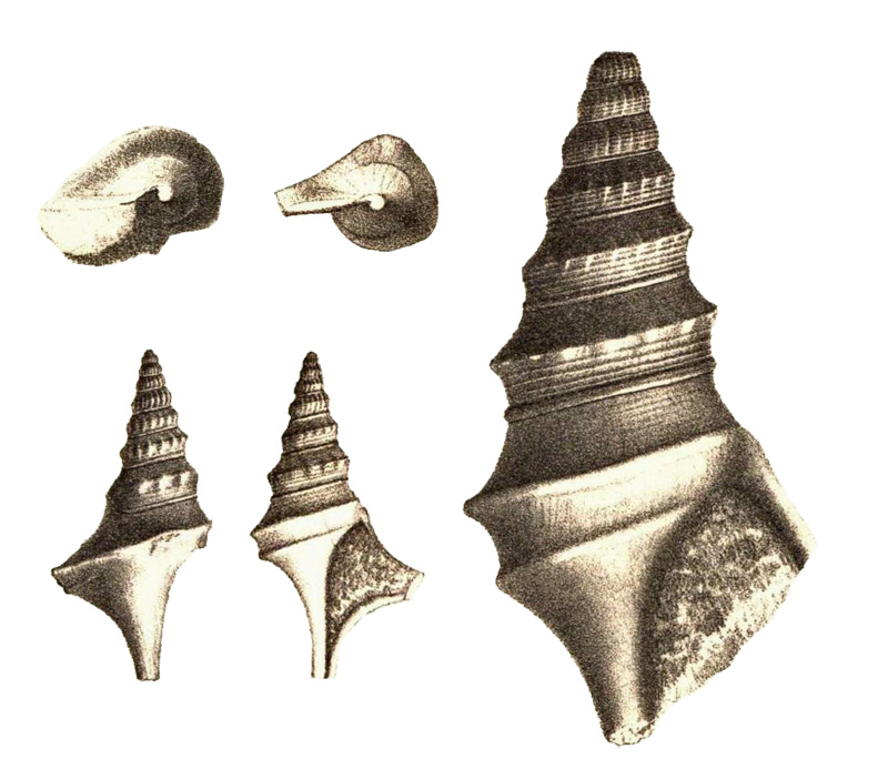 - "Coquille turriculée, allongée, fusiforme, composée de dix ou onze tours convexes, transversalement striés; les premiers sont ornés de côtes longitudinales, au nombre de 18 à 22 sur chacun d'eux; ceux qui viennent ensuite, au lieu de côtes, portent, sur leur carène située vers leur milieu, une série de dentelures ou granules épineux qui, prenant naissance à quelque distance de la suture antérieure, s'accentuent sur la carène et disparaissent sur la partie postérieure des tours, bien avant d'atteindre la suture postérieure; ces dentelures sont au nombre de 12 sur l'avant-dernier tour. Le dernier est bicaréné: la carène antérieure, très-peu marquée, disparaît en atteignant l'aile; la carène postérieure, très-accentuée, porte deux renflements sub-épineux, l'un sur le côté opposé à l'aile, l'autre (dont manquent certains individus), entre l'aile et ce premier renflement. L'expansion aliforme, naissant à la carène de l'avant-dernier tour, est une large digitation triangulaire, longitudinalement striée, qui n'est que le prolongement de la carène postérieure; elle semble s'infléchir vers la pointe de la spire. Ouverture subtriangulaire, très-large. Columelle lisse. Canal assez large, très-légèrement courbé suivant un arc dont le centre serait dans un plan perpendiculaire à celui de l'ouverture. Les échantillons qui m'ont été communiqués ont l'extrémité du canal brisée, en sorte que le sens de la courbure de cette extrémité n'a pu être déterminé. Les filets qui parcourent transversalement la coquille, très-bien marqués sur les premiers tours, s'atténuent sur les derniers et s'effacent presque complètement sur leur partie postérieure; un d'eux reste toujours très-apparent: il accompagne la suture antérieure. Voici leur arrangement sur l'avant-dernier tour: entre la suture postérieure et la carène, il y a quatorze filets très-minces, mais de grosseurs diverses; entre la carène et la suture antérieure, sont un moyen filet, trois minces alternant avec trois gros, trois minces dans une dépression, enfin un très-gros, bordant la suture. Le dernier tour paraît lisse au premier aspect; il est cependant couvert de très-minces filets qui s'enroulent transversalement sur lui: on en remarque 25 de grosseurs irrégulières entre la suture et la carène postérieure; entre les deux carènes, au-dessous d'un renflement épineux, j'en ai compté 10 qui sont à peine visibles, même à la loupe; ils disparaissent dans le voisinage de l'aile. Des filets s'enroulent encore transversalement sur le dessous du dernier tour, mais ils y sont si atténués que les intervalles entre les stries d'accroissement ont plus de relief qu'eux."