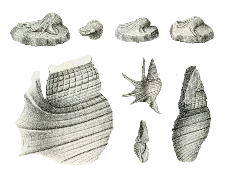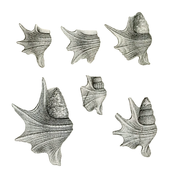 - "Coquille fusiforme, treillissée par de petites côtes longitudinales très-rapprochées et par d'étroites côtes transverses filiformes. Spire composée de neuf tours arrondis. Le dernier sur lequel les côtes longitudinales s'effacent est quadricaréné; la carène antérieure est peu prononcée. Il en est de même de la dernière qui touche presque la suture. Aile palmée, se terminant par une expansion de quatre digitations pointues, carénées. La digitation antérieure est large, longue et presque droite. La seconde, qui n'a pas un grand développement chez le jeune, est grande chez l'adulte; elle prend son centre de courbure vers la pointe de la spire. Il en est de même de la troisième qui est plus longue que les trois précédentes. La digitation postérieure se replie d'abord contre la spire, puis se dirige, parallèlement à l'axe, vers la pointe dont elle s'écarte par une courbe légère et qu'elle dépasse. Canal peu allongé, mais large, caréné comme les digitations, à peine recourbé antérieurement. Entre le canal et la digitation antérieure, l'aile bossuée indique la place du sinus destiné à laisser passer la tête de l'animal. Un autre sinus placé entre les deux digitalions postérieures était destiné à donner passage au pied. Les côtes longitudinales sont moins apparentes que les côtes transversales. Leur nombre varie de vingt à trente sur l'avant-dernier tour, et de vingt-cinq à trente-cinq sur le septième. Elles s'effacent dans le voisinage de la suture antérieure. Les filets enroulés transversalement se présentent dans un ordre variable. Ils sont très-effacés sur certains spécimens. Un des types de M. Buvignier en a onze moyens alternant avec onze petits sur l'avant-dernier tour. Sur son dernier tour, on remarque, à partir de la suture, deux minces filets sur une petite rampe, puis une grosse côte donnant naissance à la digitation postérieure. On voit ensuite deux moyens filets alternant avec deux minces, un plus gros aboutissant au milieu du sinus postérieur et un moyen filet entre deux minces. Une seconde grosse côte ou carène donne naissance à une seconde digitation; elle est séparée de la troisième carène par trois gros filets alternant avec trois minces. Viennent ensuite quatre étroits filets alternant avec trois gros, puis une grosse côte donnant naissance à la digitation antérieure et enfin six minces filets alternant avec six gros. On ne peut indiquer les ornements du renflement du sinus ni ceux du canal, parce que ce spécimen est incomplet. Son aile prend son point d'attache sur les trois derniers tours de spire, peut-être même sur les quatre derniers. Les échantillons de Fumel présentent sur leur avant-dernier tour, à partir de la suture postérieure, cinq très-minces filets alternant avec cinq gros, puis trois moyens serrés les uns contre les autres. Sur leur dernier tour, on remarque après la suture deux très-minces filets suivis d'un gros qui donne naissance à la digitation postérieure, puis un gros aboutissant au milleu du sinus postérieur, ayant de chaque côté deux très-minces filets. Vient ensuite la carène qui forme en se prolongeant la seconde digitation. Elle est séparée de la troisième carène par un gros filet placé entre deux moyens. Celle-ci donne naissance à la troisième digitation; on voit ensuite trois moyens filets serrés les uns contre les autres, puis une grosse côte qui forme en se prolongeant la carène antérieure. Trois minces filets alternant avec trois gros aboutissent au feston antérieur de l'aile. Trois moyens serrés les uns contre les autres se rendent sur le sinus. L'état de conservation des échantillons ne permet pas d'indiquer le nombre de ceux qui ornent le canal."
