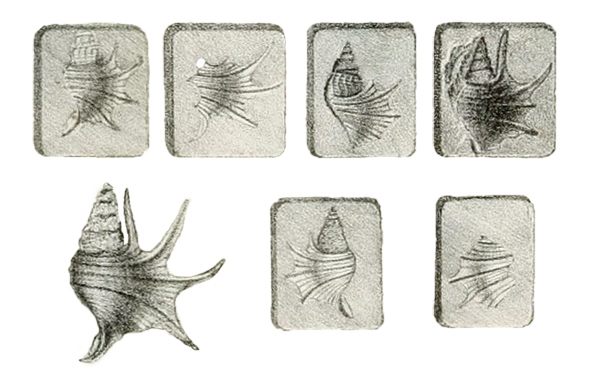 - "Testâ fusiformi; costellis tenuibus, longitudinalibus et transversis decussatâ; anfractibus rotundatis; ultimo expanso, pentadactylo, transverse costellato, obsolete quadricarinato; carinis duabus medianis eminentioribus; carinâ posticâ fere suturali."