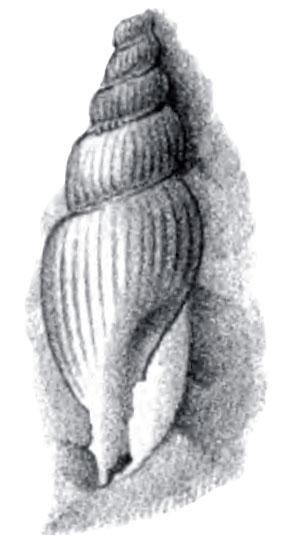 - "Testa fusiforme turrita, anfractibus 6 convexiusculis, obsolete plicatis, labro bidentato, canali brevi acutirostri."
