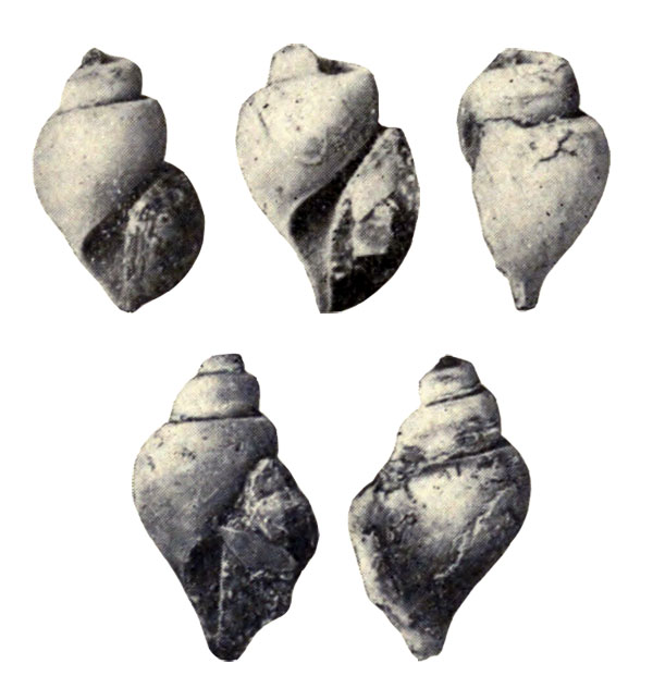 - "Shell small and comparatively short for a species of the genus; spire short, the apical angle being about 45° in some specimens, and in other individuals rather less; volutions convex, four or five in number, only four in the casts ; sutures deeply marked, indicating a comparatively thick shell ; body volution large, half as long as the entire length of the cast, or sometimes three-fifths of the entire length; base of the body volution extended in front; aperture equaling one-half the length of the cast; elongate elliptical in outline, acute at the upper angle and the margin extending above the line of the suture where the lip has extended upon the preceding volution; lower margin of the aperture prolonged and narrow; outer margin more convex than the inner; columellar cavity rather large, indicating a strong and thickened columella, which has been smooth and without any indications of folds or markings; surface of the volutions marked by distant but not very strong vertical folds, which are only seen on the internal cast upon careful examination ; surface of the shell and features of the lip and posterior canal unknown."