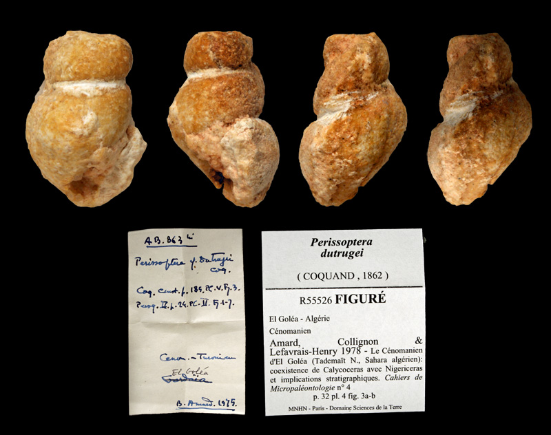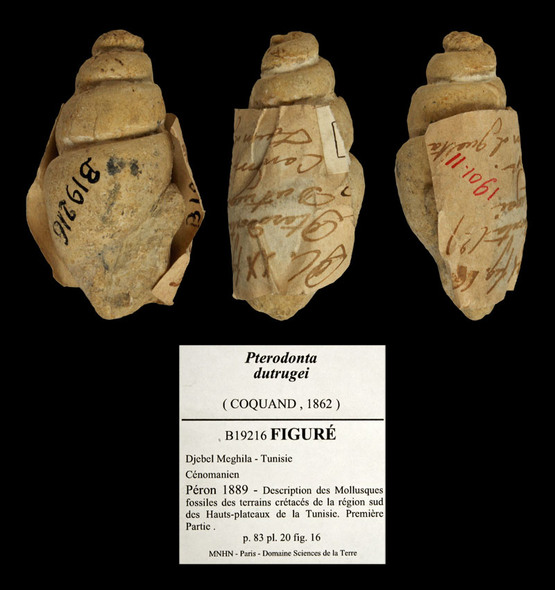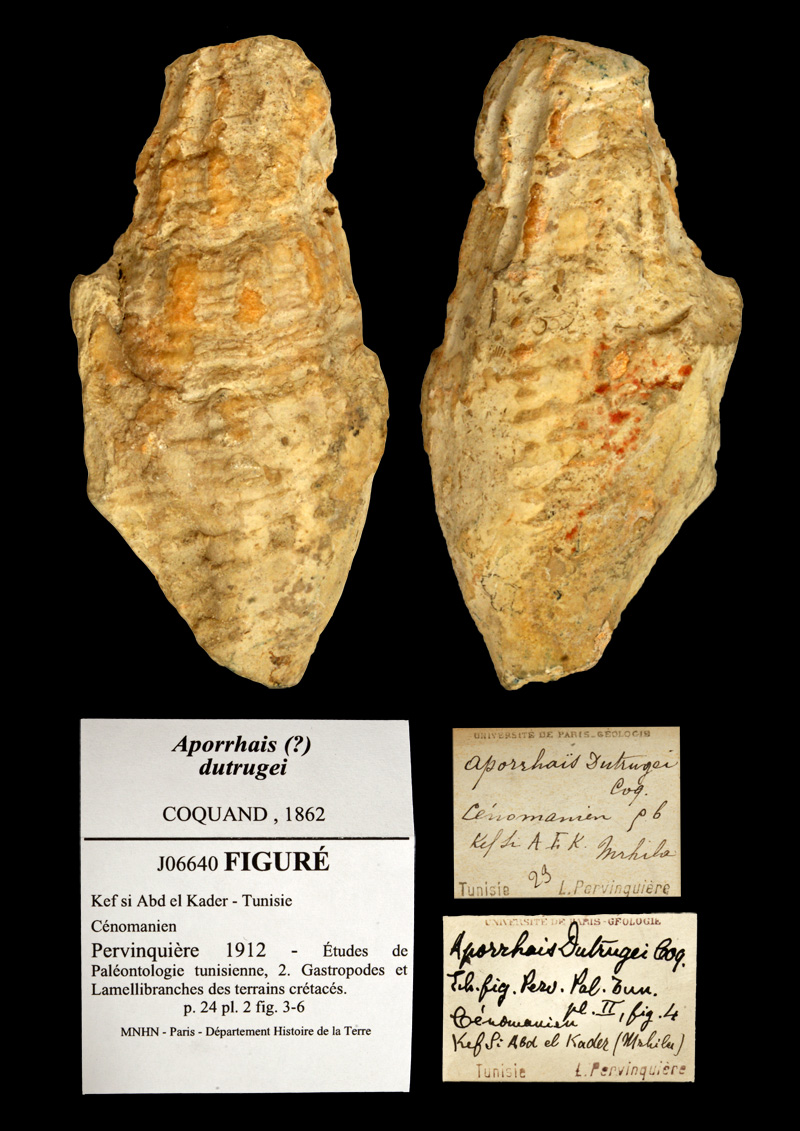 History and Synonymy 1889 ![]() Pterodonta dutrugei in Thomas & Peron, 1889, pl. XX, fig. 15, 16 ![]() Pterodonta dutrugei Coquand, 1862; Cenomanian, Cretaceous; Bou Saada, M'Sila Province, Algeria; 60 mm; Coll. MNHN no. J06708; Copyright Museum national d'Histoire naturelle Paris ![]() Pterodonta dutrugei Coquand, 1862; Cenomanian, Cretaceous; Djebel Meghila, Sidi Bouzid Governorate, Tunesia; 42 mm; Coll. MNHN no. B19216; Copyright Museum national d'Histoire naturelle Paris 1912 ![]() Aporrhais (?) dutrugei in Pervinquière, 1912, pl. II, fig. 1-7 ![]() Aporrhais (?) dutrugei Coquand, 1862; Cenomanian, Cretaceous; Aïn bou Rhenem, Tunesia; 55 mm; Coll. MNHN no. J06638; Copyright Museum national d'Histoire naturelle Paris ![]() Aporrhais (?) dutrugei Coquand, 1862; Cenomanian, Cretaceous; Kef si Abd el Kader, Tunesia; 47 mm; Coll. MNHN no. J06641; Copyright Museum national d'Histoire naturelle Paris ![]() Aporrhais (?) dutrugei Coquand, 1862; Cenomanian, Cretaceous; Kef si Abd el Kader, Tunesia; 43 mm; Coll. MNHN no. J06640; Copyright Museum national d'Histoire naturelle Paris ![]() Aporrhais (?) dutrugei Coquand, 1862; Cenomanian, Cretaceous; Kef si Abd el Kader, Tunesia; 54 mm; Coll. MNHN no. J06640; Copyright Museum national d'Histoire naturelle Paris ![]() Aporrhais (?) dutrugei Coquand, 1862; Cenomanian, Cretaceous; Kef si Abd el Kader, Tunesia; Coll. MNHN no. J06640; Copyright Museum national d'Histoire naturelle Paris ![]() Aporrhais (?) dutrugei Coquand, 1862; Cenomanian, Cretaceous; Foum el Guelta, Tunesia; 52 mm; Coll. MNHN no. J06640; Copyright Museum national d'Histoire naturelle Paris ![]() Aporrhais (?) dutrugei Coquand, 1862; Cenomanian, Cretaceous; Aïn bou Rhenem, Tunesia; 53 mm; Coll. MNHN no. J06641; Copyright Museum national d'Histoire naturelle Paris 1974 ![]() Pterodonticeras dutrugei Coquand, 1862; Maastrichtian, Cretaceous; Sanhirer, Tunesia; 51 mm; Coll. MNHN no. R54084; Copyright Museum national d'Histoire naturelle Paris ![]() Pterodonticeras dutrugei Coquand, 1862; Maastrichtian, Cretaceous; Touil er Rhnem, Tunesia; 53 mm; Coll. MNHN no. R54085; Copyright Museum national d'Histoire naturelle Paris 1978 ![]() Perissoptera dutrugei (Coquand, 1862); Cenomanian, Cretaceous; El Ménia (formerly El Goléa), El Ménia District, Ghardaïa Province, Algeria; 25 mm.; Coll. MNHN no. R55526; Copyright Museum national d'Histoire naturelle Paris References: |