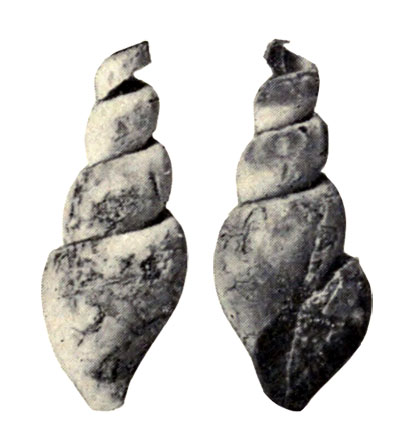 - "Shell small, slender and fusiform; spire elevated and slender, the apical angle being about 20° or 25°; volutions slender, slightly convex on their exposed surfaces ; four only preserved in the cast, but there have been four or five more above, making eight or more in all; body volution greatly prolonged in front, forming a long slender beak with a proportionally strong axis, leaving quite a good-sized axial cavity in the cast; aperture long and narrow, pointed above and below, the upper canal being extended upon the preceding volutions to an unknown extent; volutions marked by numerous, closely-arranged, vertical folds, 12 or more to the whorl."