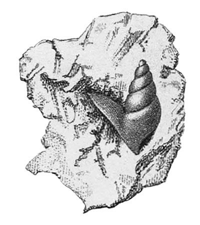 - "Ohne Flügel erscheint das Gehäuse einer Paludina nicht unähnlich; es besteht aus 5-6 drehrunden, flach gewölbten Windungen. Die unterste derselben ist etwas aufgetrieben und fast so lang, wie das übrige Gewinde. Der Flügel ist so wie das ganze Petrefact glatt, breiter, als der ganze Umgang. Von der Spitze des Kanales geht derselbe in einem spitzen Winkel bis zur Höhe der zweiten Windung, wo er sich dann an dieselbe anlehnt. Wir fanden bis jetzt nur Ein Exemplar am Lusberg."