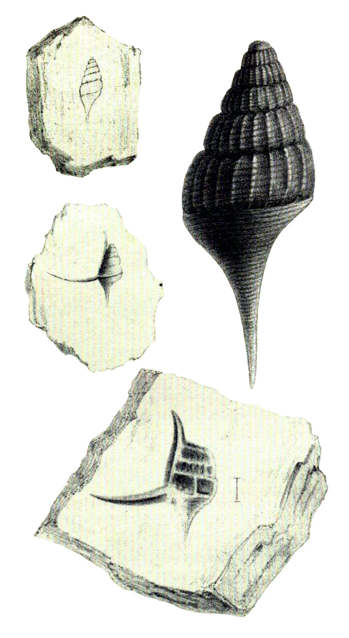 Rostellaria subulata Reuss, 1844 Original Description of Rostellaria subulata by Reuss, 1844, p. 203: "6 — 7 Linien lang, niedrig thunnförmig mit 5 bauchigen Windungen, von denen die letzte dem übrigen Gewinde an Höhe gleichkömmt. Die obern nehmen schnell an Höhe ab, so dass das ganze Gehäuse, das mit Hehr stumpfer Spitze endet, kurz und gedrängt erscheint. Die Oberfläche der Windungen hat niedrige, aber scharfe Längsrippen (die letzte Windung beiläufig 20 — 21) und feine gedrängte regelmässige Querlinien. Auf der untern Windung etwas oberhalb der Mitte ein scharfer Kiel, der sich in den Flügel fortsetzt. Dieser besteht aus zwei sehr schmalen linienförmigen gekielten Fingern, die die Länge des ganzen Gehäuses erreichen. Der eine steigt, mit dem Gewinde verwachsen, senkrecht empor und setzt noch über die Spitze desselben fort; der andere geht, im rechten Winkel mit dem ersten, gerade aus und endet, etwas gebogen, wie der obere, mit langer sehr scharfer Spitze. Der Kanal sehr dünn und spitz." Localities: "Nicht selten, aber fast stets des sehr gebrechlichen Flügels beraubt, im Plänermergel von Priesen (Brezno, Czech Republic), selten in dem von Wollenitz und Luschitz (Lužice, Most District, Czech Republic)." Stratum typicum: "Plänermergel von Priesen", Coniacian, Cretaceous of Brezno (formerly Priesen), Ústí nad Labem Region, Czech Republic History and Synonymy 1846 ![]() Rostellaria subulata Reuss, 1846, pl. IX, fig. 8