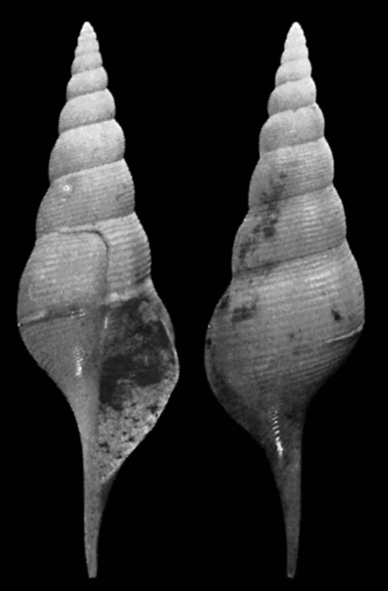 - "Shell large, thin, conical, with convex whorls. Nuclear whorls smooth, rounded, not separated from the spire. On the older whorls occur indistinct axial depressions, looking somewhat like lines of growth, which on the younger whorls are not visible any through the spiral sculpture. On the third whorl a spiral groove comes into being close to the forward suture. Gradually more spirals are added beginning in front. On the sixth whorl the whole surface of the whorl is covered by 13 flat spirals, separated by equal grooves. The suture is rather shallow, because the whorls are little depressed behind. The two hindmost spirals are narrower than the others. The grooves are packed with fine axial filae, which form concave lines. On the penultimate whorl the foremost spiral is covered by the last whorl, so that there remain only 12 spirals. After the varix on this whorl there is added however a spiral behind; while between the three foremost spirals a secondary one is present. The base of the ultimate whorl is decorated in the same way as the spire. Twenty-three spirals are present, which are narrower and get more so towards the front while at last, near and on the canal they are reduced to mere lines. The interspiral axial filae become weaker too forward, to fade away before the canal is reached. On the ultimate whorl a broad, rounded, not very prominent varix is present, with a shallow depression in front. Here a fine line indicates the edge of the aperture, which was only very little curved forward below the middle, while it was curved inward at the beginning of the canal. Two more varices occur, one on eachof the preceding whorls. As no adult specimens are present, little can be said of the aperture. It will have been rather narrow ovate, and the canal a little twisted in front.